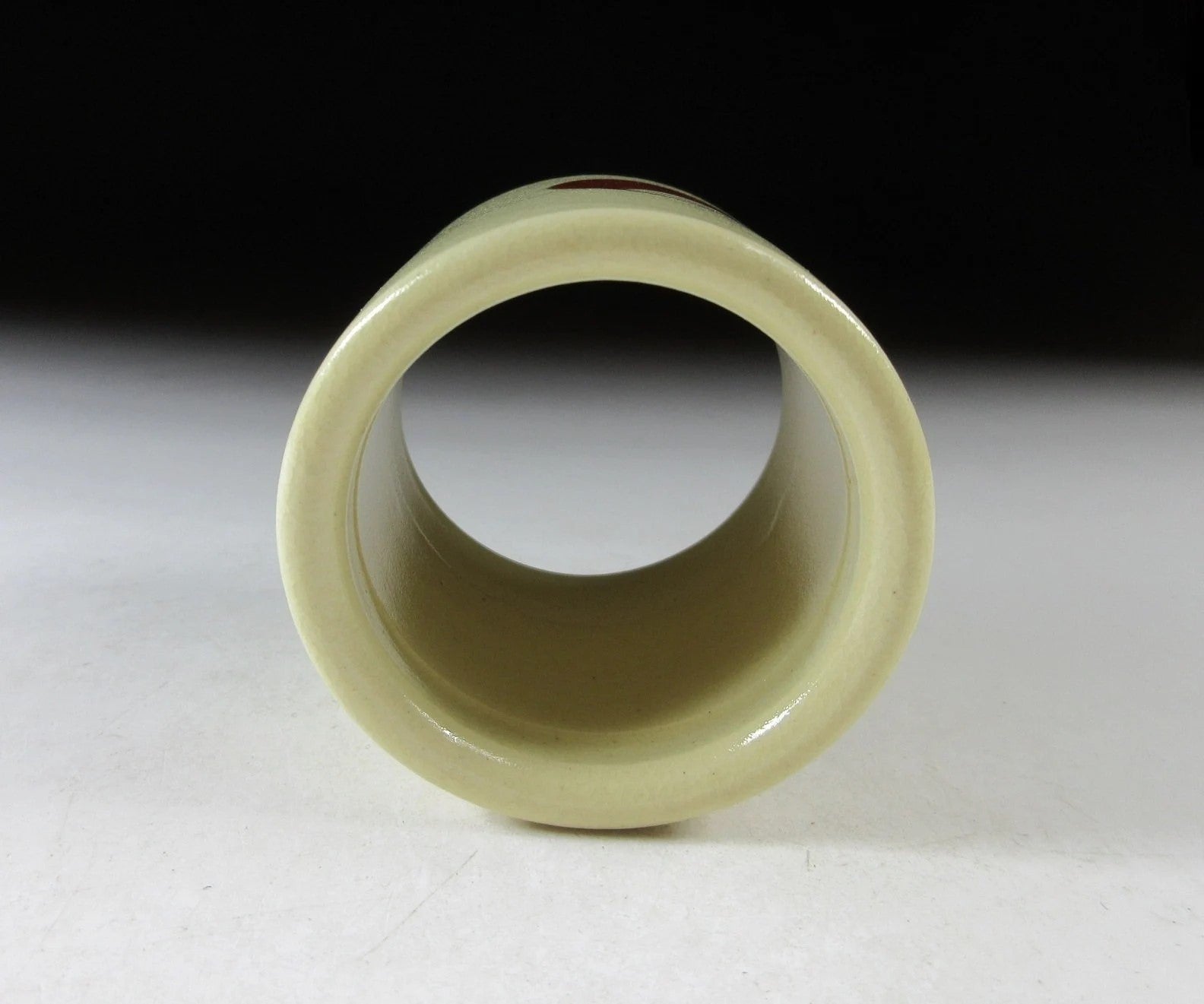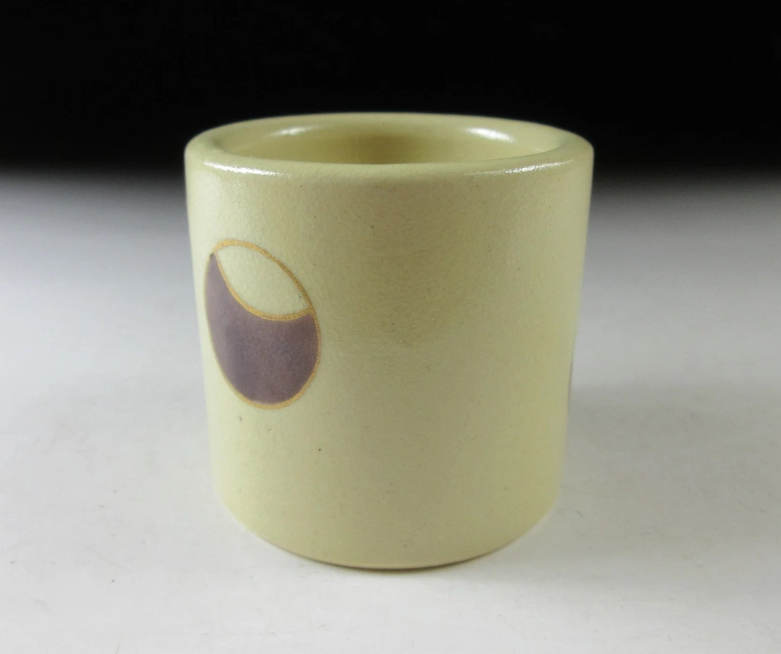 This listing is for a Kyo-ware futaoki made around 20 years ago. A futaoki functions as a lid rest during the tea ceremony. The lid of the kama is placed on the futaoki when hot water needs to be drawn from the kettle. The bamboo water ladle rests there up until the lid of the kama is removed. The futaoki featured in this listing is decorated with a traditional Urasenke 'tsubo-tsubo' pattern, and is wheel-thrown using stoneware clay.