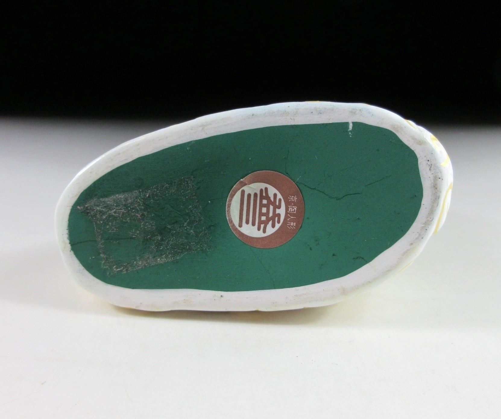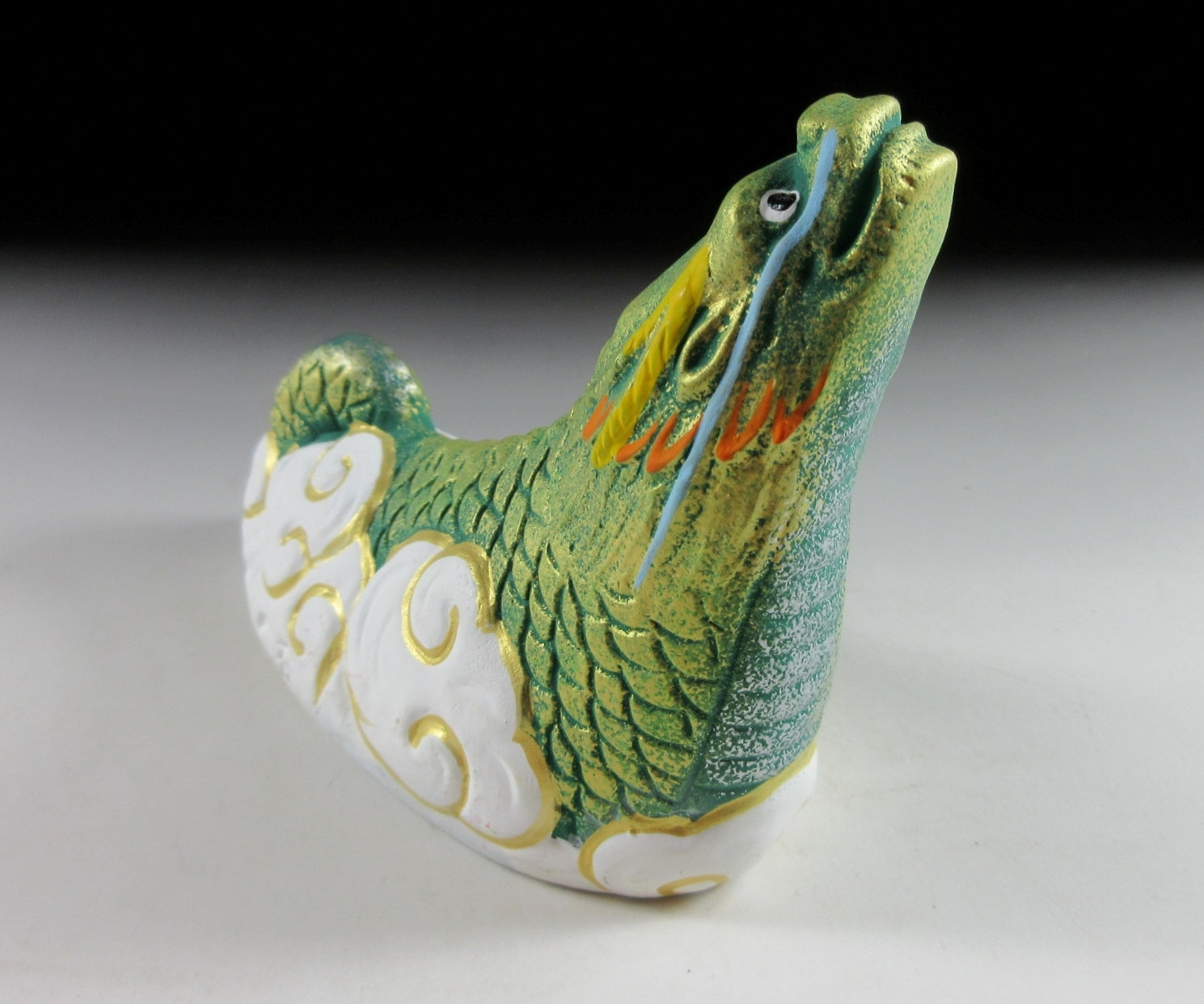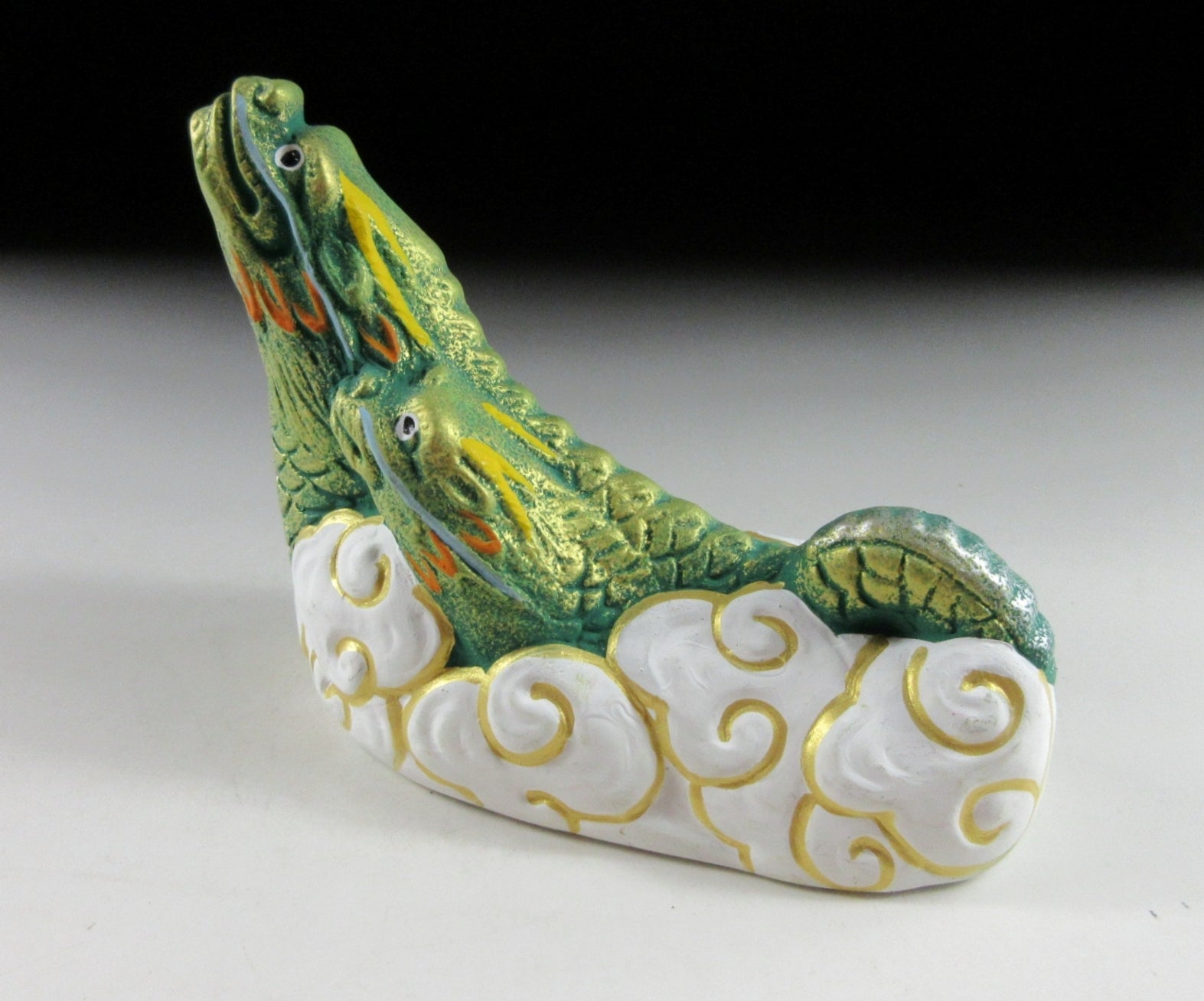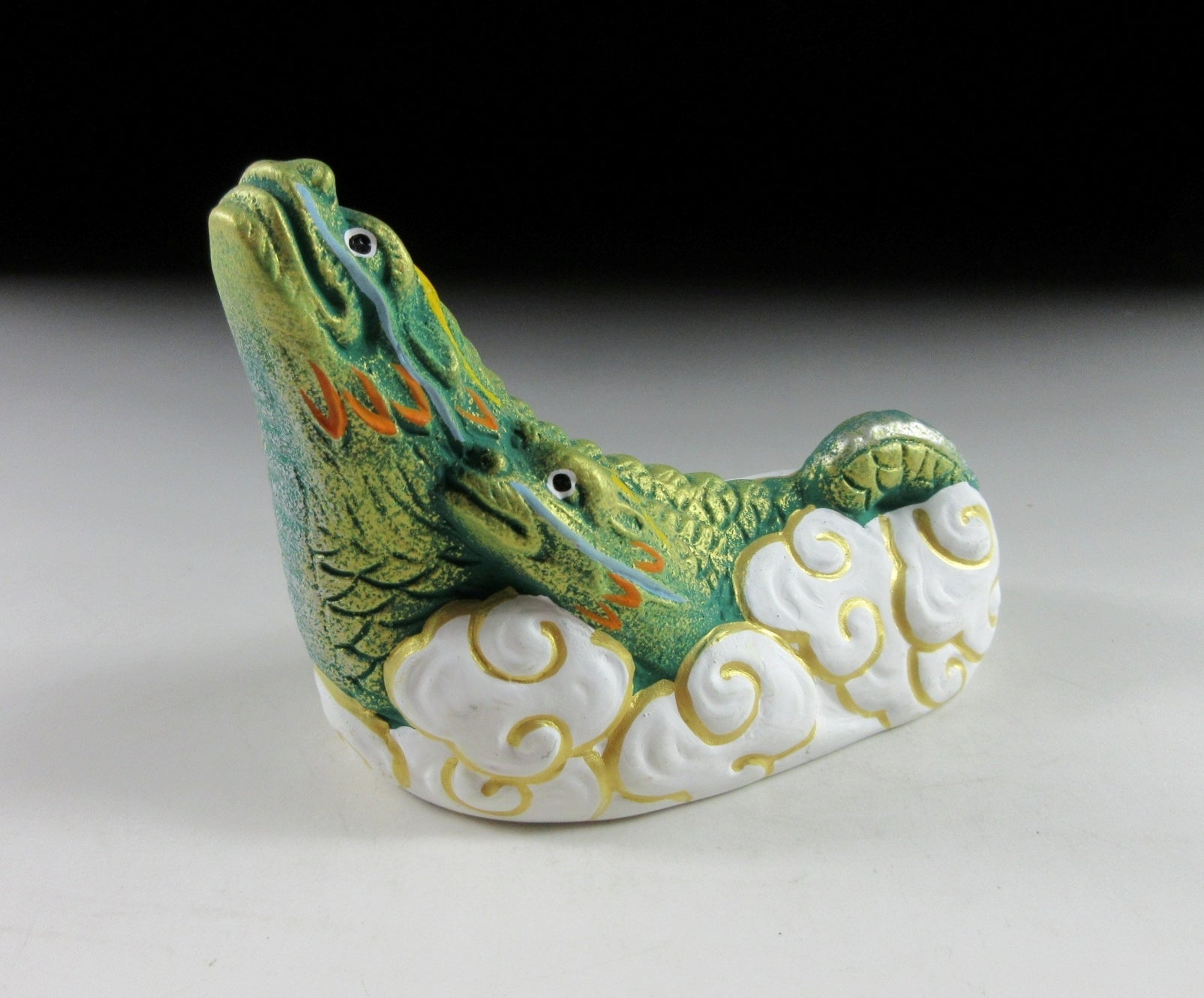 This listing is for a small Kyo-ware ‘unryu’ cloud dragon okimono made around 24 years ago. An unryu is a dragon ascending to heaven on a cloud. There is a legend dating back to the year 596 related to Asuka temple in Nara. During its dedication ceremony, it is said that a purple cloud descended from heaven and took the form of a dragon. There are also several Buddhist temples around Japan that have majestic unryu painted on their ceilings. The cloud dragons in this listing were most likely made to commemorate the Year of the Dragon back in the year 2000. The seal on the bottom reads as ‘Kyo ningyo’.