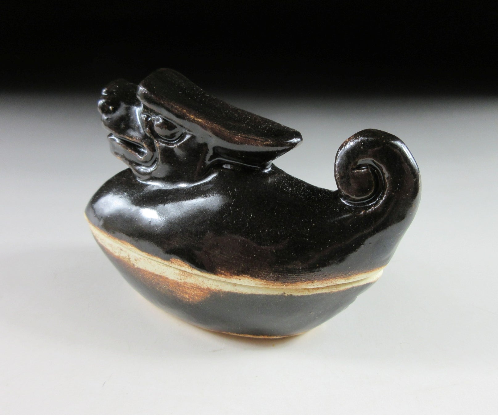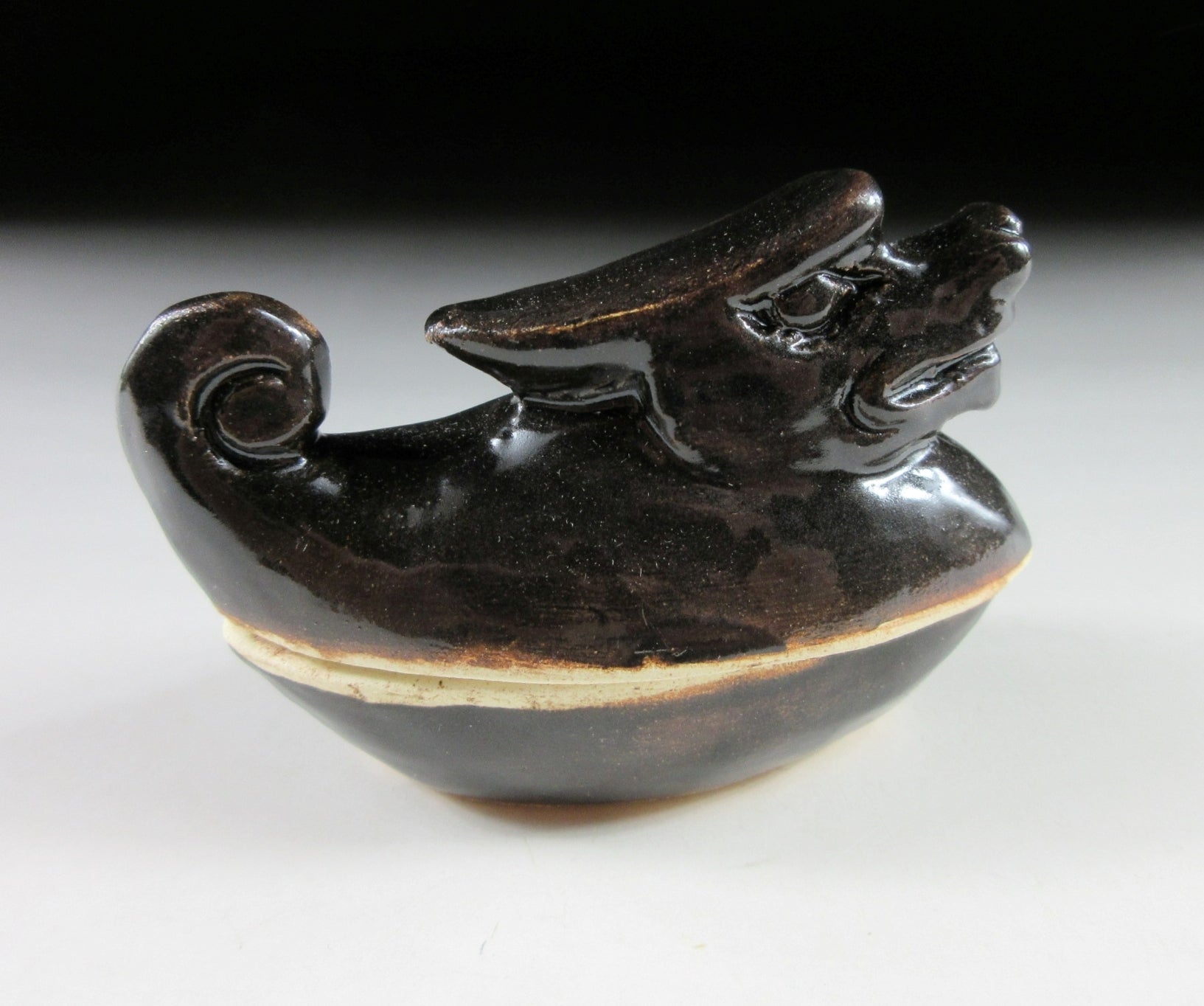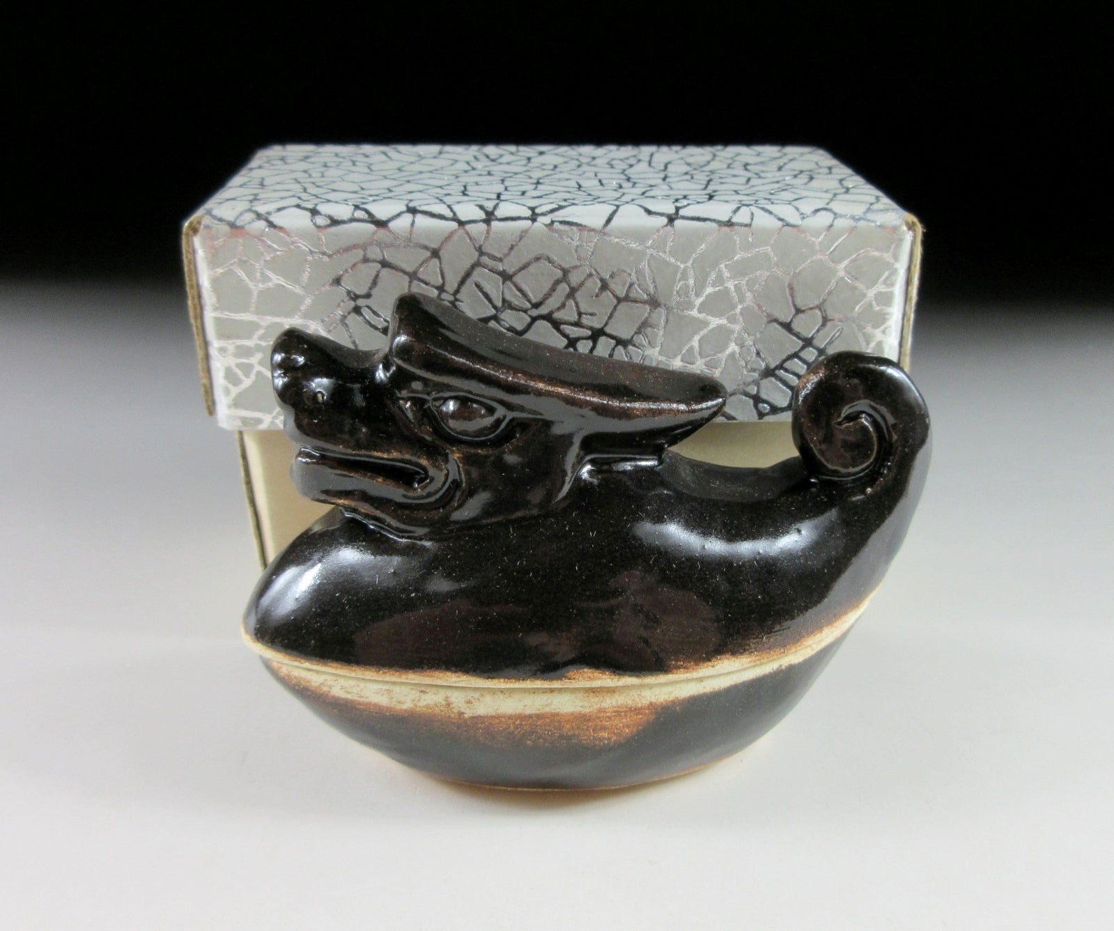 This listing is for a Kyo-ware kogo made around 35 years ago. It is made of high-fired stoneware and moulded to resemble a dragon. This piece was most likely made to commemorate the Year of the Dragon back in 1988. Its size and shape is suitable for holding both woodchip and kneaded incense, although pottery kogo are typically used for kneaded incense during the cooler months. The stamp of the kiln/potter can be found on the front, and it comes with its original paper storage box.