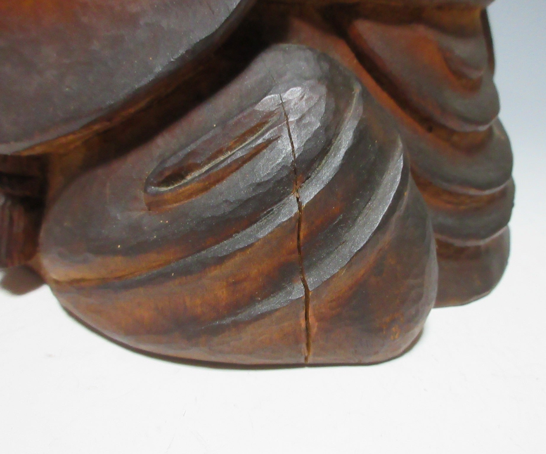 It’s in very good condition aside from some very minor surface wear, some small splits in the wood on his head, and a larger split in his cloth sack.