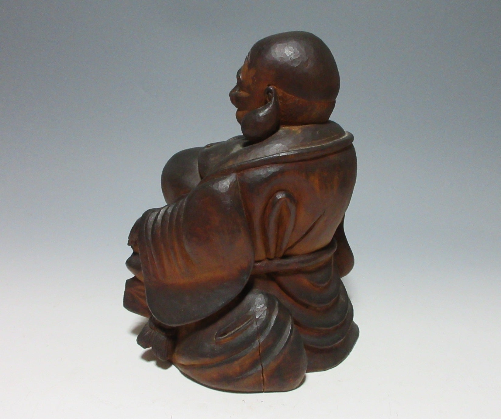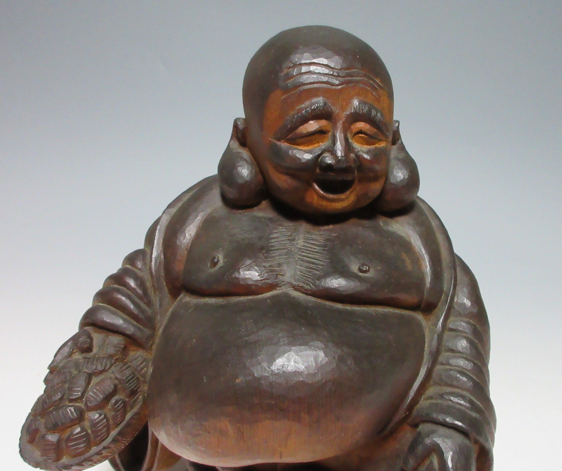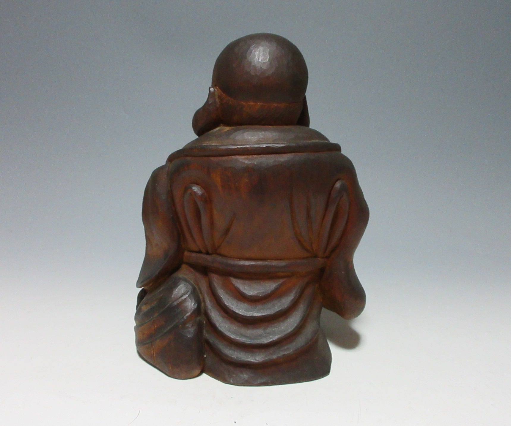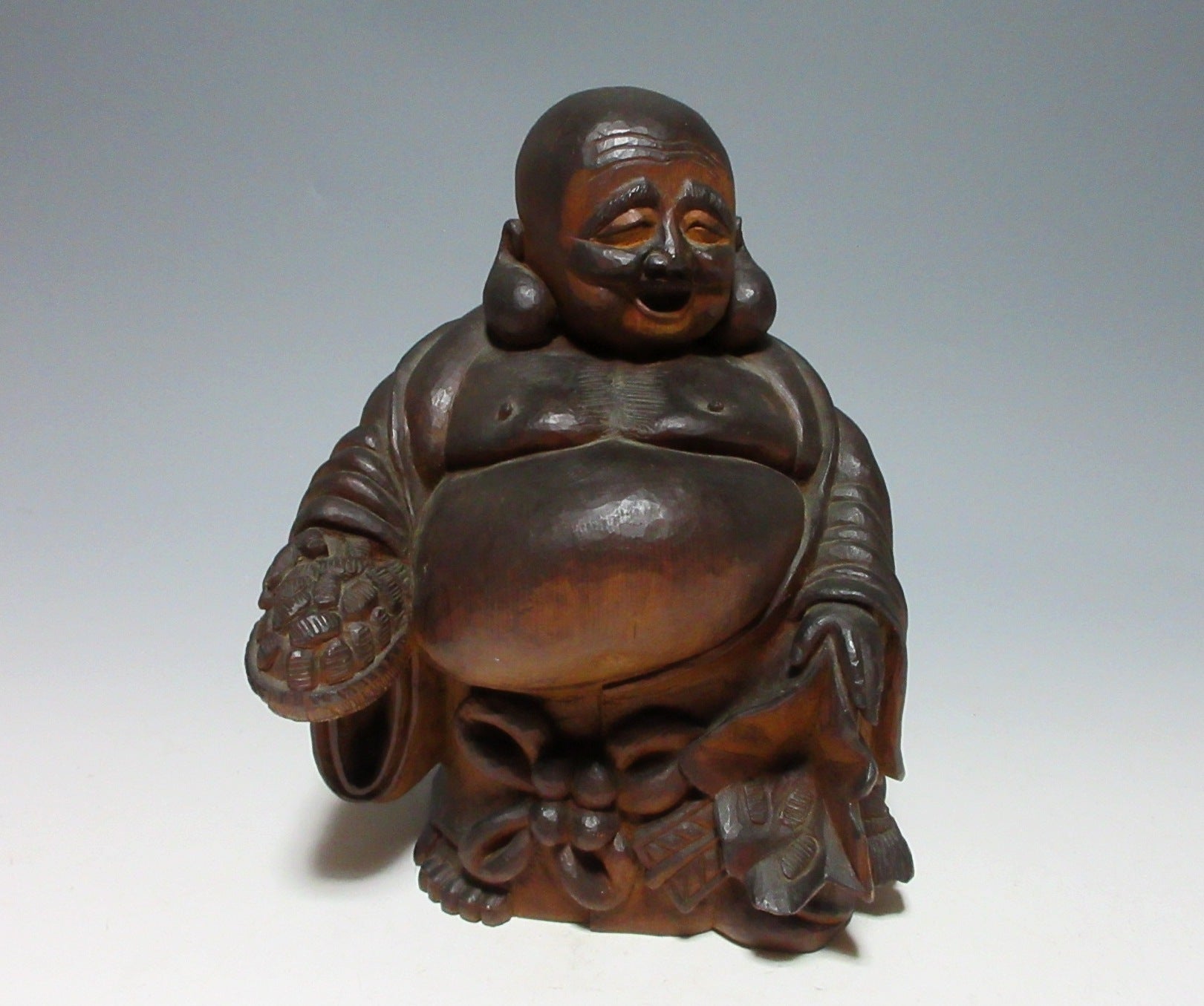 This listing is for a reasonably large Hotei kibori okimono made about 70-80 years ago. Hotei is one of the ‘shichifukujin’ seven gods of fortune. He is commonly depicted as bald, smiling, with a big belly, bulging ears, and a large sack slung over his shoulder. The Hotei in this listing is carved from a single block of wood and has a natural unpainted finish. He has a sack of coins in his left hand, and he’s holding a basket of coins in his other hand. Please note that this item is rather heavy, please inquire about faster shipping if interested.