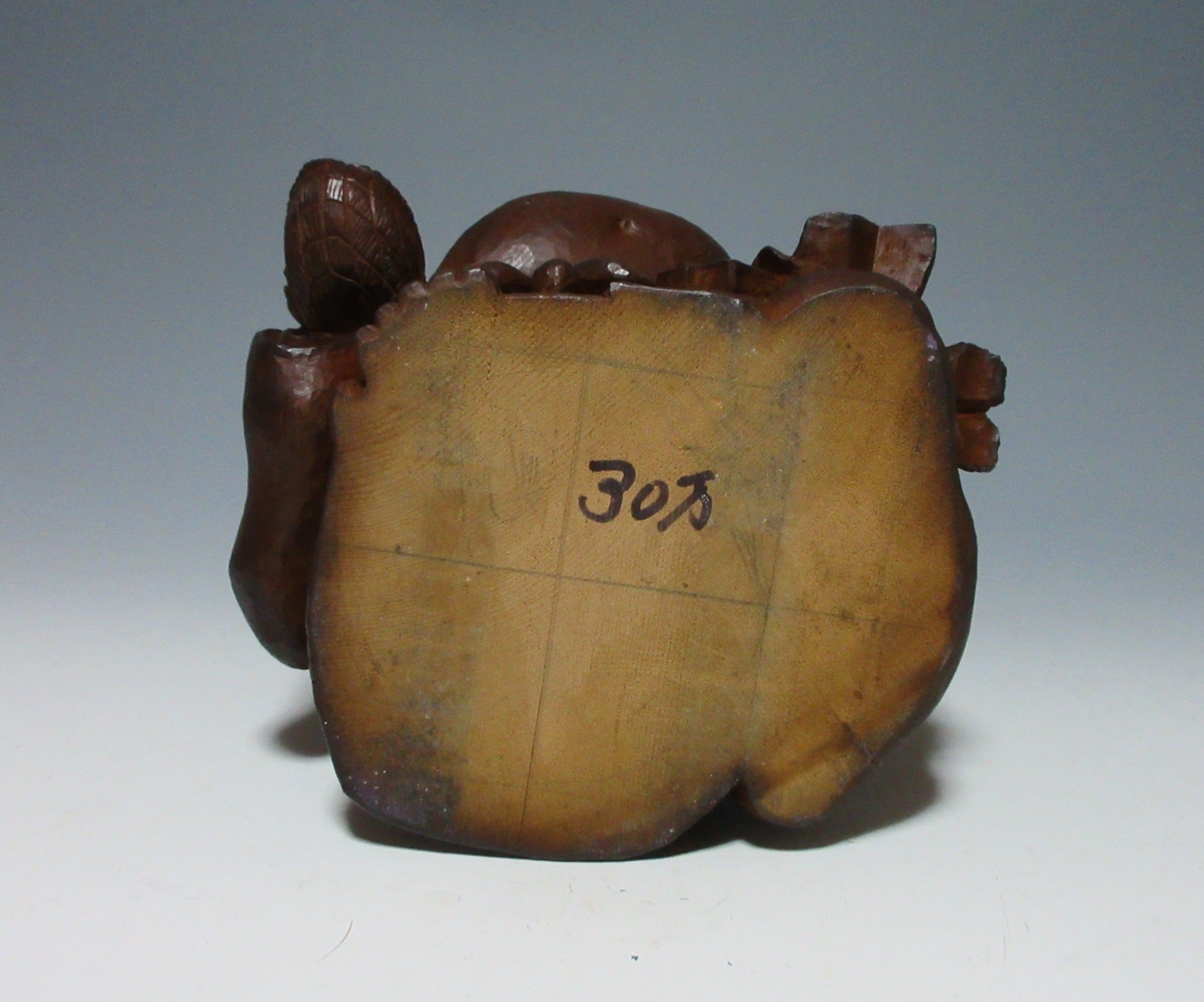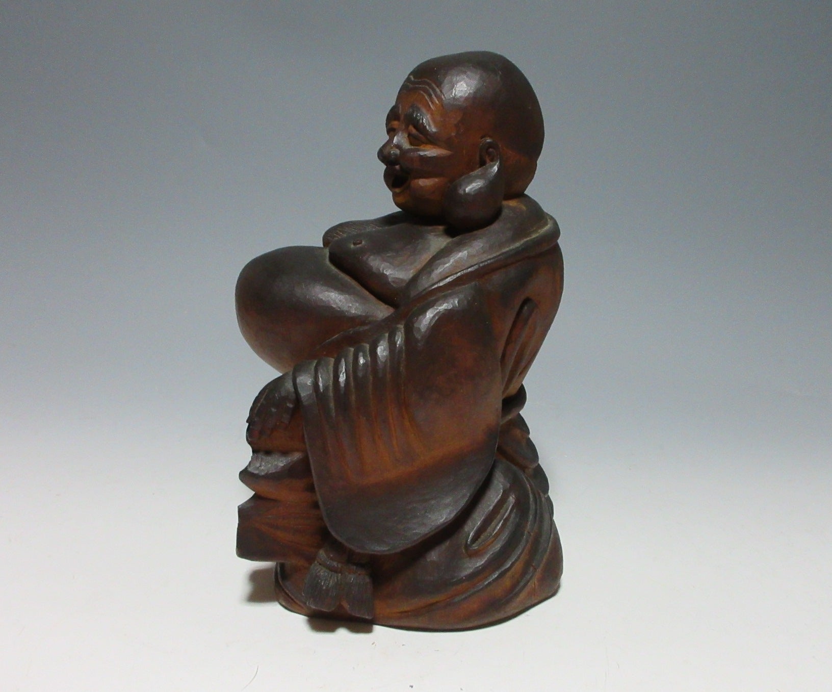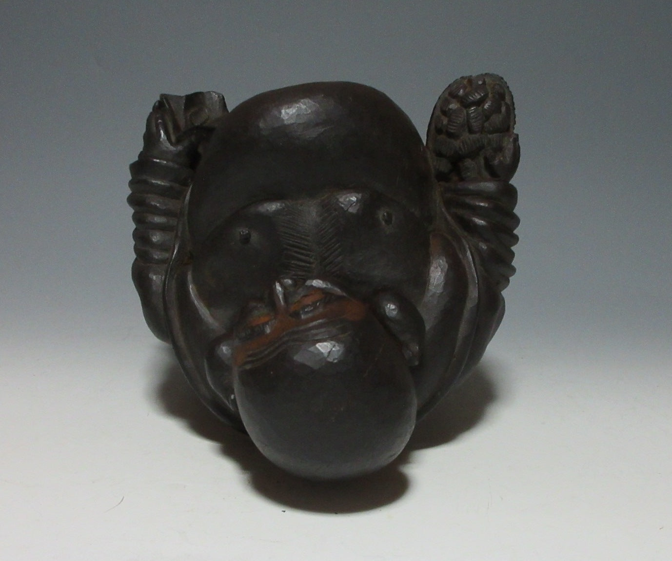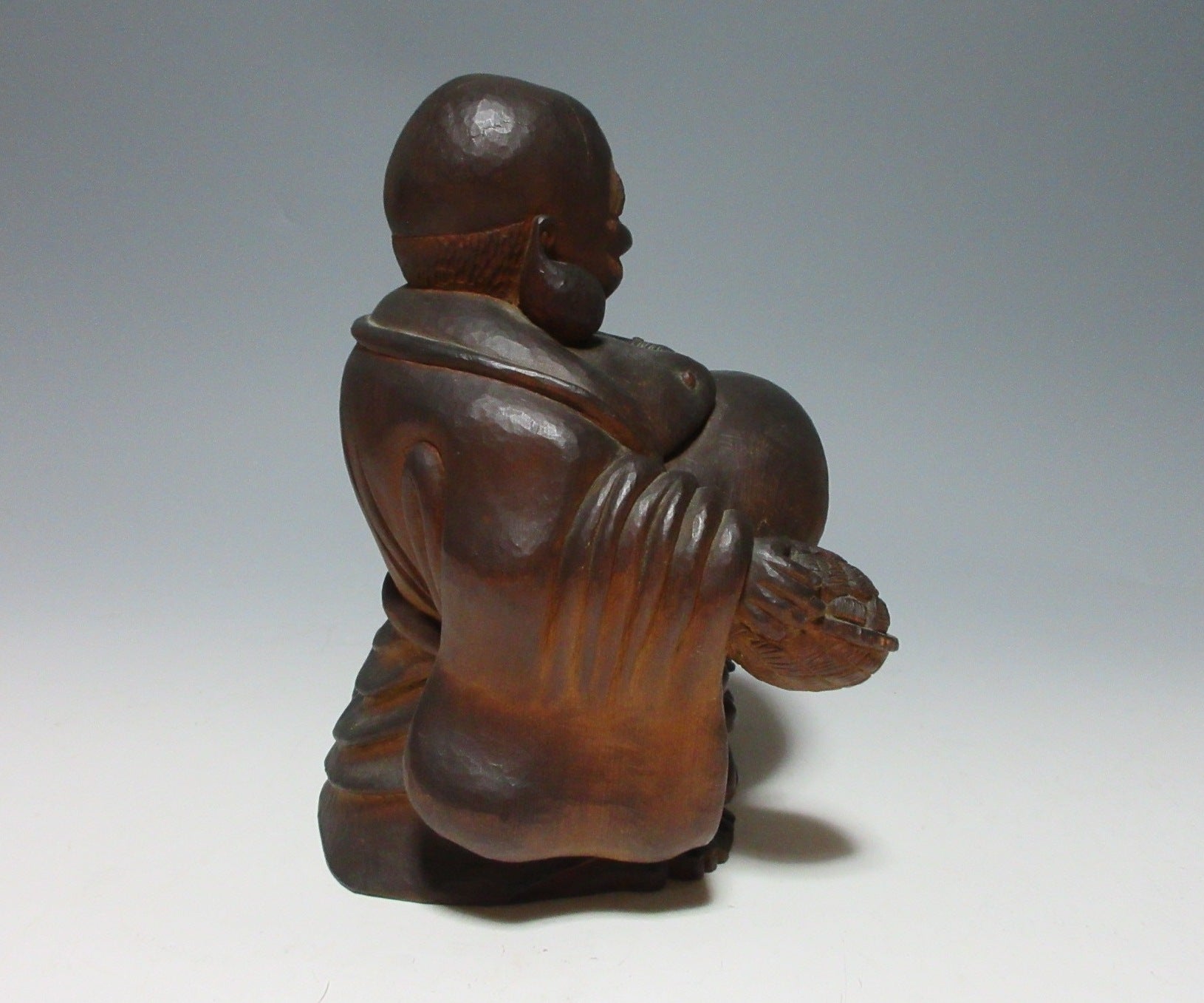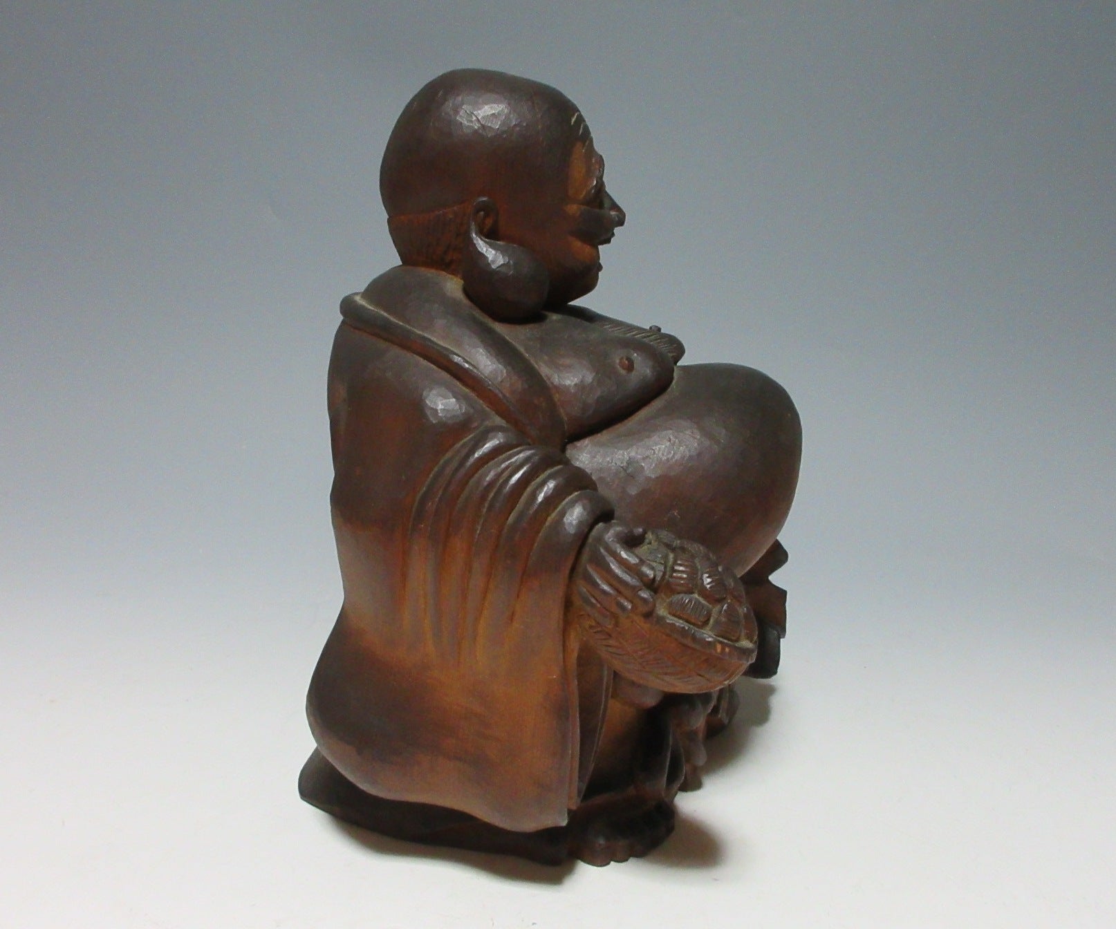 This listing is for a reasonably large Hotei kibori okimono made about 70-80 years ago. Hotei is one of the ‘shichifukujin’ seven gods of fortune. He is commonly depicted as bald, smiling, with a big belly, bulging ears, and a large sack slung over his shoulder. The Hotei in this listing is carved from a single block of wood and has a natural unpainted finish. He has a sack of coins in his left hand, and he’s holding a basket of coins in his other hand. Please note that this item is rather heavy, please inquire about faster shipping if interested.