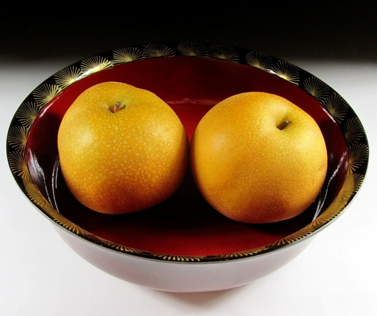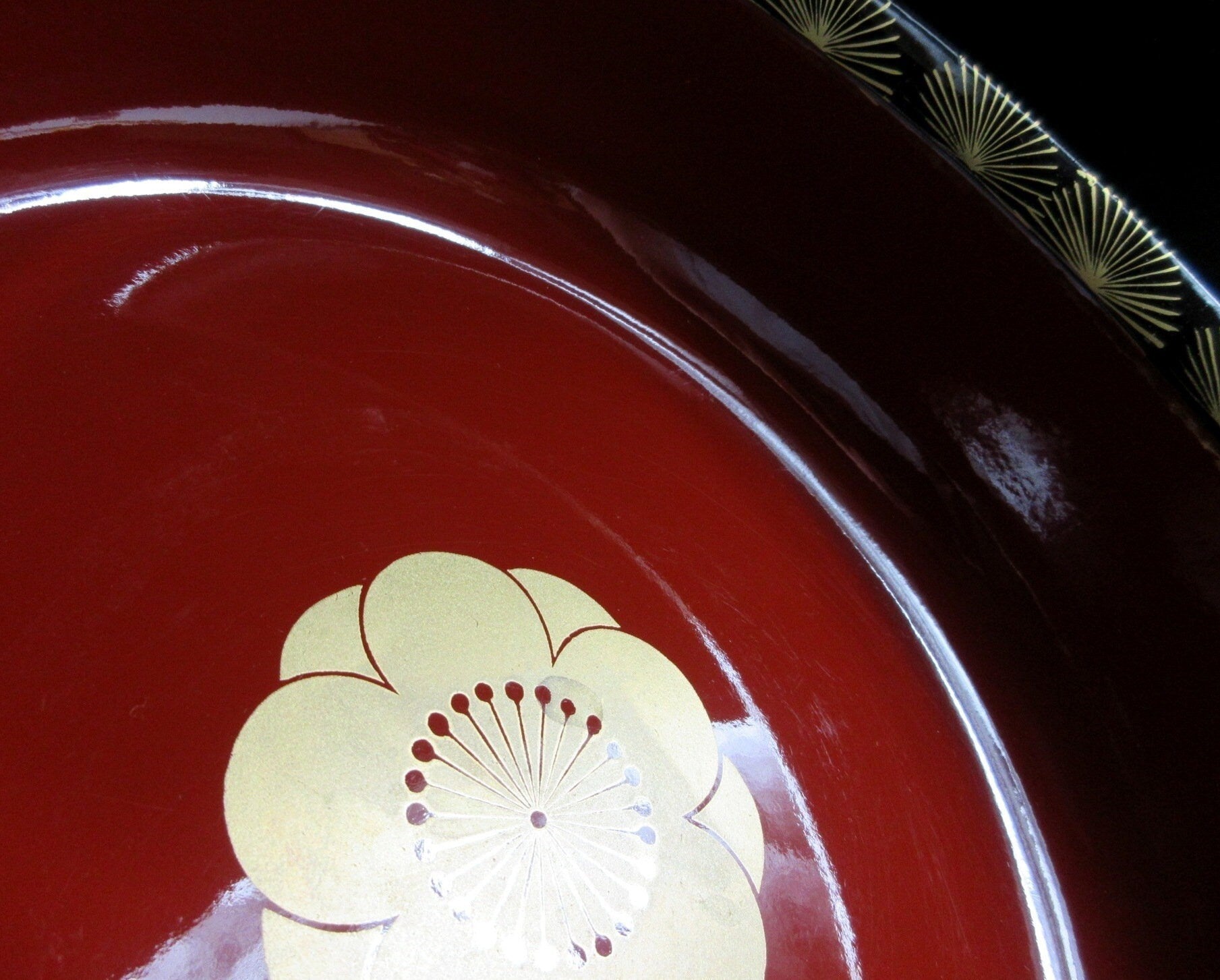 This listing is for a reasonably large imitation lacquerware bowl made around 20 years ago. It is made of resin and wood powder and the interior is red with a black and gold band around the rim. The pattern on the band consists of thin gold lines arranged like a fan, and the exterior has a wood grain finish. This piece is a nice size and ideal for outdoor entertaining, perfect for barbecues and picnics without the worry of getting scratches etc.
