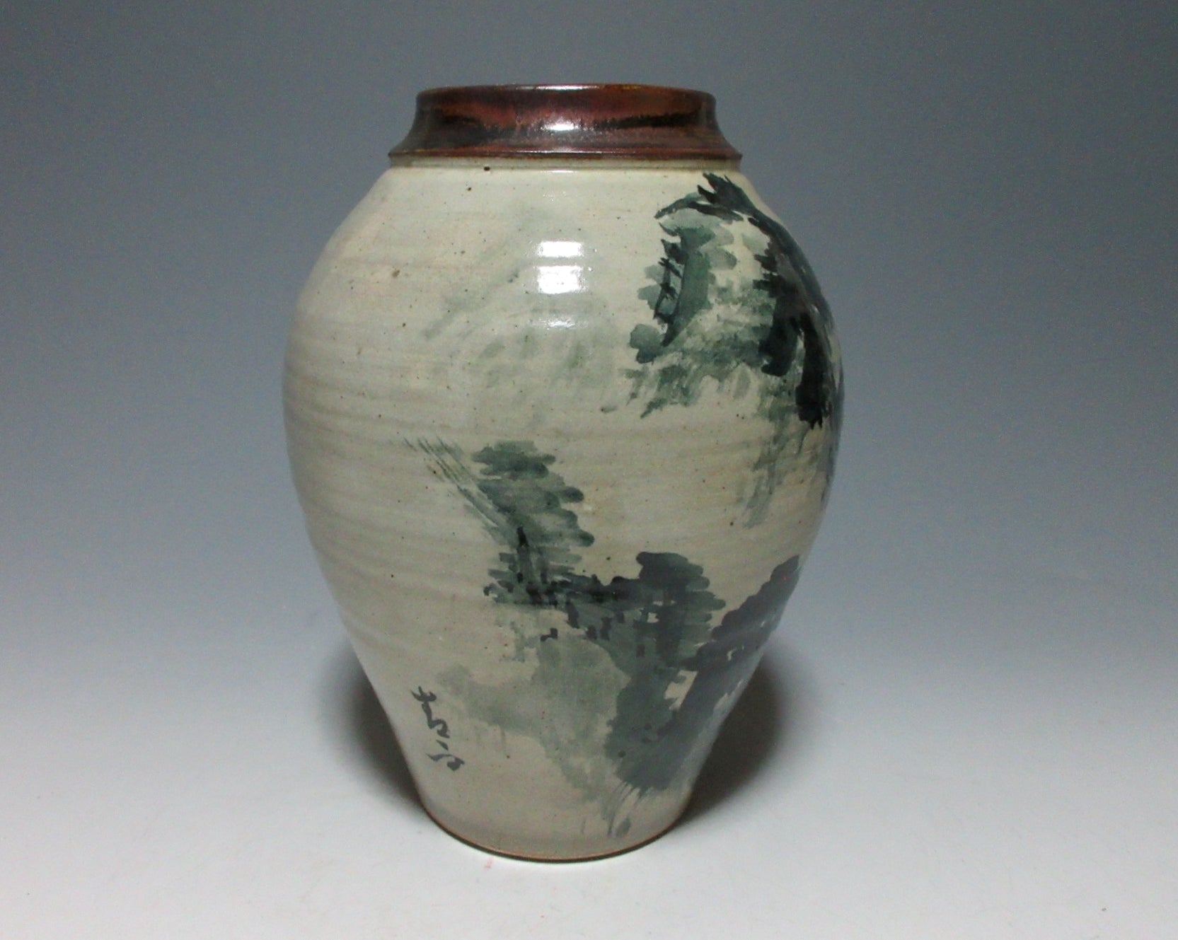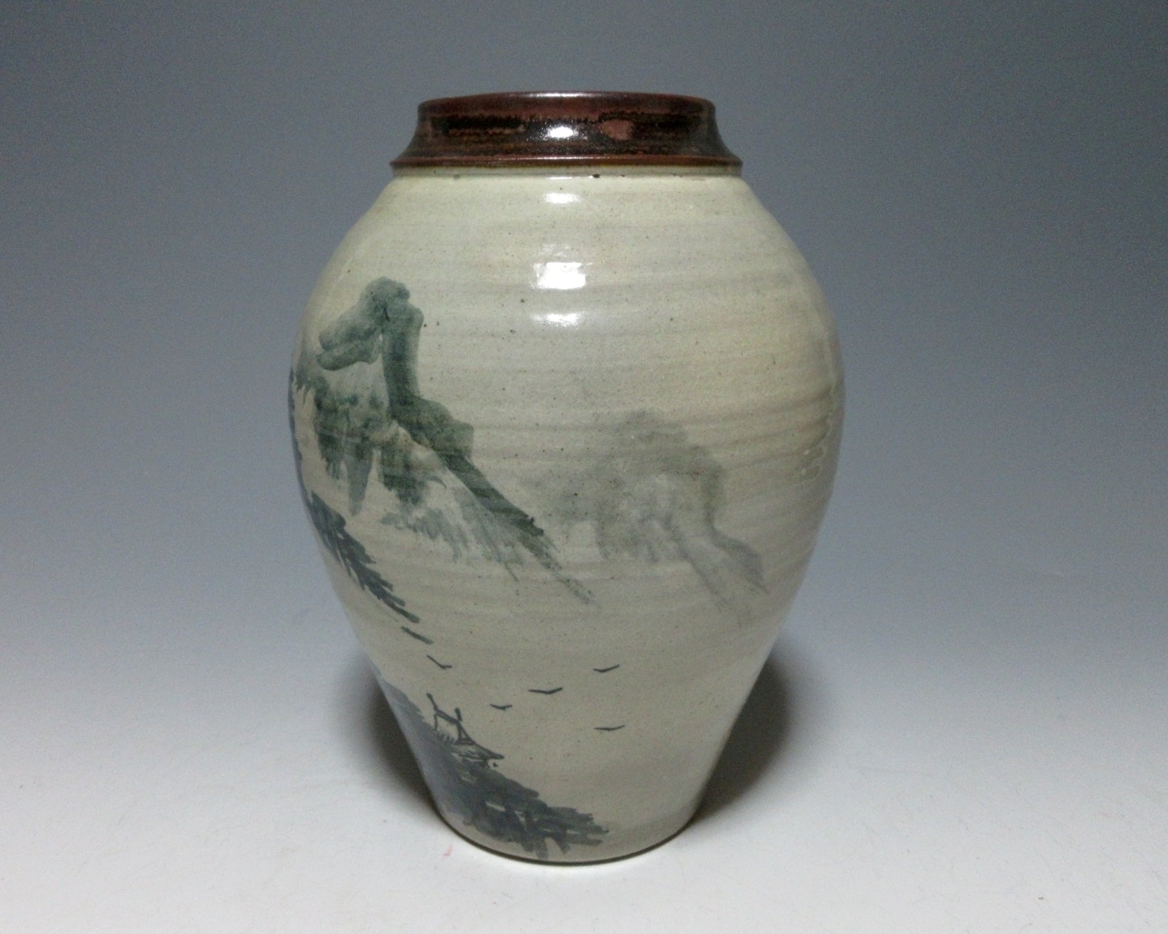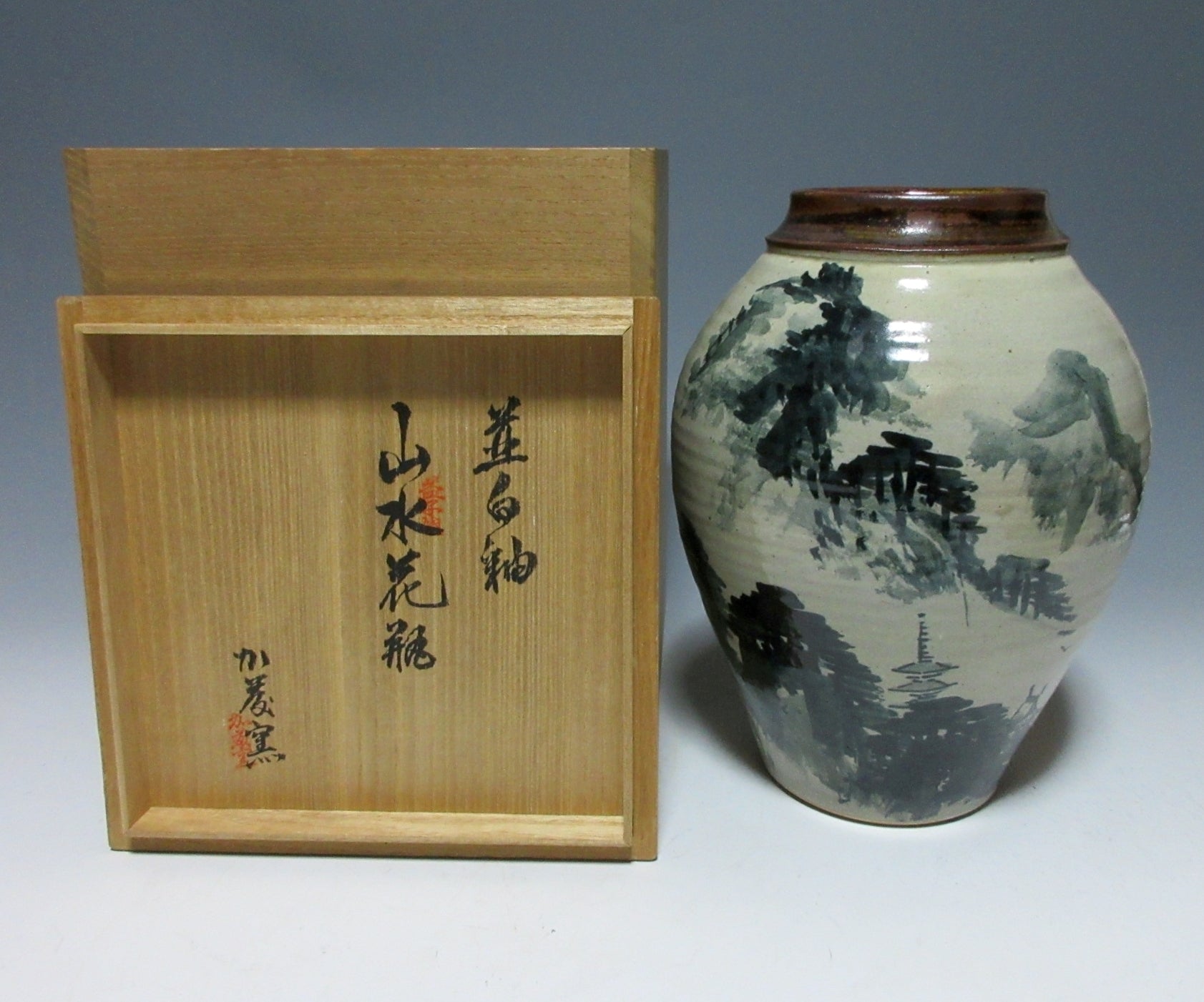 This listing is for a LARGE Mashiko-ware vase made around 50 years ago by Kato Gama. It is wheel-thrown and made of high-fired stoneware. The front is decorated with a hand-painted landscape scene over a white glazed background. The rim is trimmed with an iron based glaze and the opening is wide enough to accommodate a decent sized arrangement of flowers. Vases likes these look particularly beautiful with just a single branch of blossoms like plum or peach. It comes with its original signed wooden storage box. There’s also a Mashiko sightseeing pamphlet in the box, and it mentions opening a new pottery area by Showa 53, which is 1978.