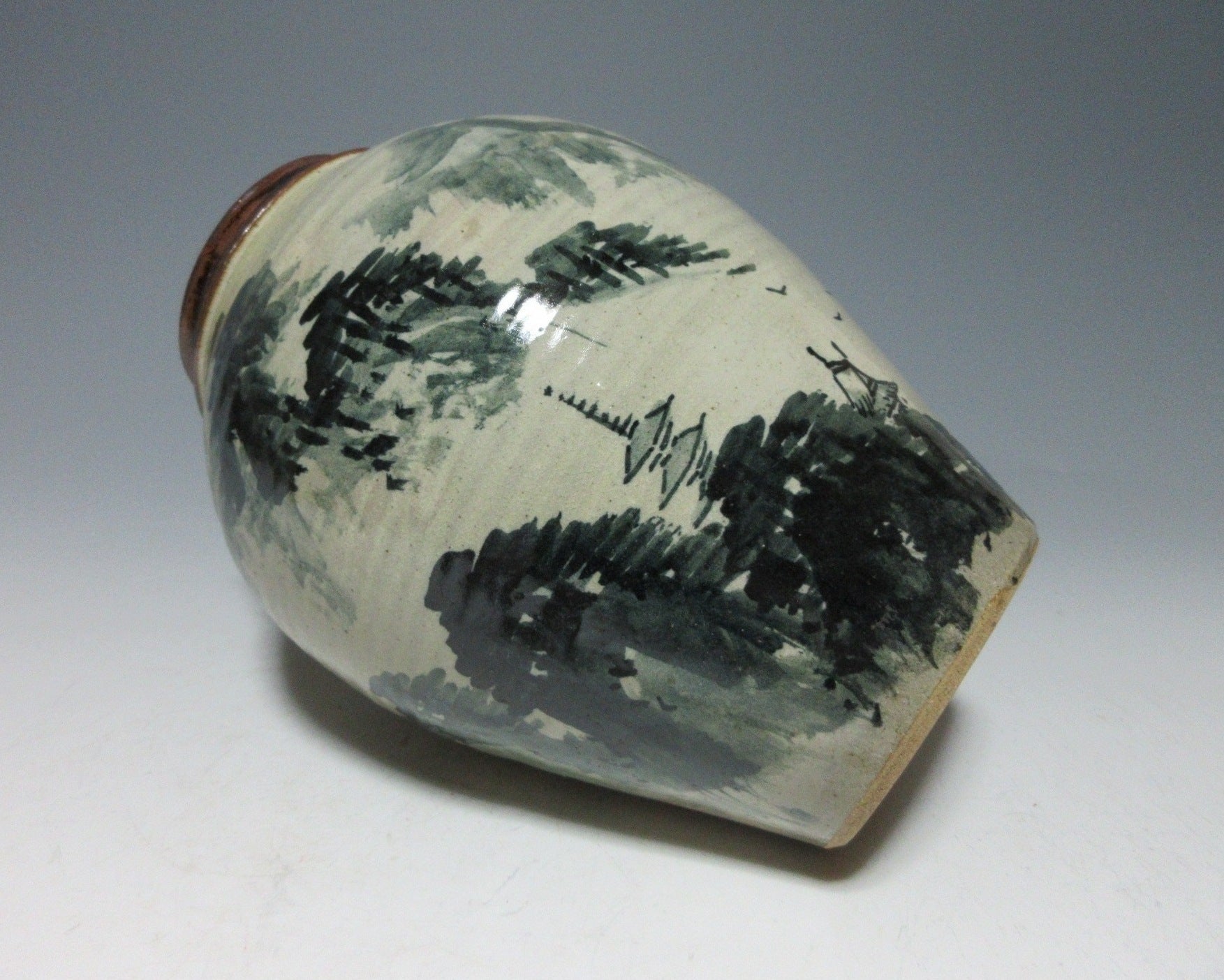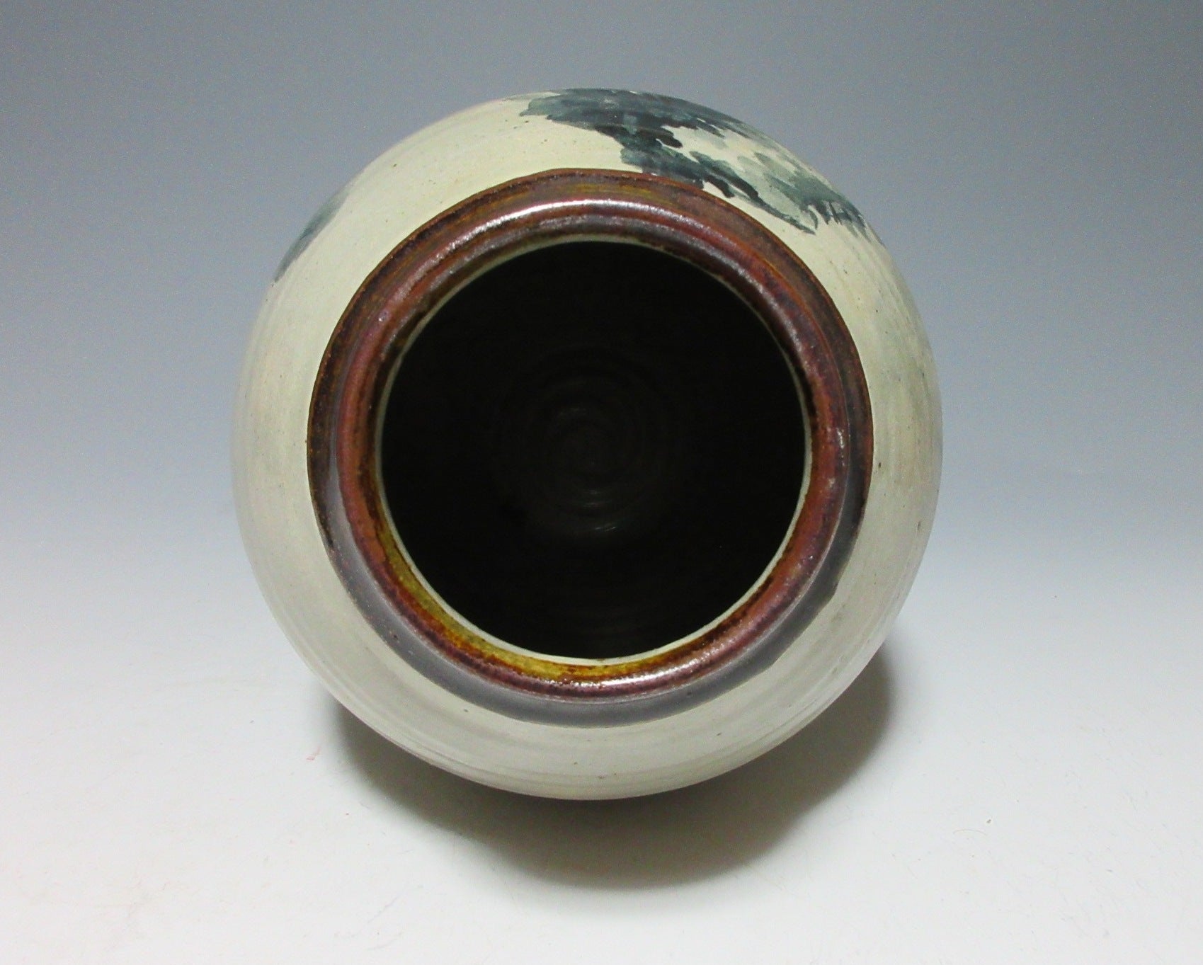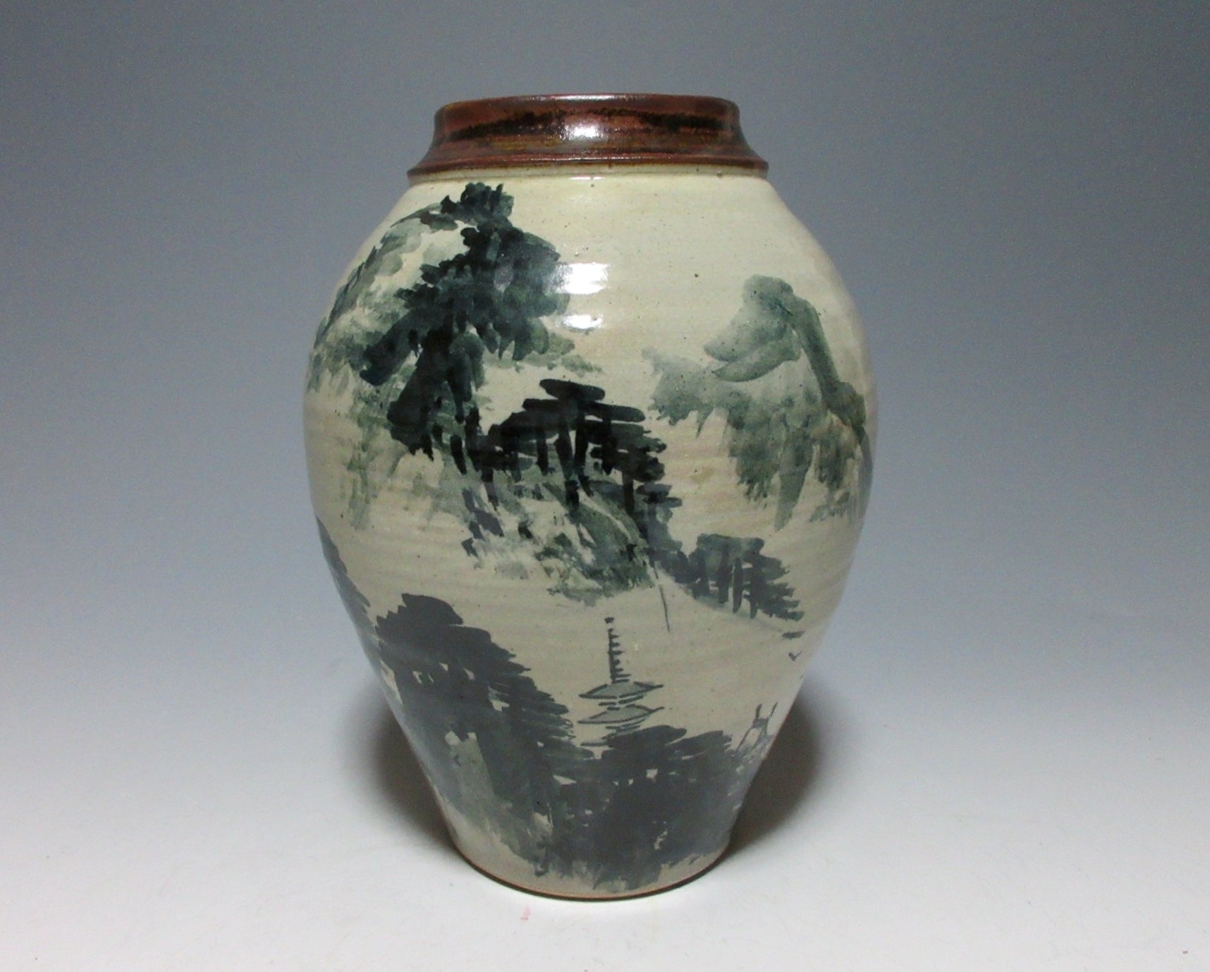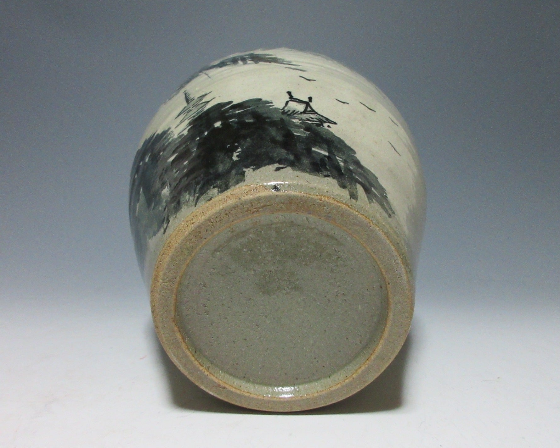 This listing is for a LARGE Mashiko-ware vase made around 50 years ago by Kato Gama. It is wheel-thrown and made of high-fired stoneware. The front is decorated with a hand-painted landscape scene over a white glazed background. The rim is trimmed with an iron based glaze and the opening is wide enough to accommodate a decent sized arrangement of flowers. Vases likes these look particularly beautiful with just a single branch of blossoms like plum or peach. It comes with its original signed wooden storage box. There’s also a Mashiko sightseeing pamphlet in the box, and it mentions opening a new pottery area by Showa 53, which is 1978.
