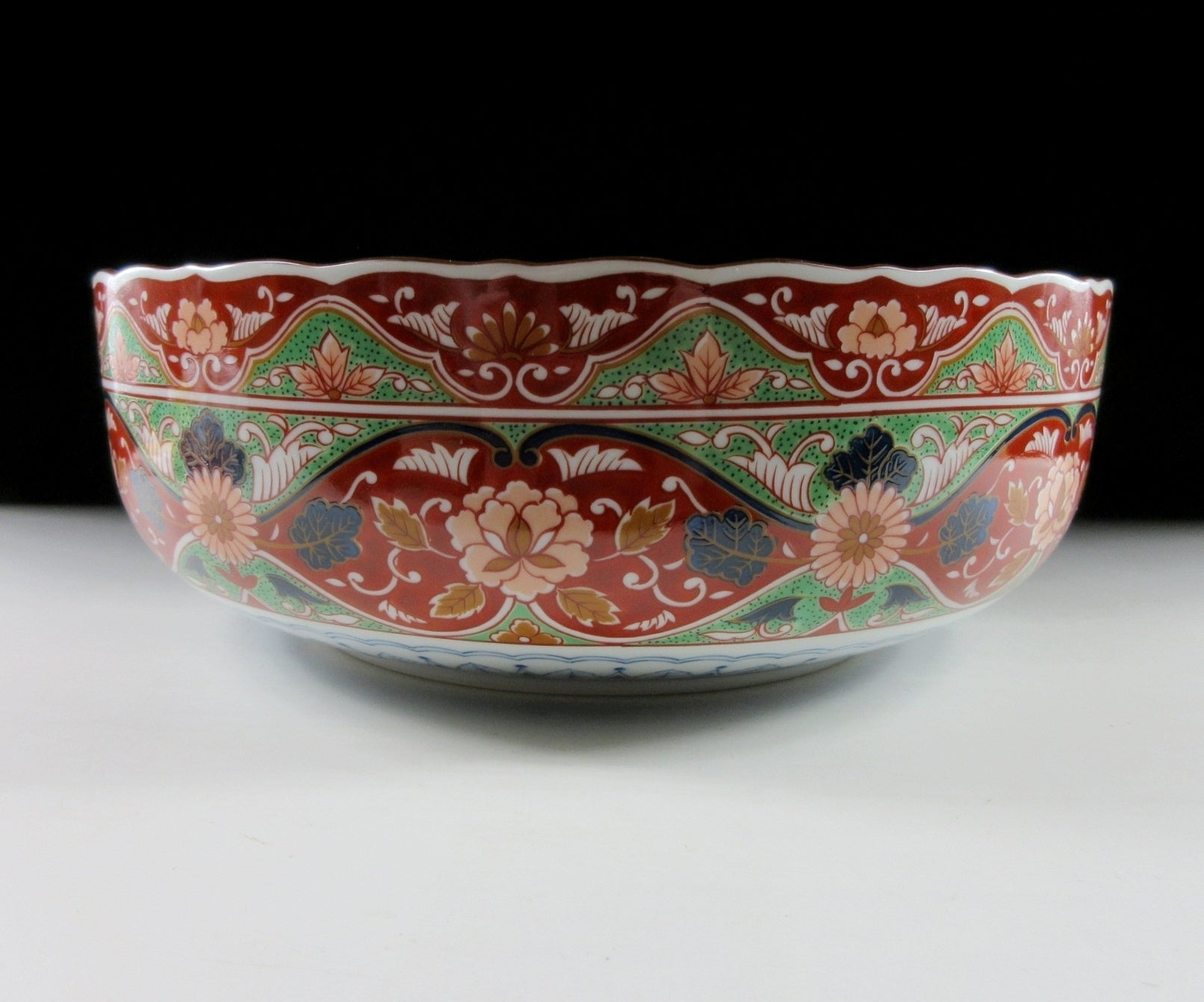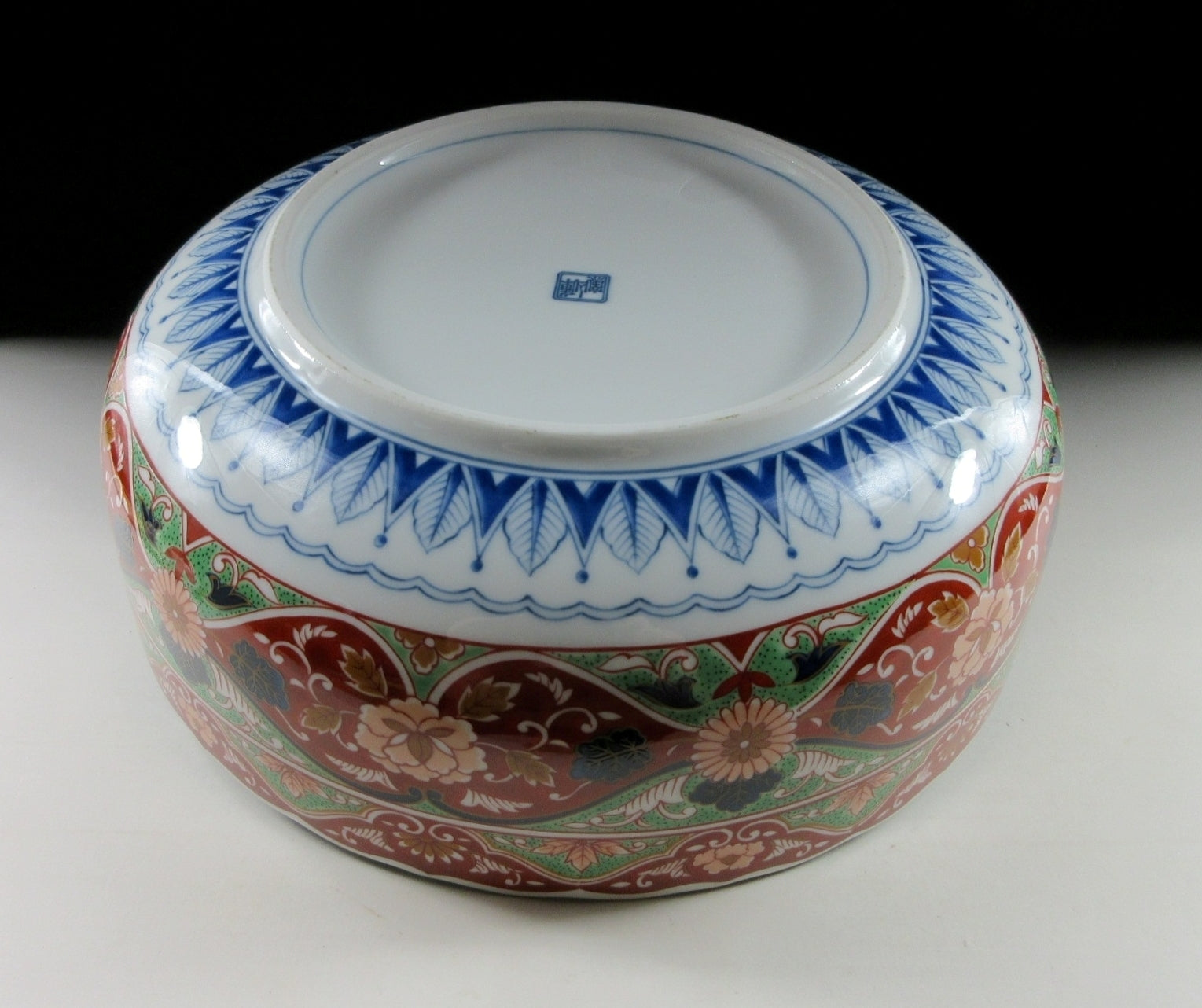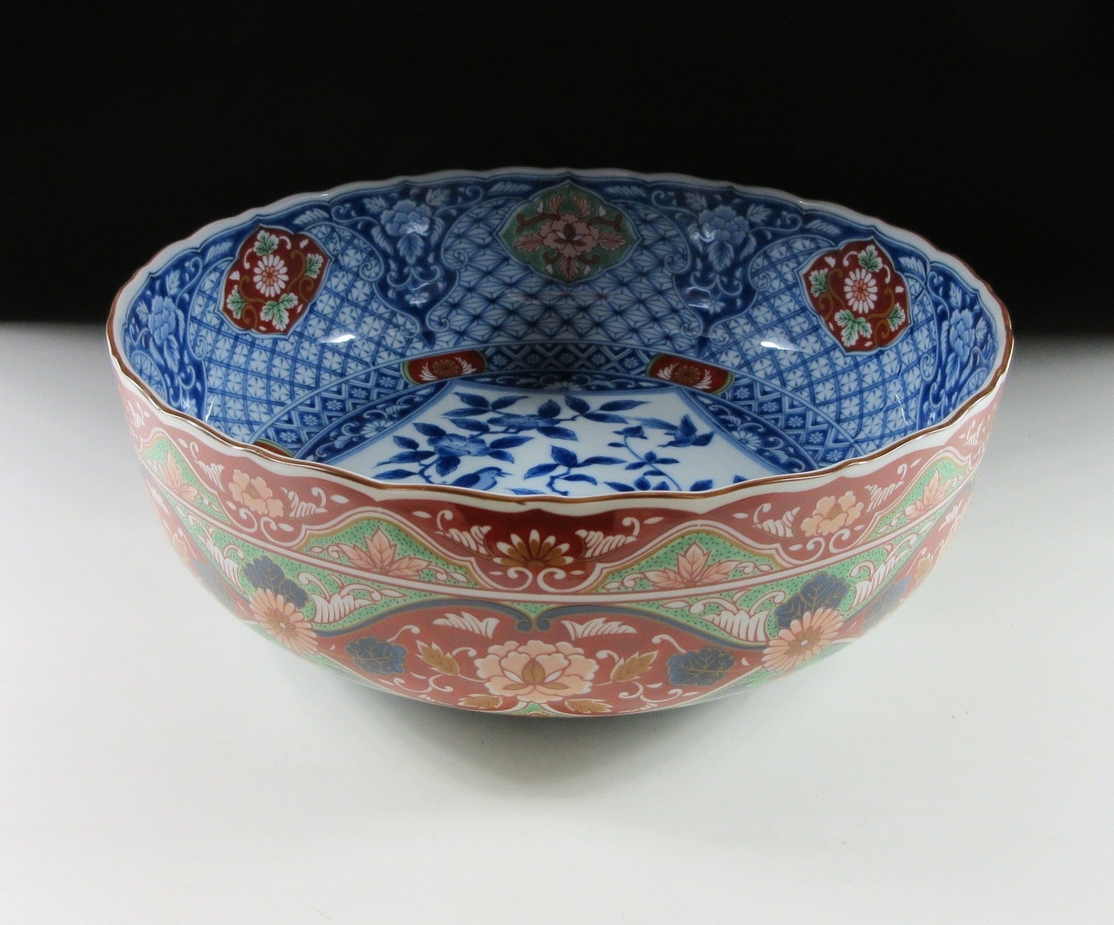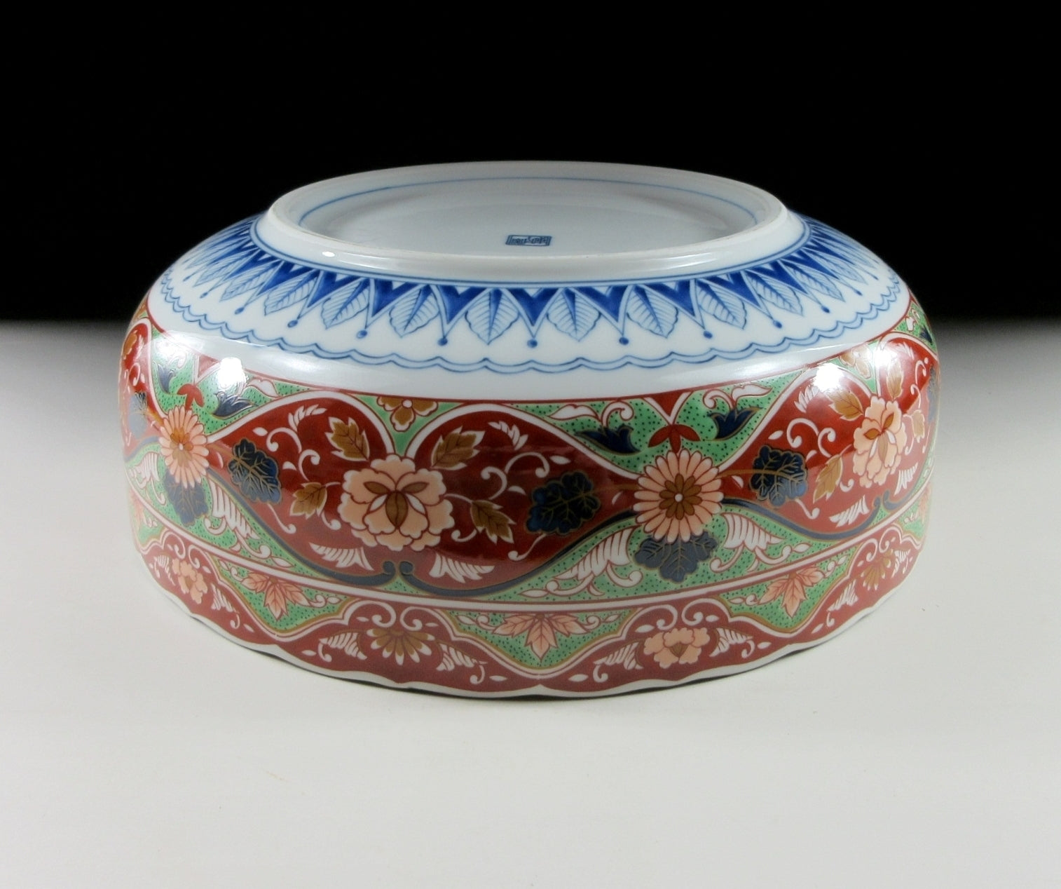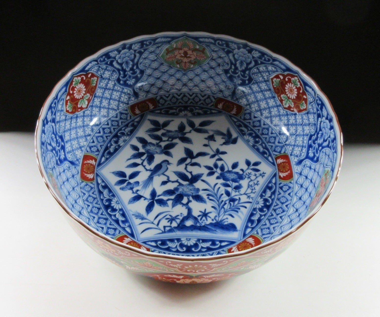 This listing is for a reasonably large Mino-ware bowl made around 20 years ago by Kozangama. It is made of porcelain and decorated with a nishiki ‘hanabusa’ design consisting of flowers, birds, and various textile patterns. This piece is ample in size and would make a wonderful fruit bowl or centrepiece. The Kozangama mark can be found on the bottom, and it comes with its original paper storage box.