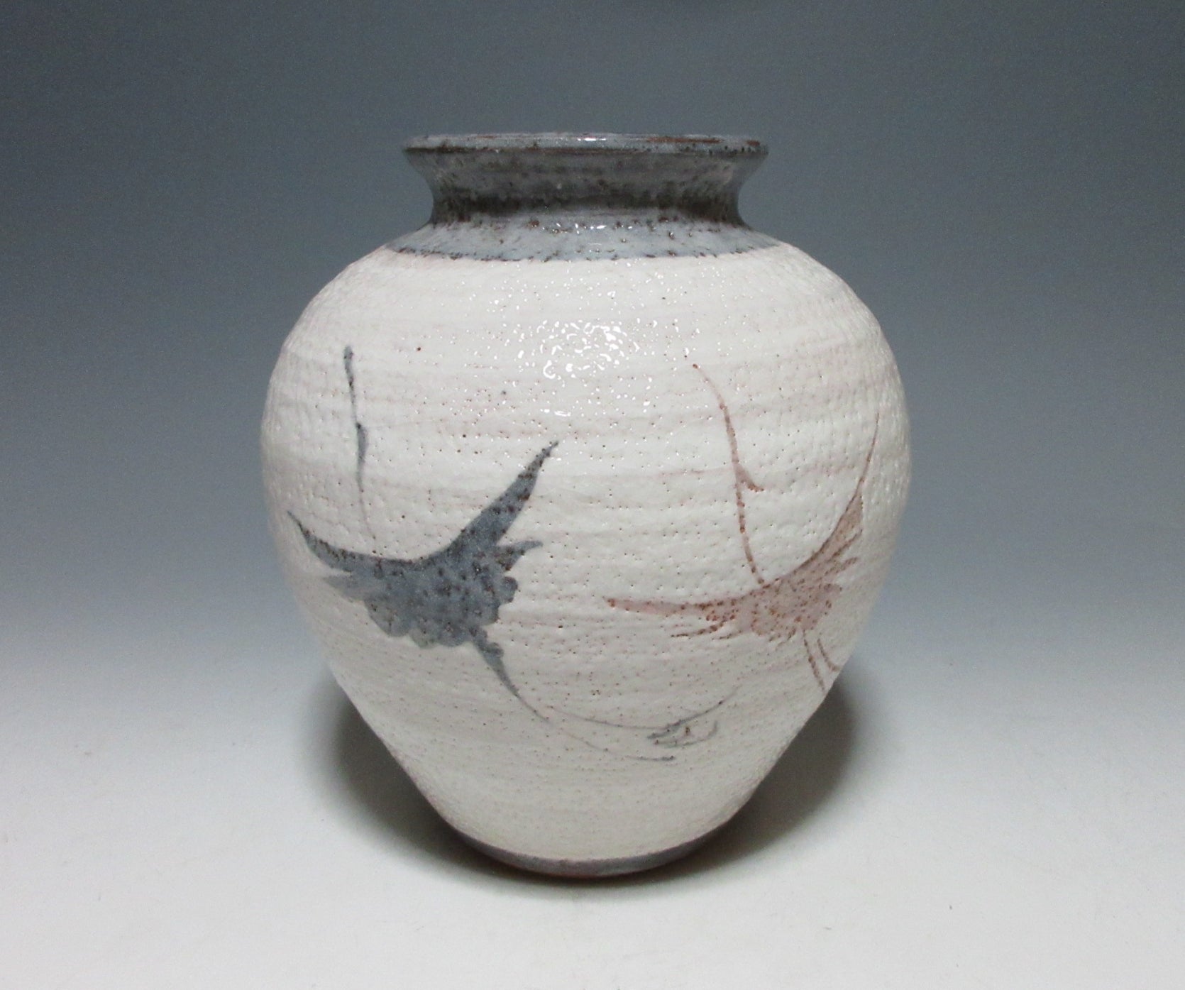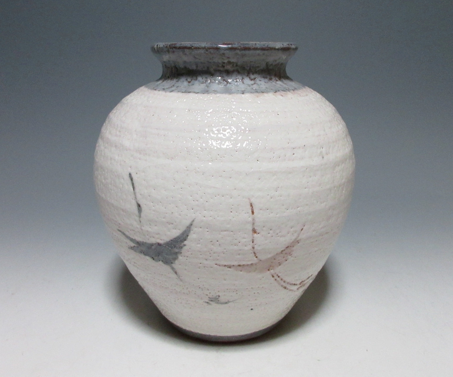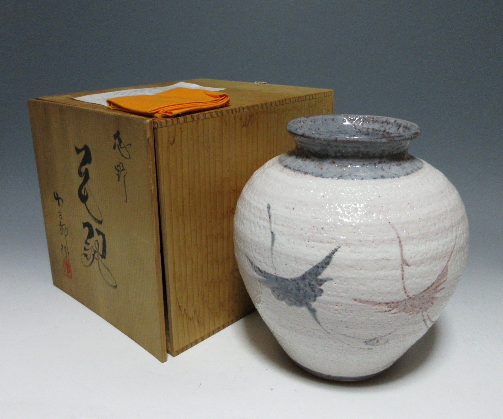 This listing is for a large and rather splendid Shino-ware vase made around 30-40 years ago by noted potter, Kuwabara Kosaburo V. It is a wheel-thrown, white-glazed stoneware vase featuring majestic cranes in flight depicted in underglaze. This piece is ample is size and the opening is wide enough to accommodate a decent arrangement of flowers. Kosaburo vases usually have a small stamp on the bottom, we couldn’t see it so it might be covered by glaze. It comes with its original signed wooden storage box, as well as a turmeric coloured wrapping cloth for when the item is not in use. It also comes with a Japanese language profile paper.