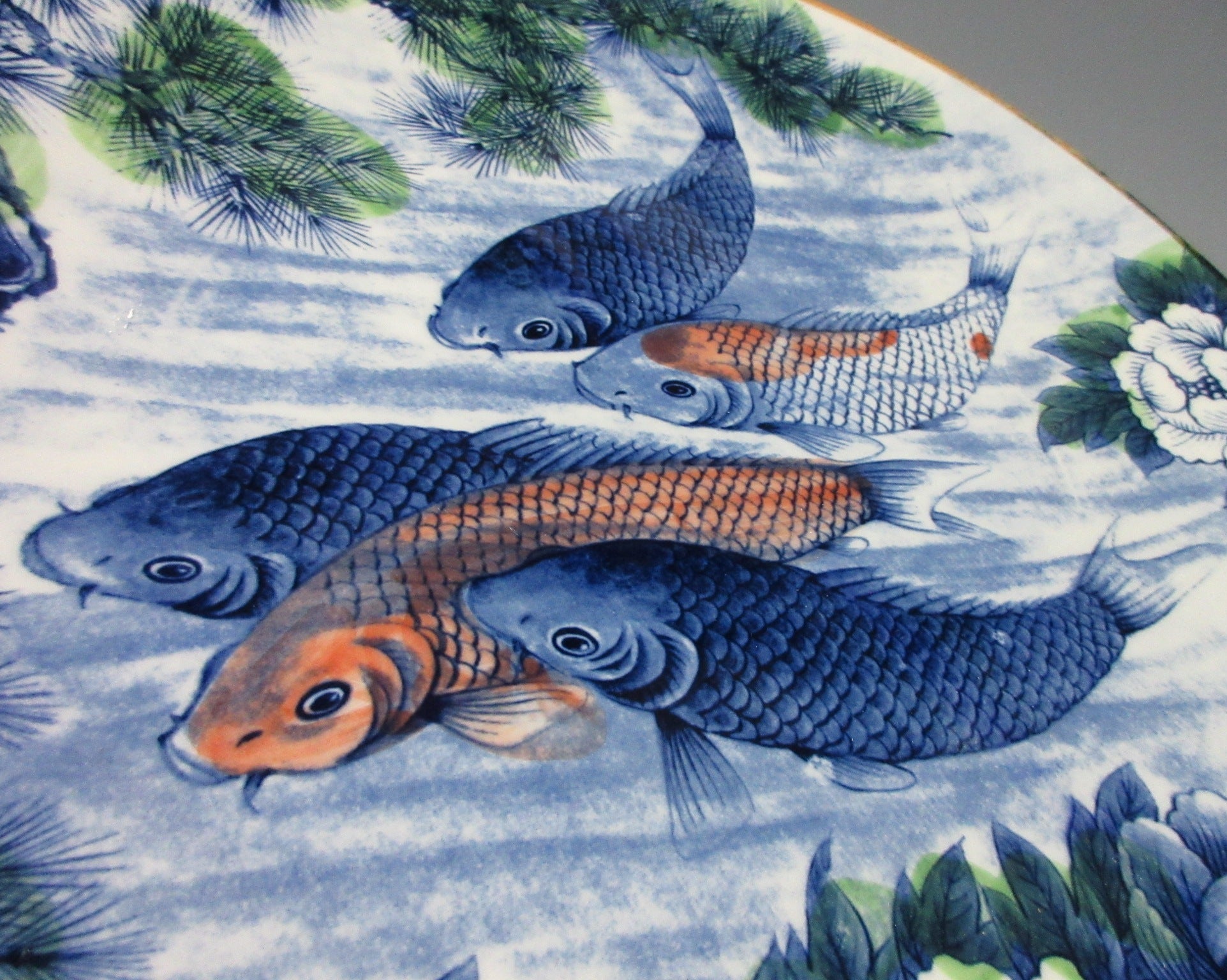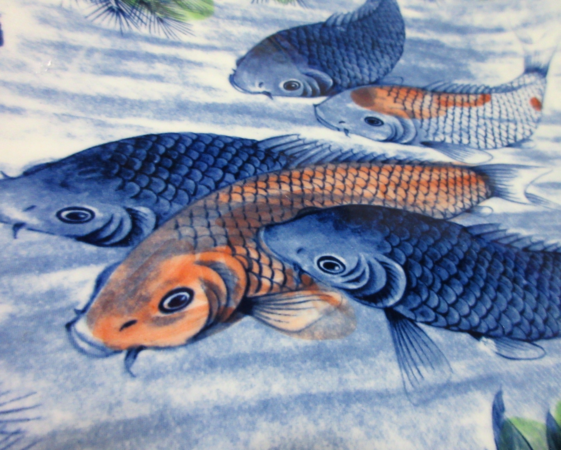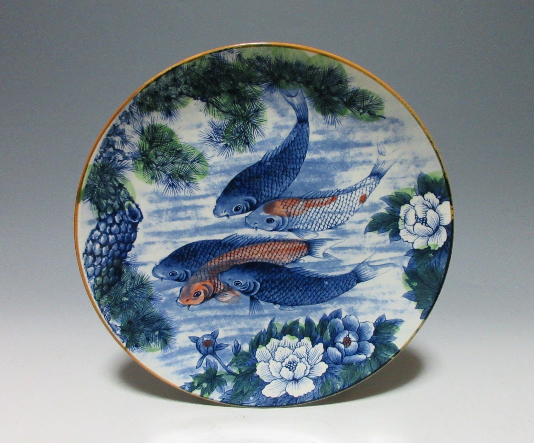 This listing is for a reasonably large Mino-ware plate made around 20 years ago. The front is decorated with koi fish and it is white underneath. The koi were most likely created using a stencil or transfer, they are not hand painted. This kind of plate is usually for serving sashimi, it would also make a lovely display item. These plates are never stamped on the back in Japan, however I have seen them marked as Toyo Japan and Sun Ceramics Japan for the international market.
