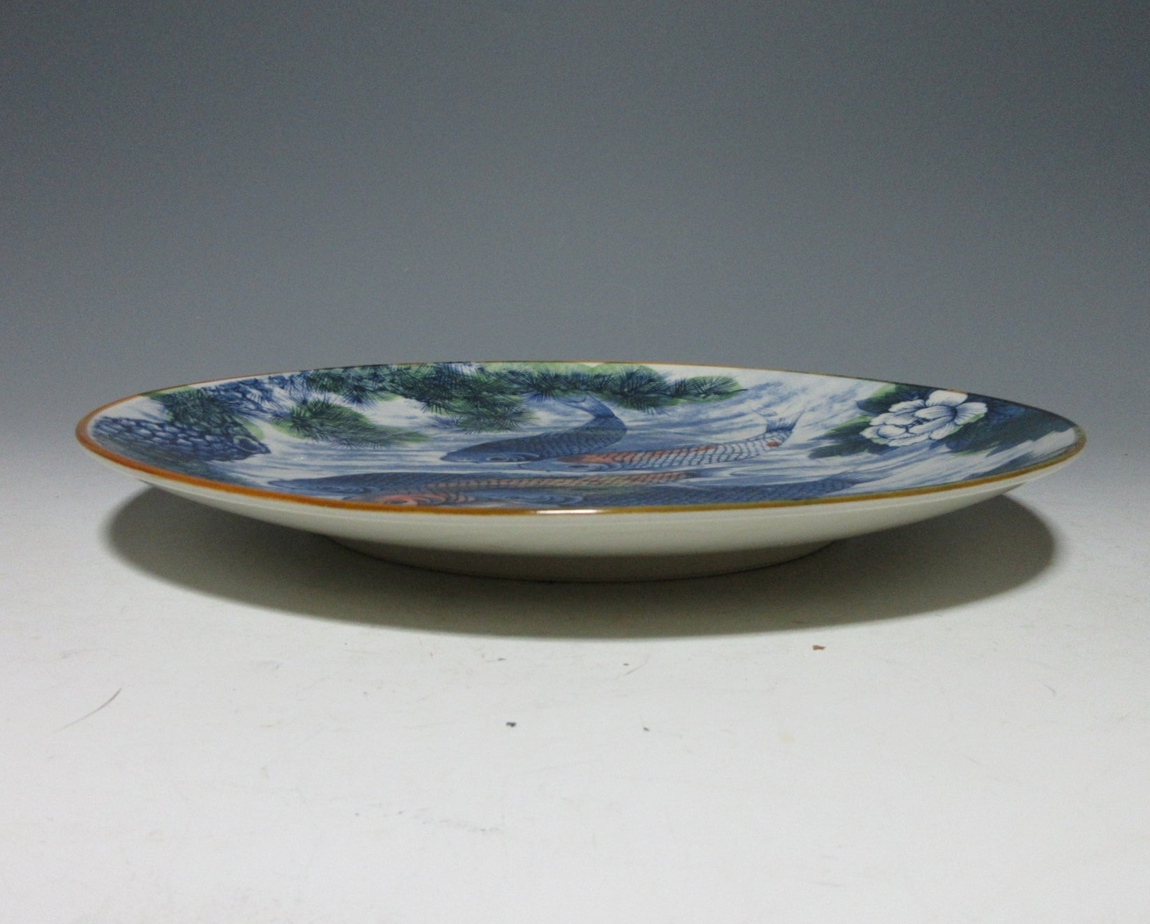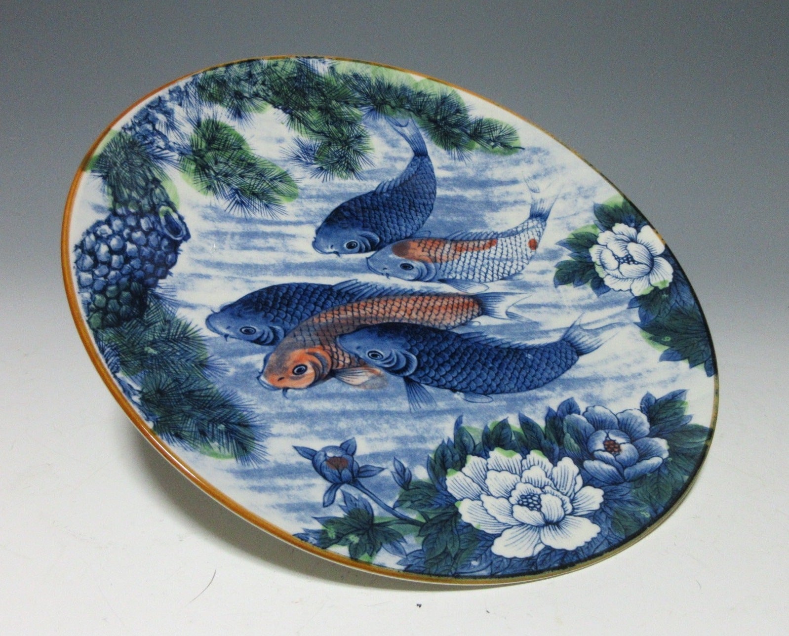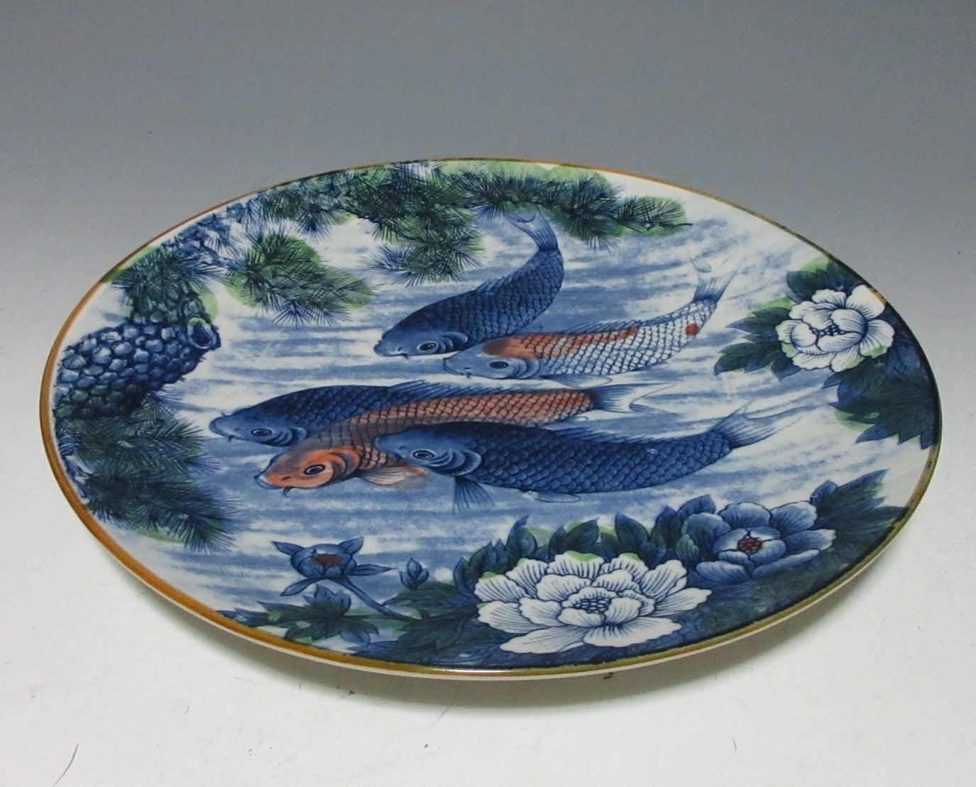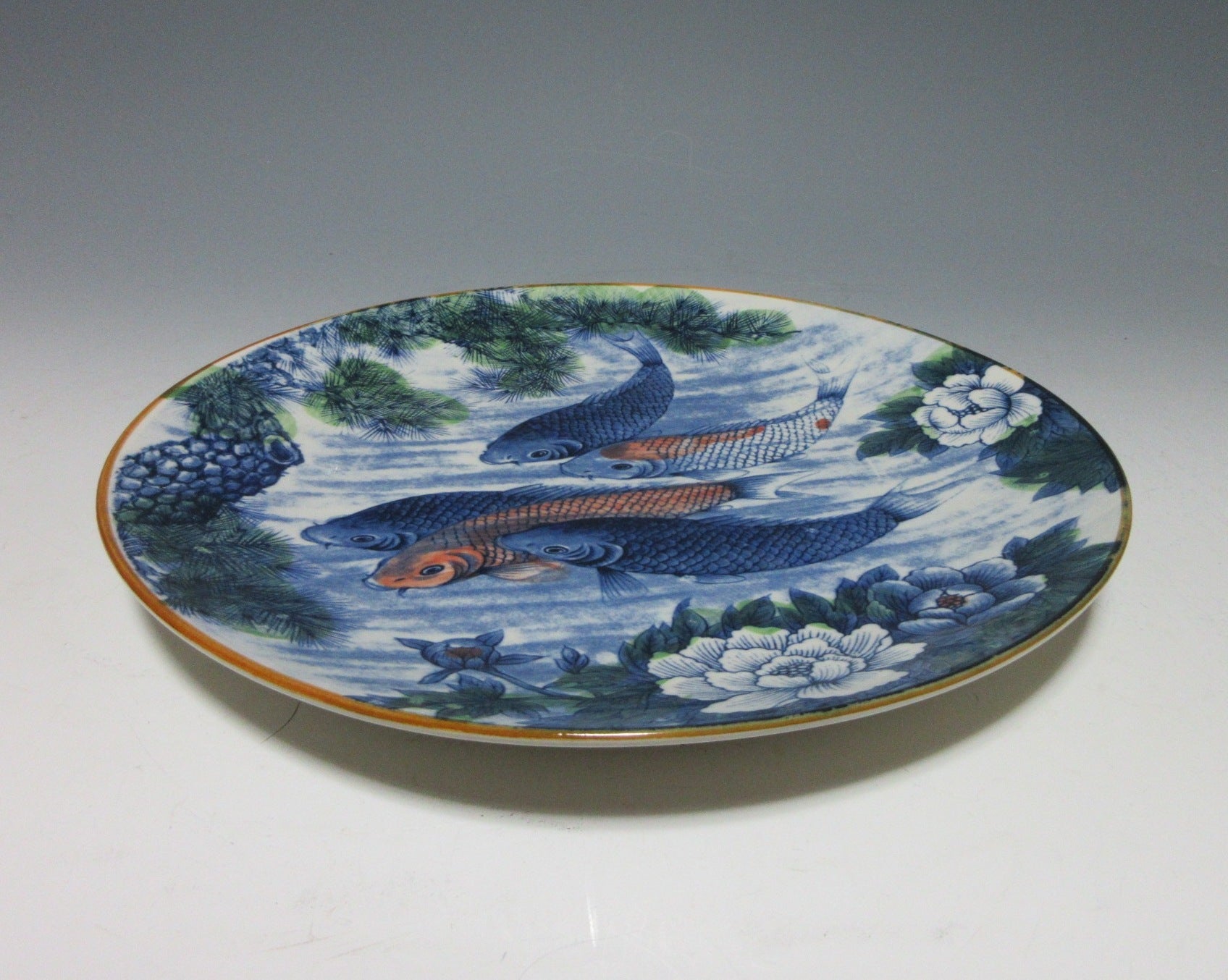 This listing is for a reasonably large Mino-ware plate made around 20 years ago. The front is decorated with koi fish and it is white underneath. The koi were most likely created using a stencil or transfer, they are not hand painted. This kind of plate is usually for serving sashimi, it would also make a lovely display item. These plates are never stamped on the back in Japan, however I have seen them marked as Toyo Japan and Sun Ceramics Japan for the international market.