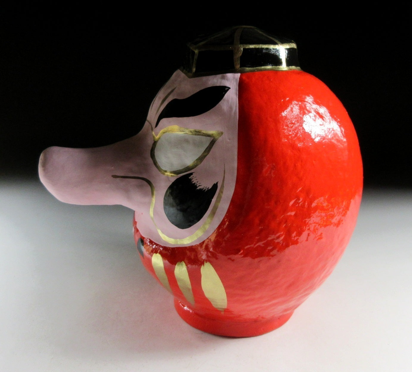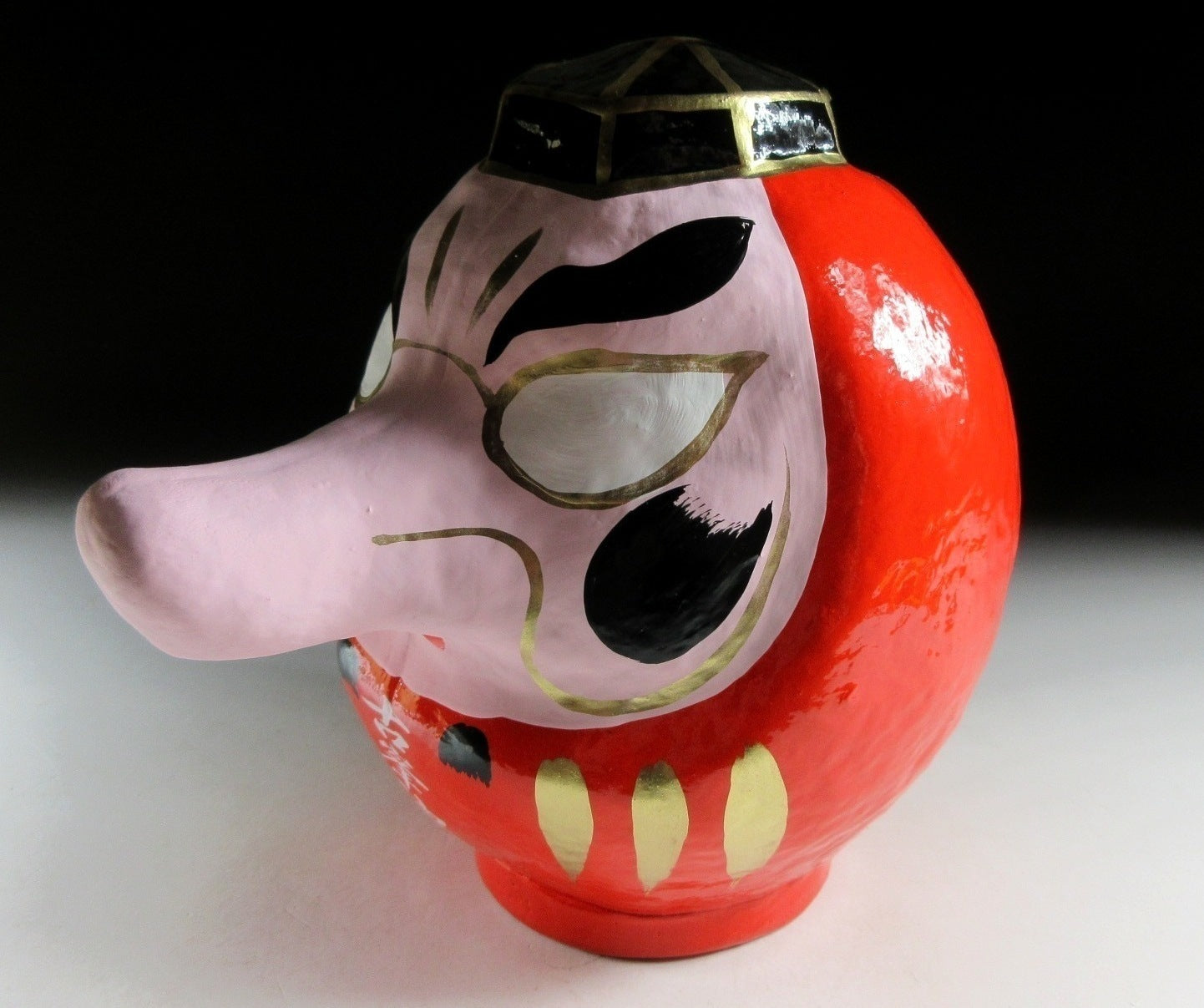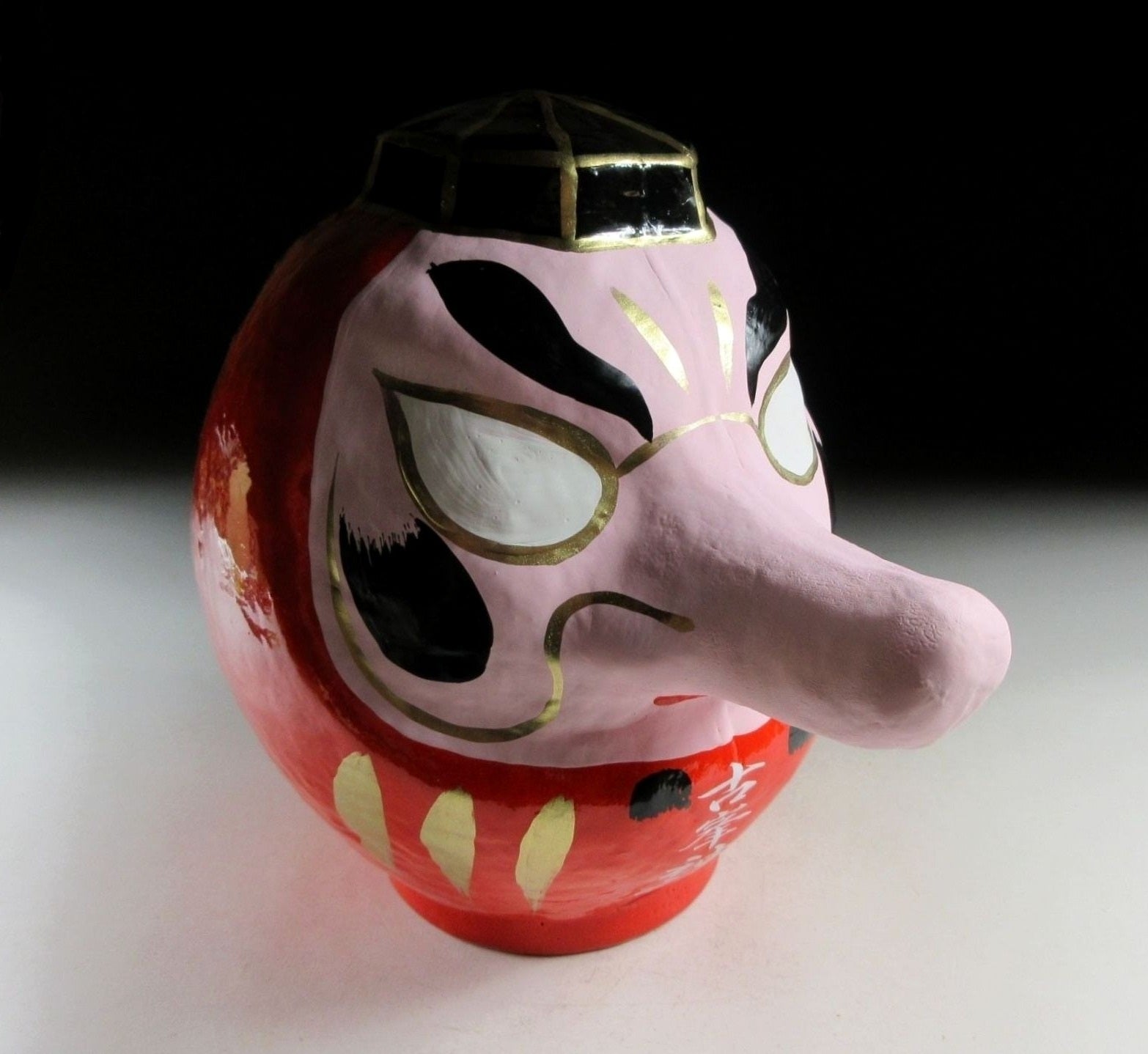 This listing is for a large size papier mâché Tengu Daruma. Tengu are a type of long nosed goblin believed to inhabit the mountains and forests of Japan. They have supernatural powers and are recognised in both Shinto and Buddhist teachings. The Daruma in this listing comes from Furumine Shrine in Kanuma city, Tochigi Prefecture. Furumine Shrine is a tengu dedicated shrine that houses over 200 tengu masks in the main hall. Temples usually sell Daruma as good luck charms, and Furumine shrine has combined tengu with Daruma to make its own original good luck charm.
