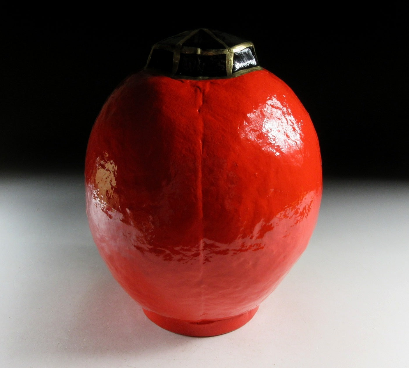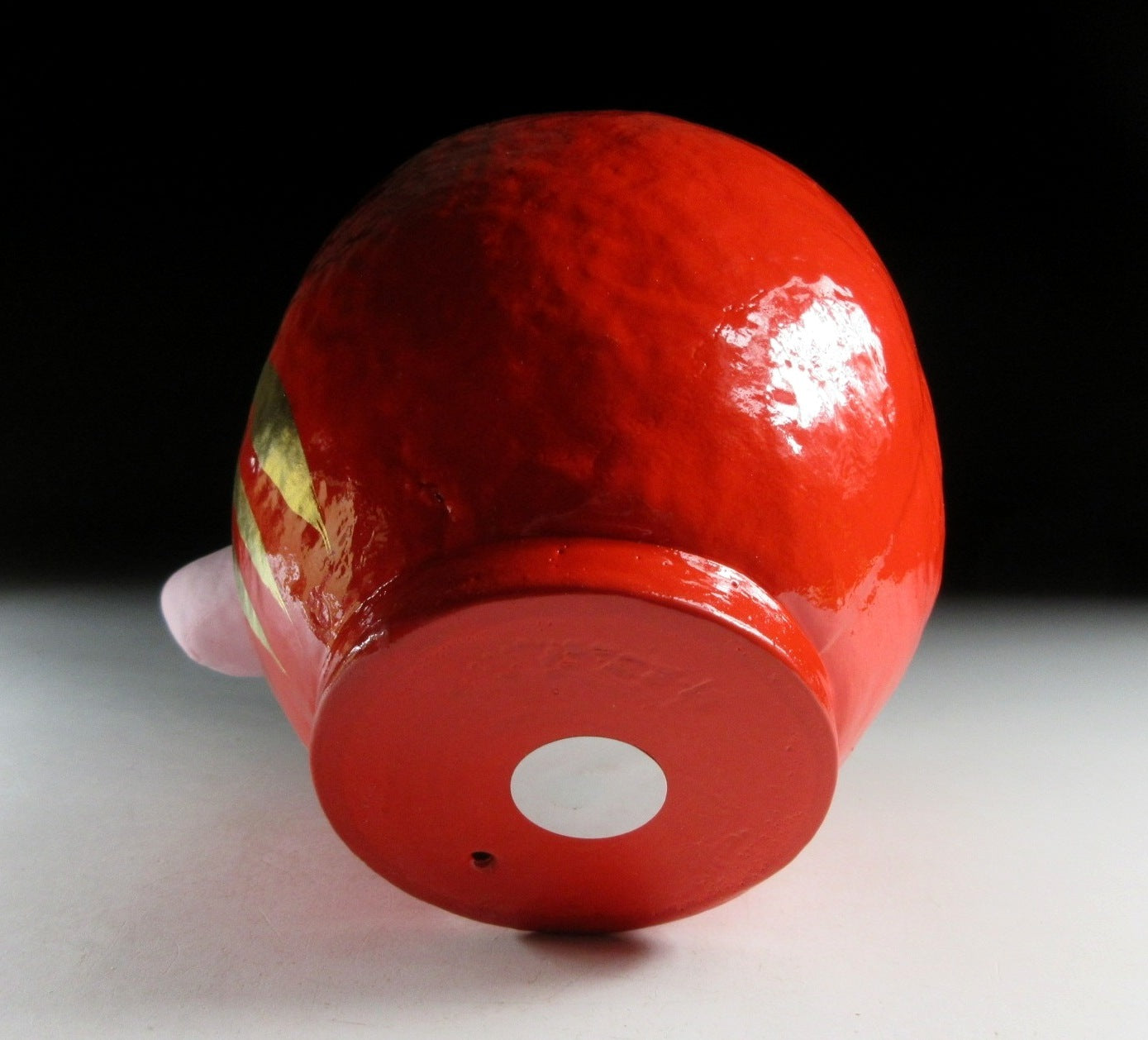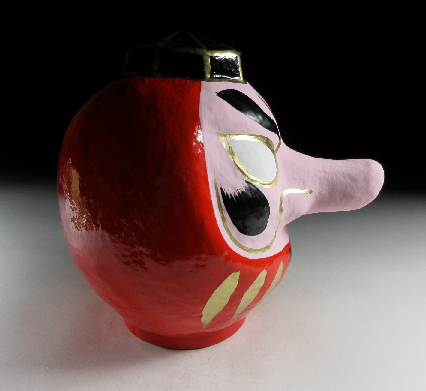 This listing is for a large size papier mâché Tengu Daruma. Tengu are a type of long nosed goblin believed to inhabit the mountains and forests of Japan. They have supernatural powers and are recognised in both Shinto and Buddhist teachings. The Daruma in this listing comes from Furumine Shrine in Kanuma city, Tochigi Prefecture. Furumine Shrine is a tengu dedicated shrine that houses over 200 tengu masks in the main hall. Temples usually sell Daruma as good luck charms, and Furumine shrine has combined tengu with Daruma to make its own original good luck charm.