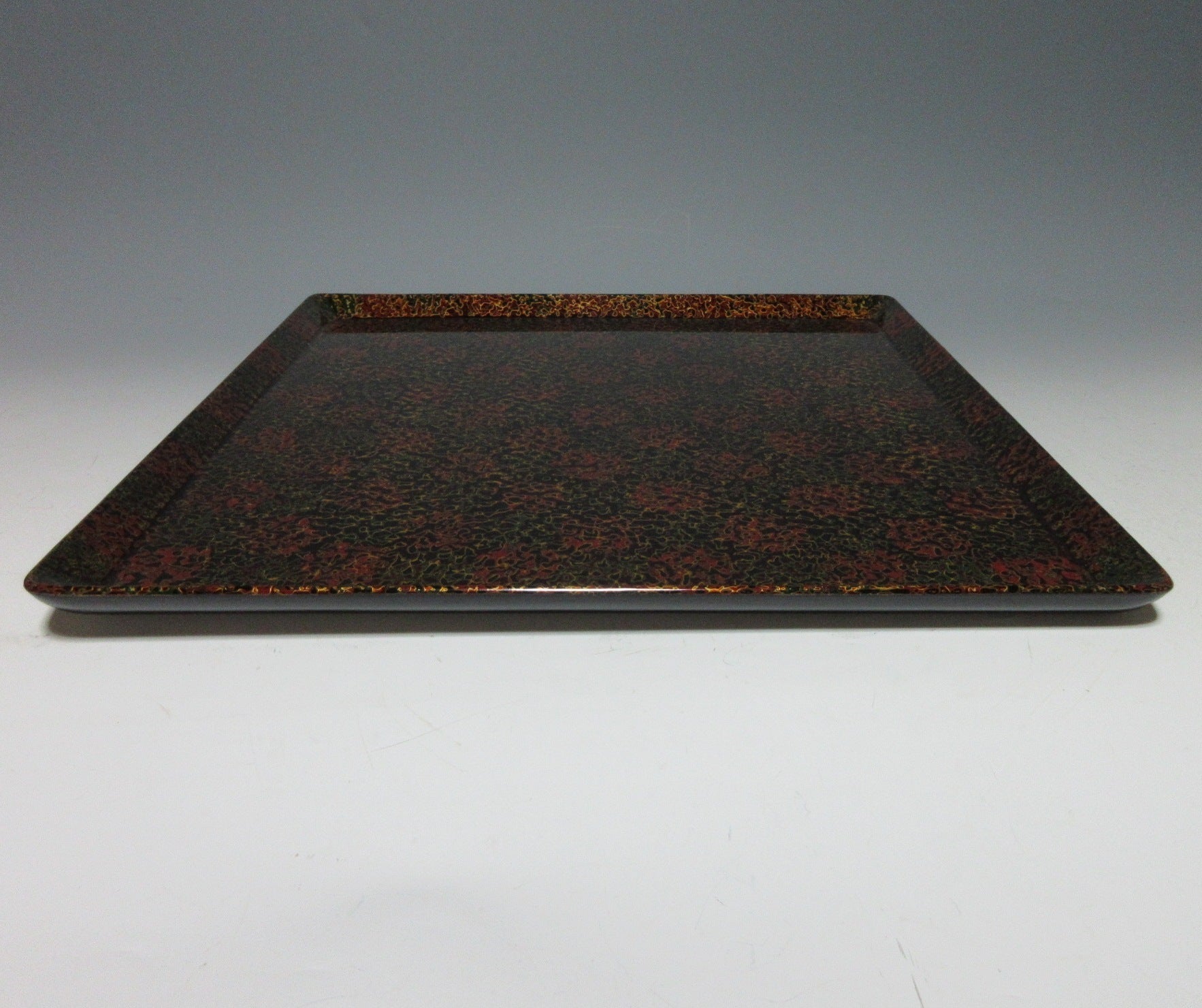 This listing is for a LARGE square Tsugaru-nuri lacquer tray made around 20-30 years ago. It is made of wood and this particular type of Tsugaru pattern is known as ‘Kara Nuri”. Kara Nuri is characterized by its smooth speckled appearance made with layers of sanded and polished lacquer. The back of the tray is coated in smooth black lacquer and the wood base is made of hinoki cypress. It comes with its original paper storage box as well as a Japanese language profile paper about Tsugaru lacquerware.