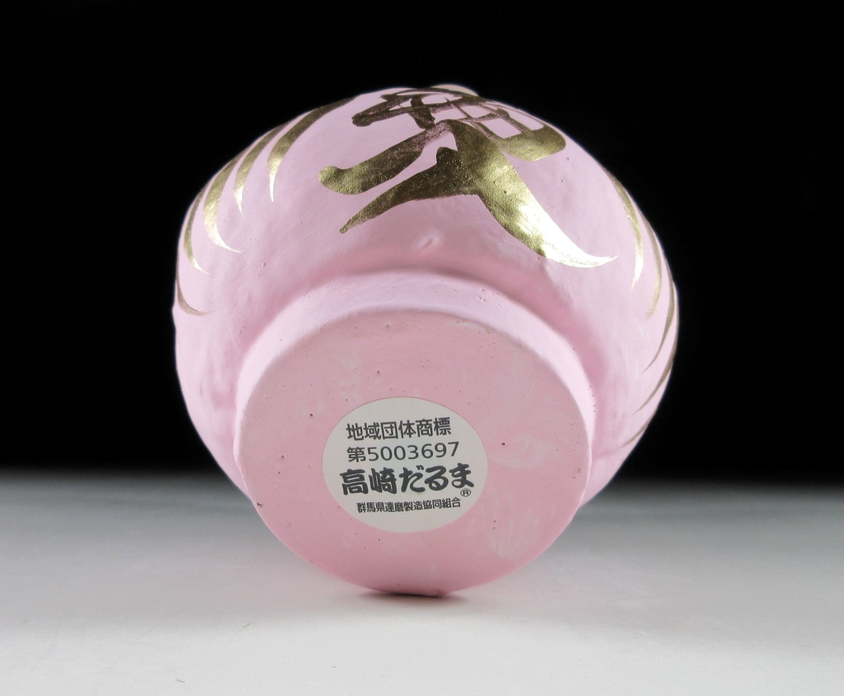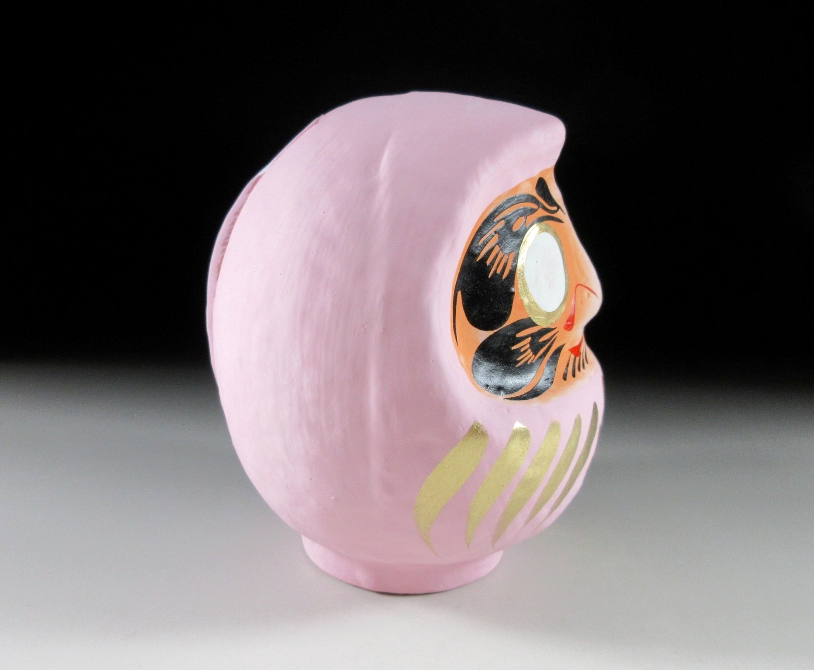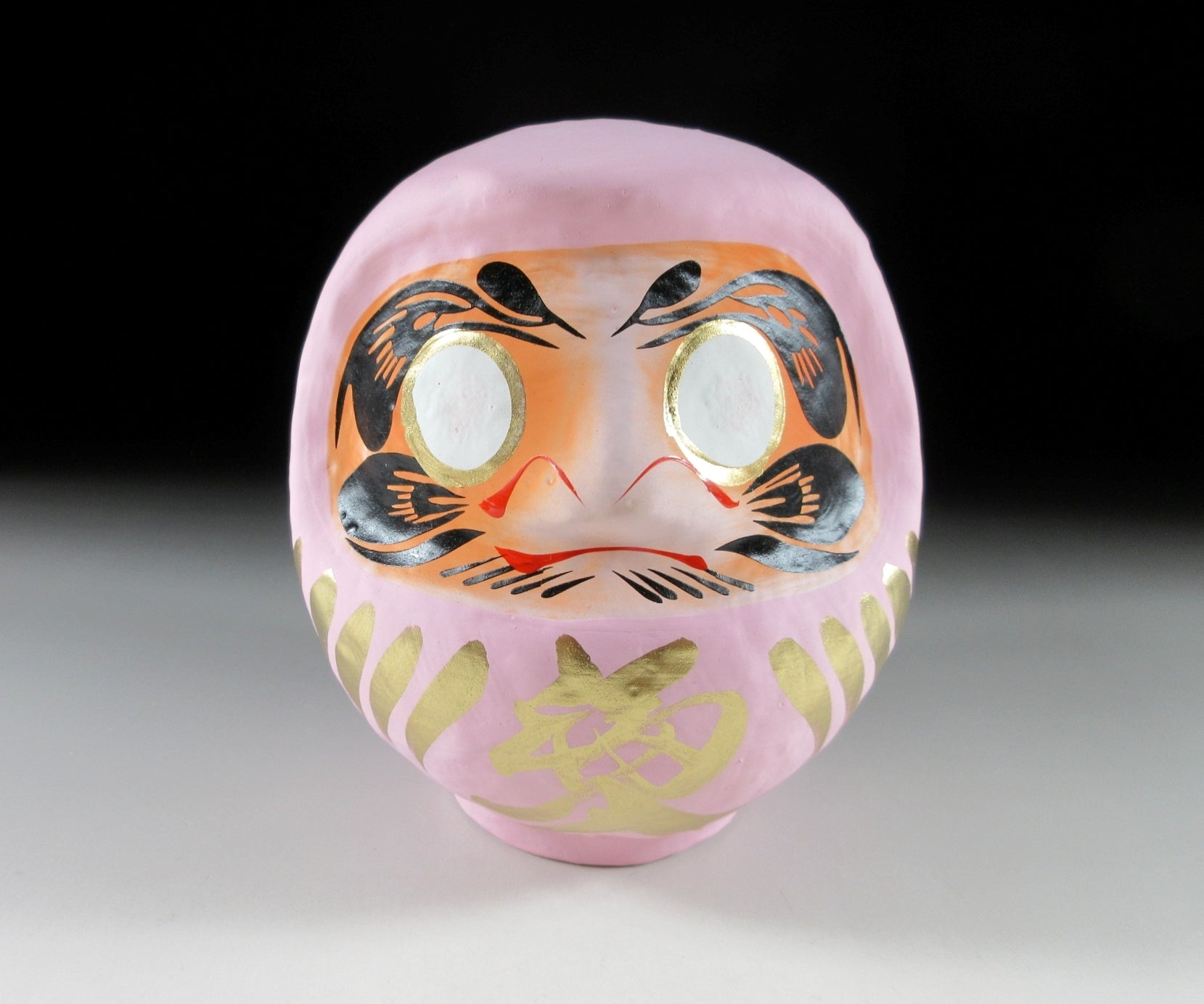 This listing is for a small Takasaki Shorinzan Fuku-Daruma. Daruma is a popular talisman of good luck, especially during New Year. When a Daruma is purchased, the owner paints a pupil on the left eye while making a wish. Once the wish is realised the right pupil is added, and then the Daruma is taken to the local temple to be burned during a special ceremony. The Daruma in this listing is pink and made of papier-mâché. Pink Daruma are thought to bring the owner passion and romance. This Daruma has been blessed at the temple and there’s a blessing paper attached to the back.