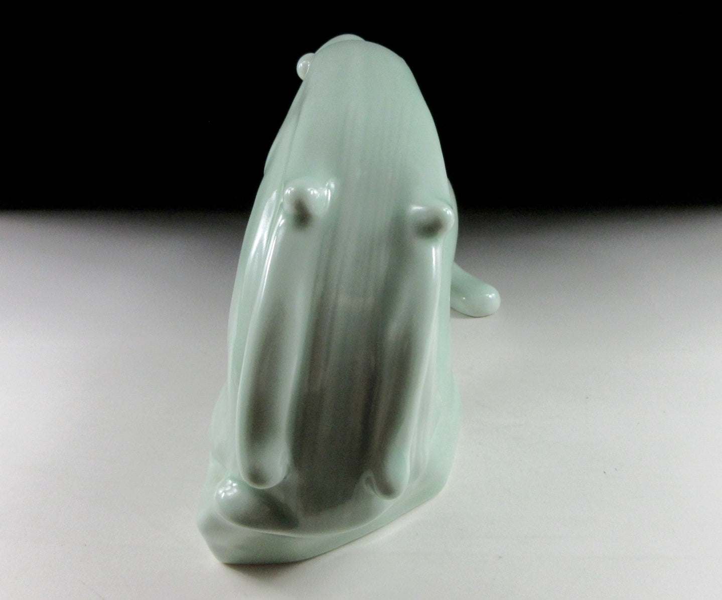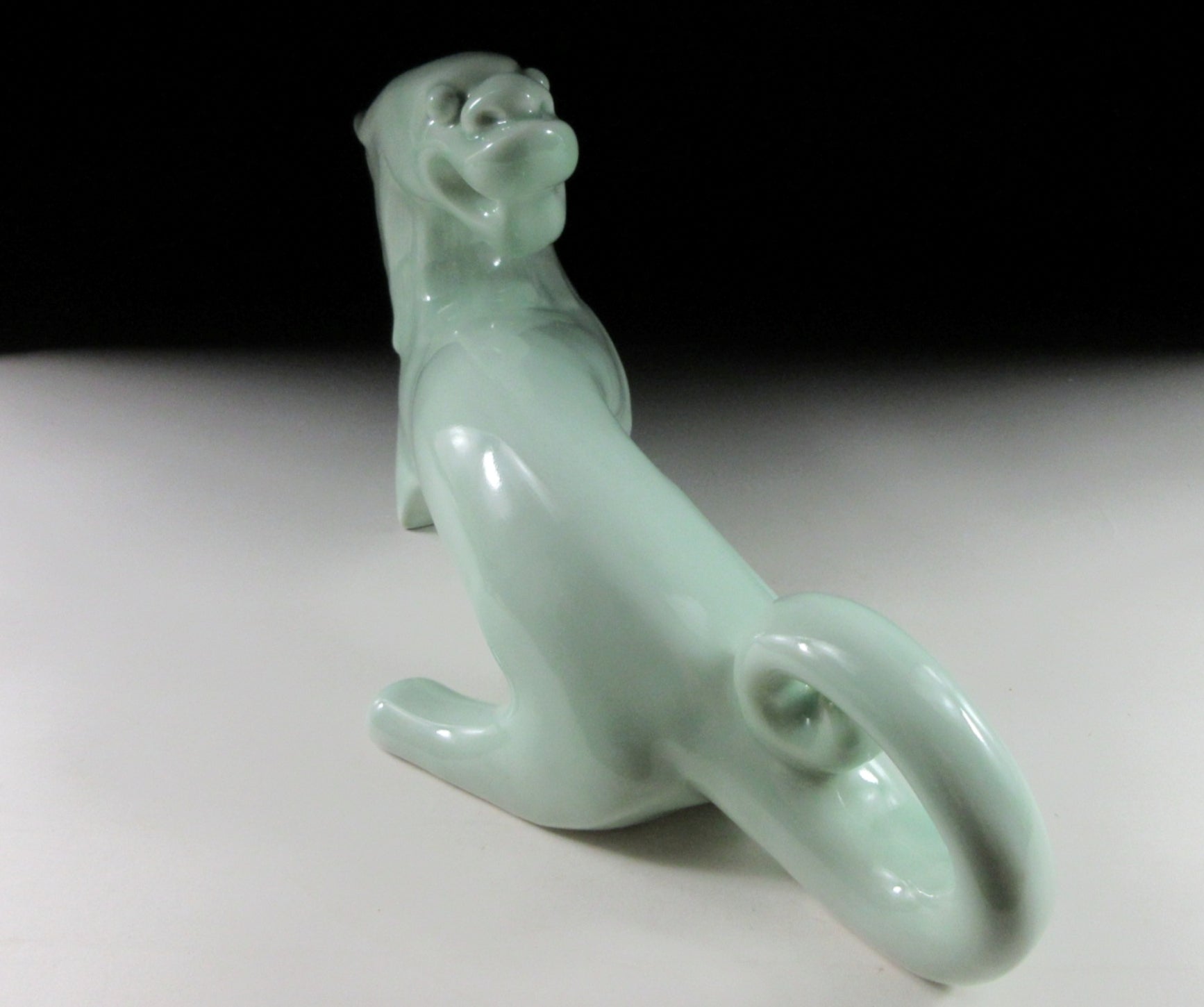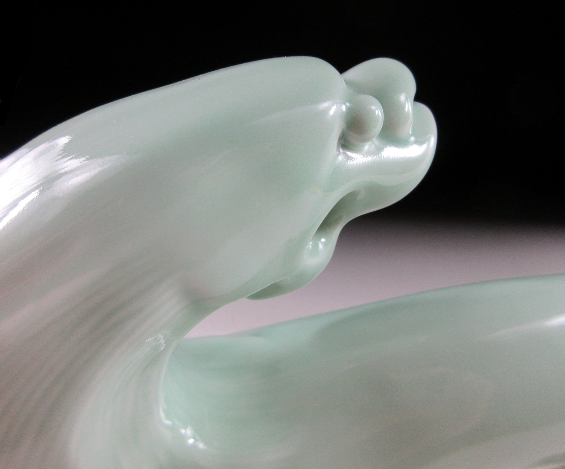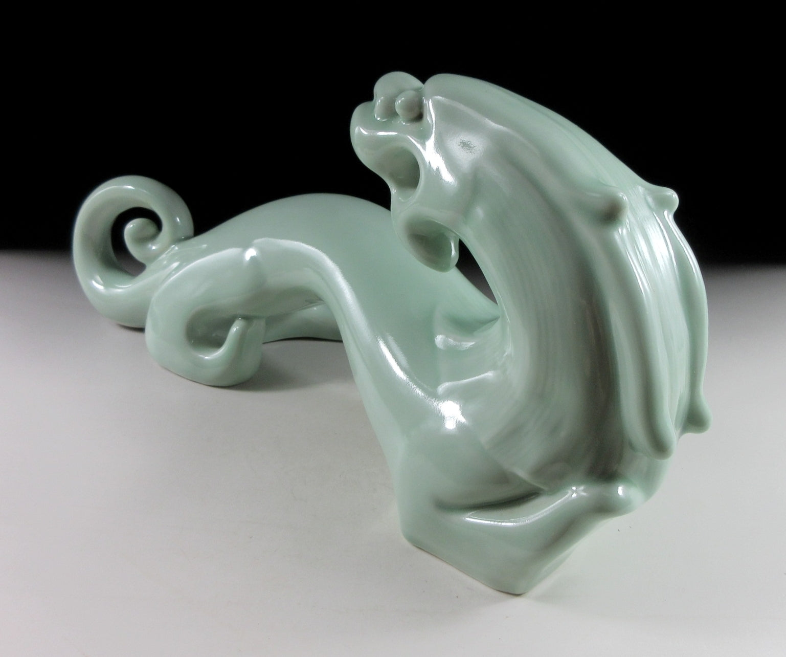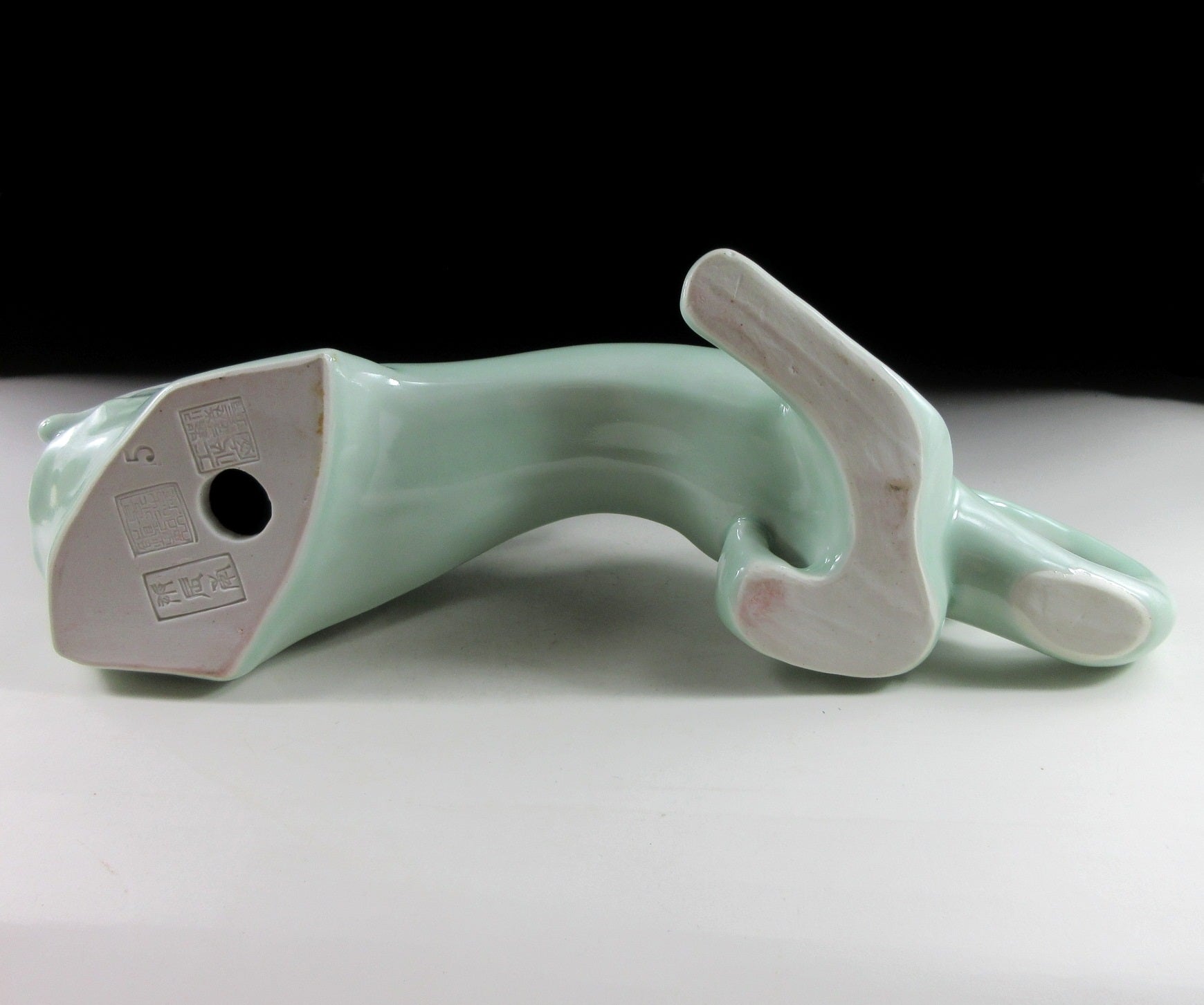 This listing is for a beautiful celadon dragon okimono made around 25 years ago by Chinese master artist, Liu Yuanchang. It was made from a slip mould and coated in soft green celadon glaze. This is Liu’s millennium dragon made to commemorate the Year of the Dragon in 2000. The millennium dragon came in three colours – white, celadon and black-gold. The bottom is stamped with three seals, and the number 5 is an employee number (Liu has workers at the Sculpture Porcelain Factory complex who assist with pouring moulds, glazes etc).