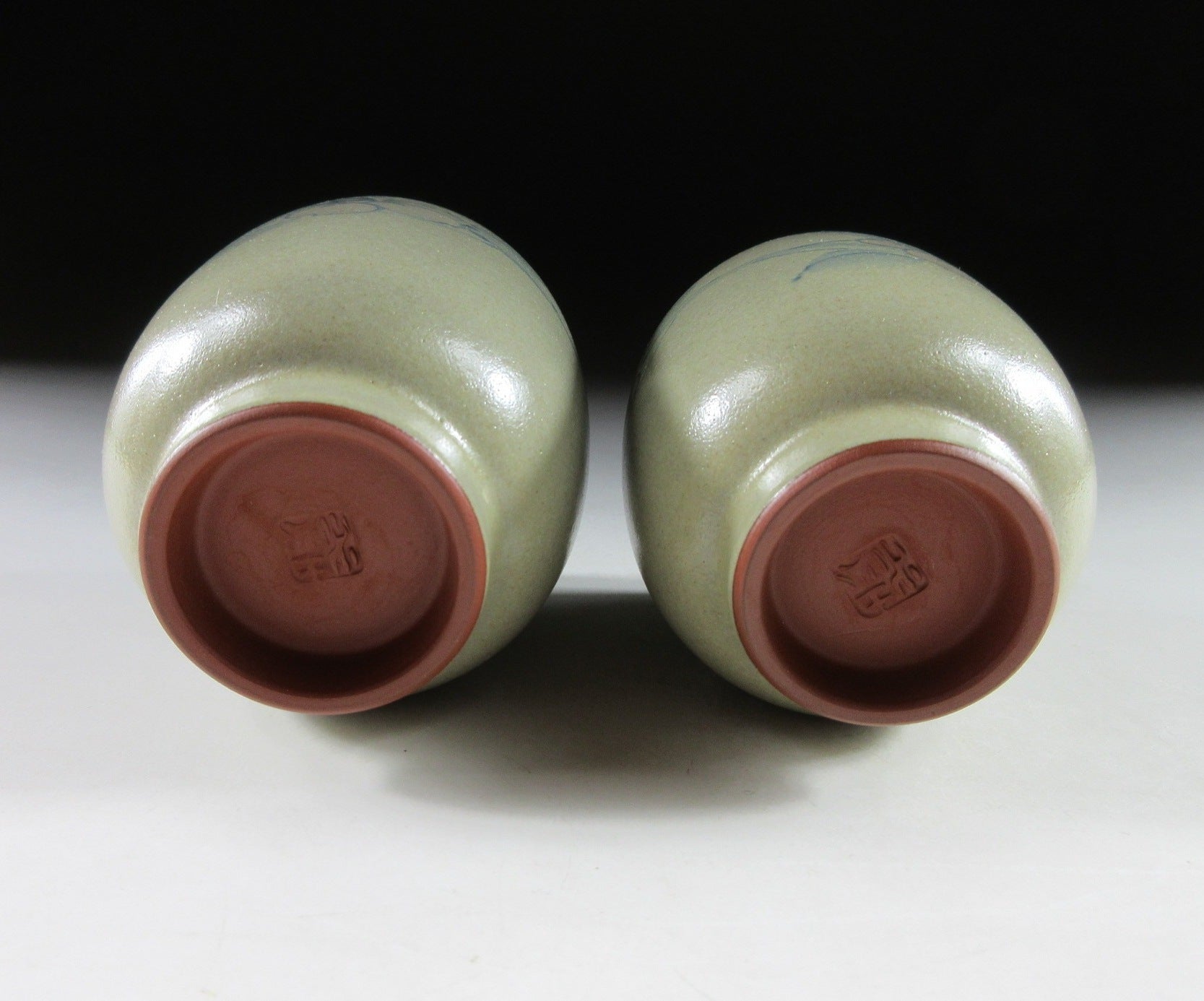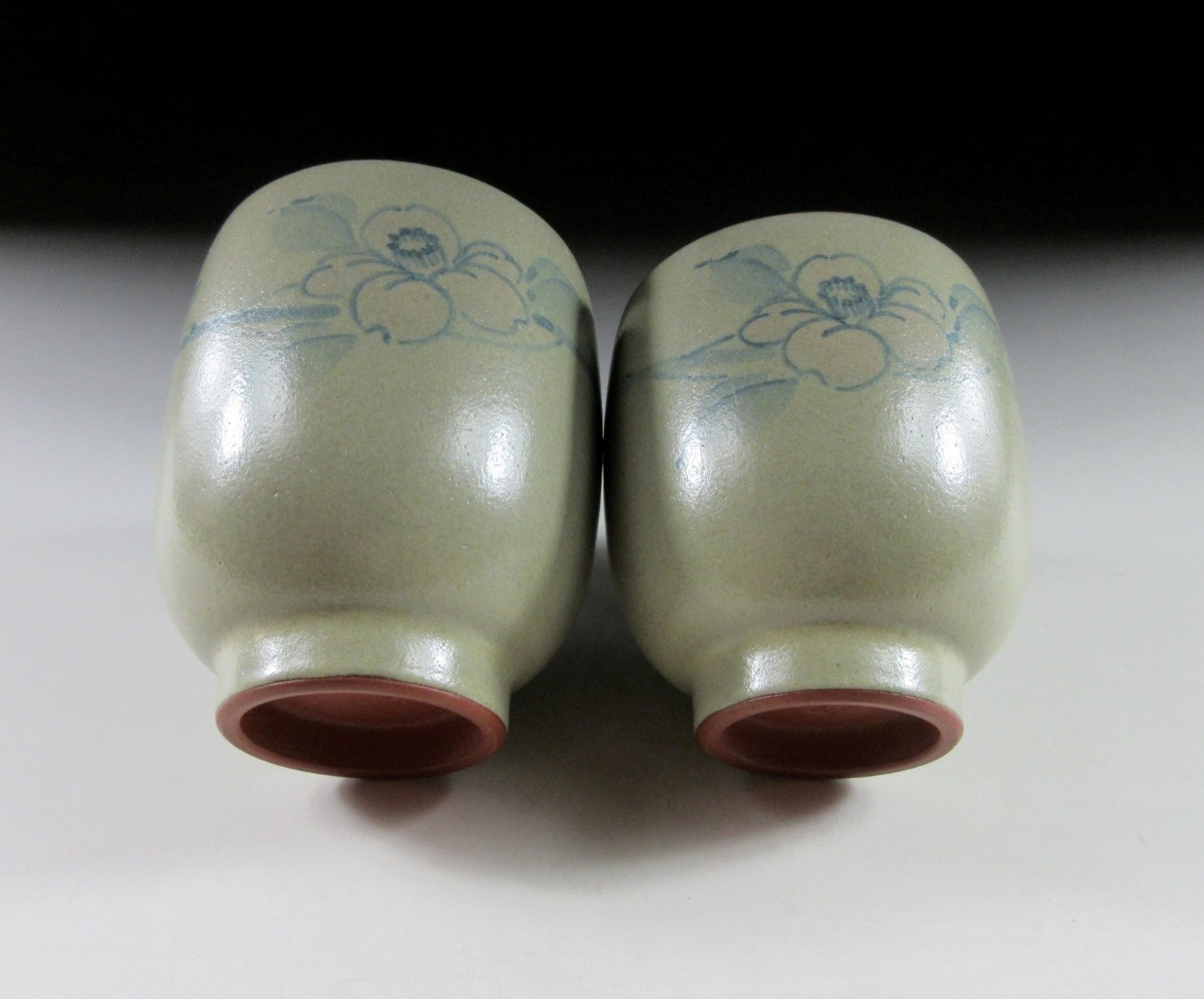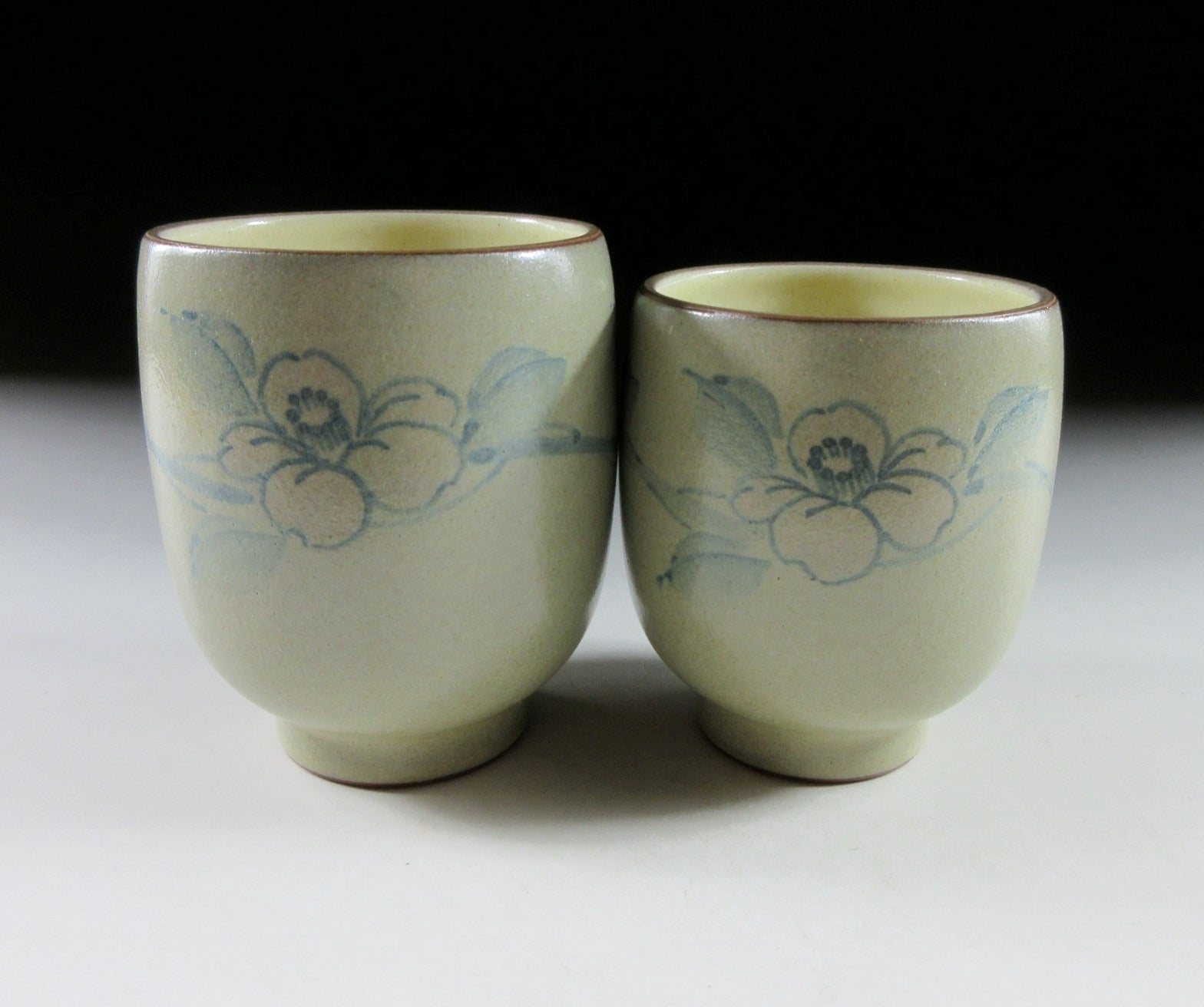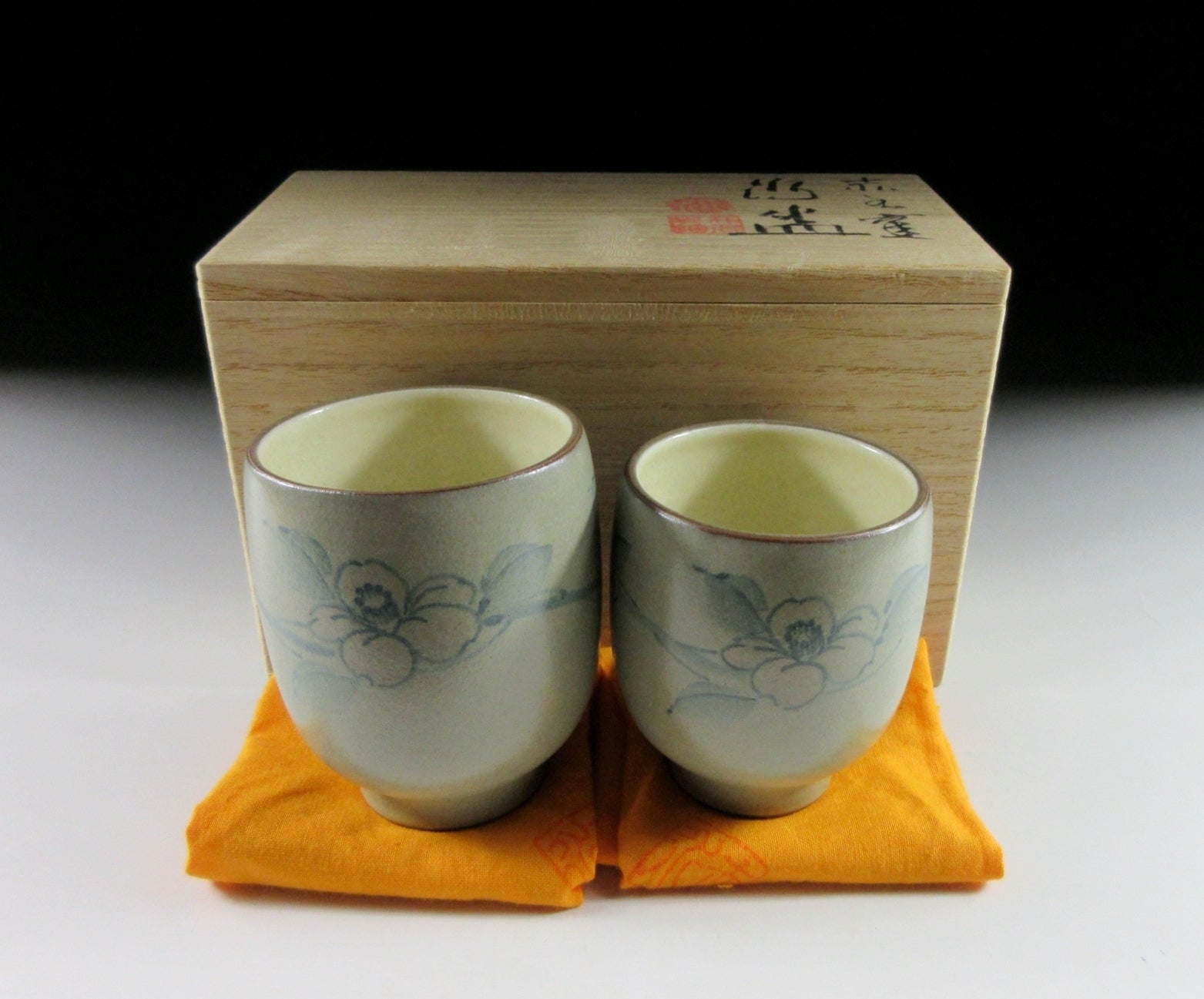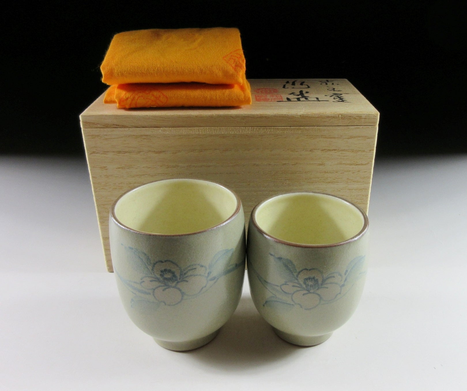 This listing is for a pair of Mumyoi-ware yunomi made by Living National Treasure, Ito Sekisui V. They are wheel-thrown and decorated with hand-painted tsubaki flowers over a tan coloured background base. This particular set is what we call meoto style, meaning they are two different sizes and often referred to as a husband and wife pair. The stamp of the potter can be found on the bottom of each piece, and they come with their original signed wooden storage box. They also come with two stamped turmeric coloured wrapping cloths for when the cups are not in use.