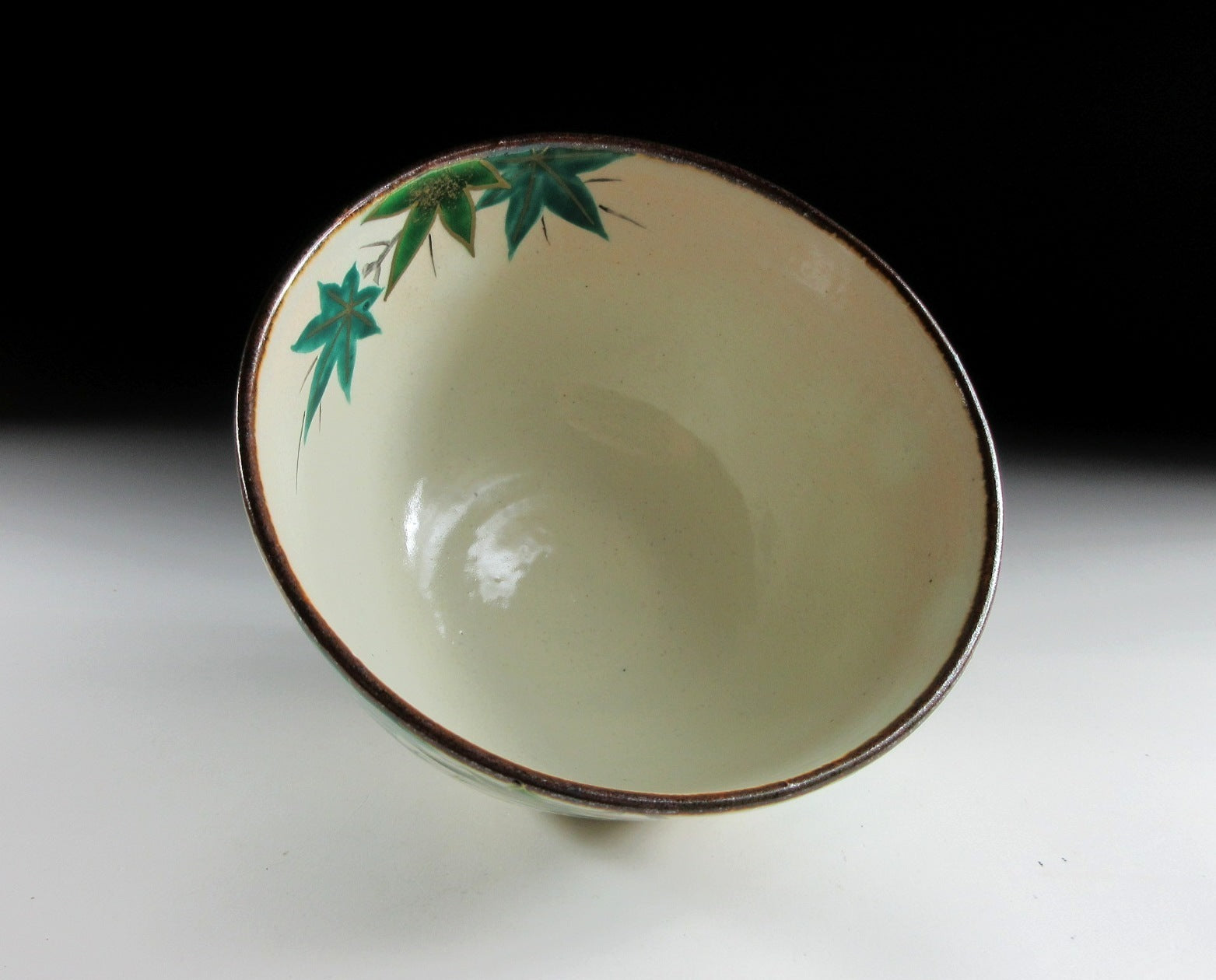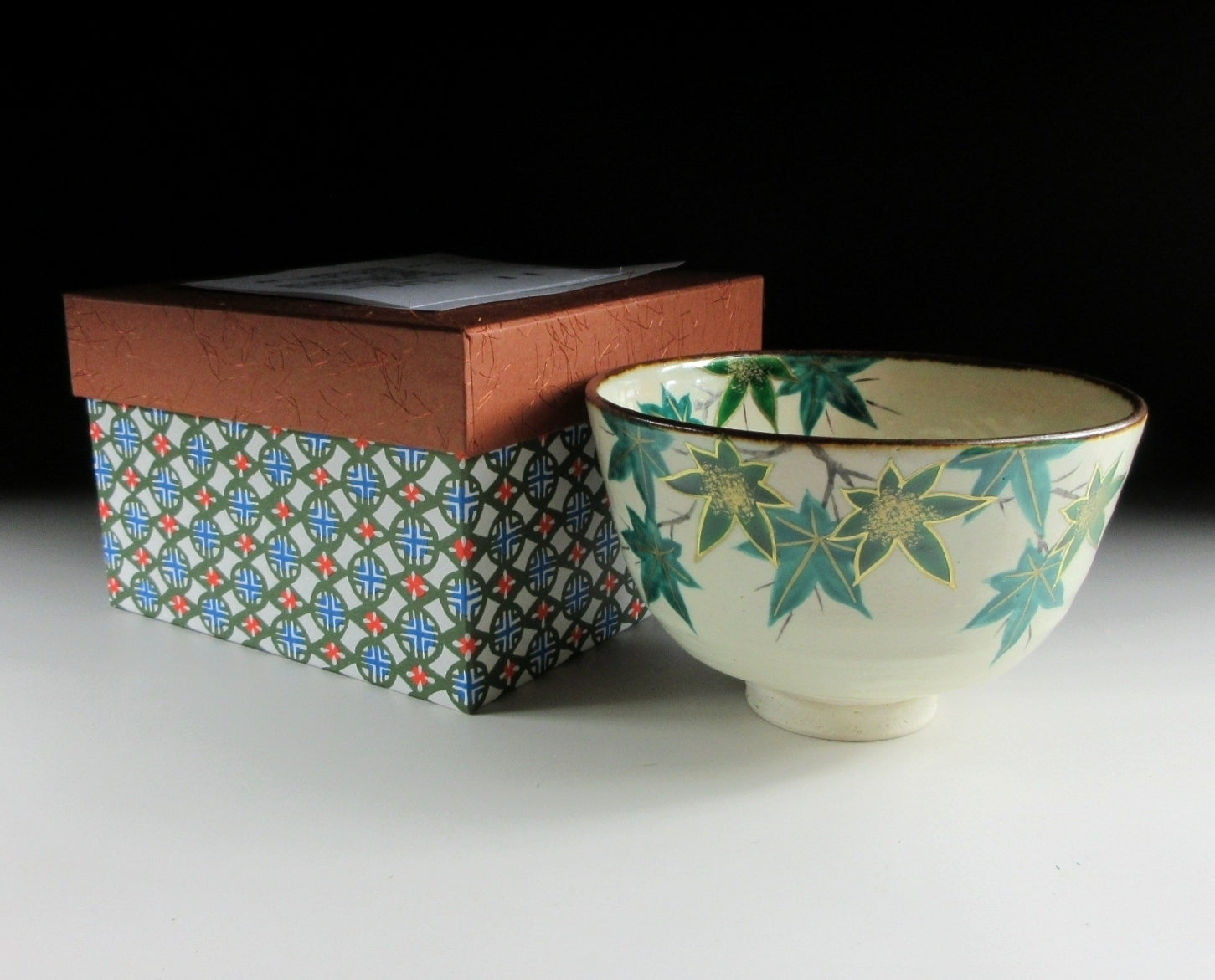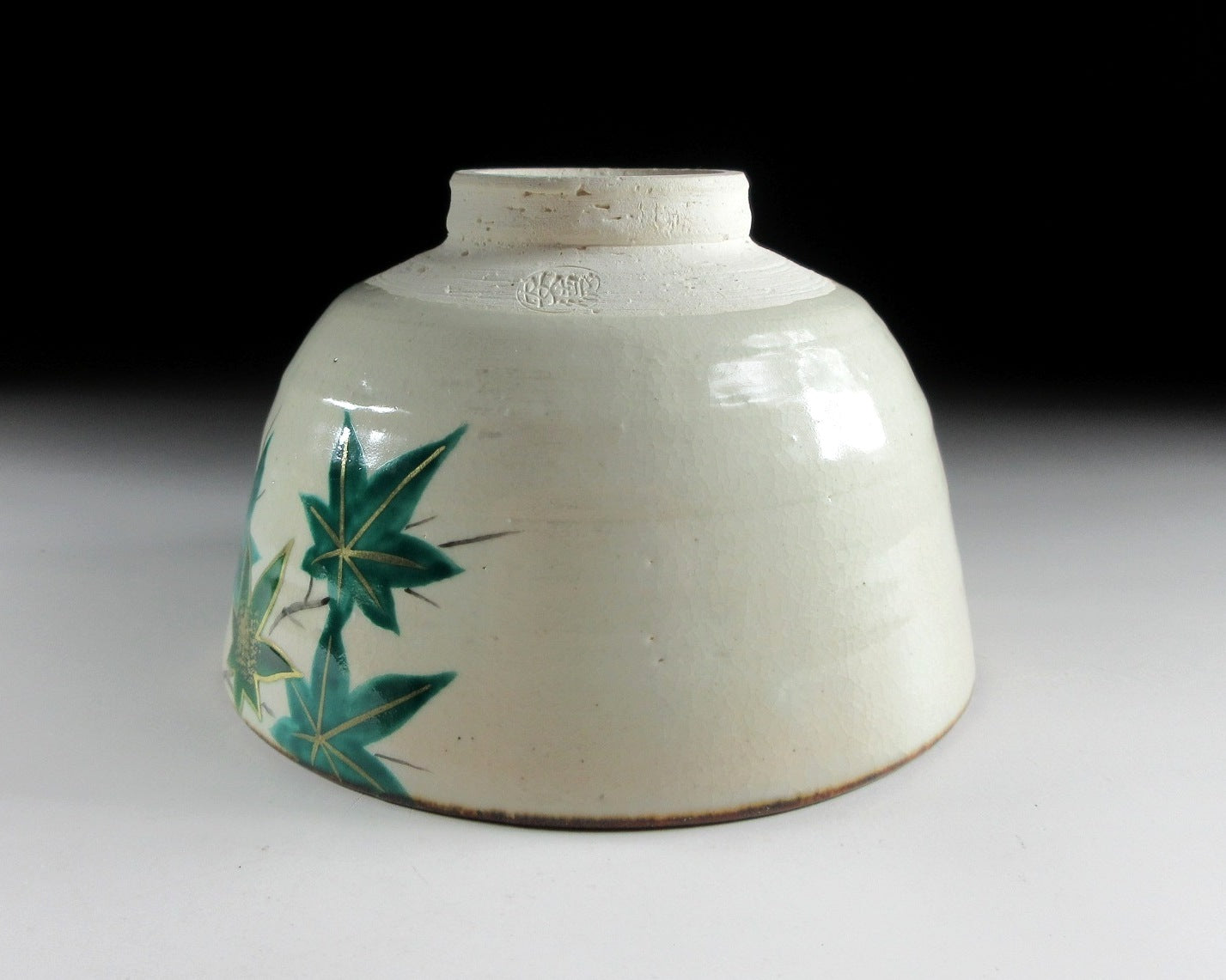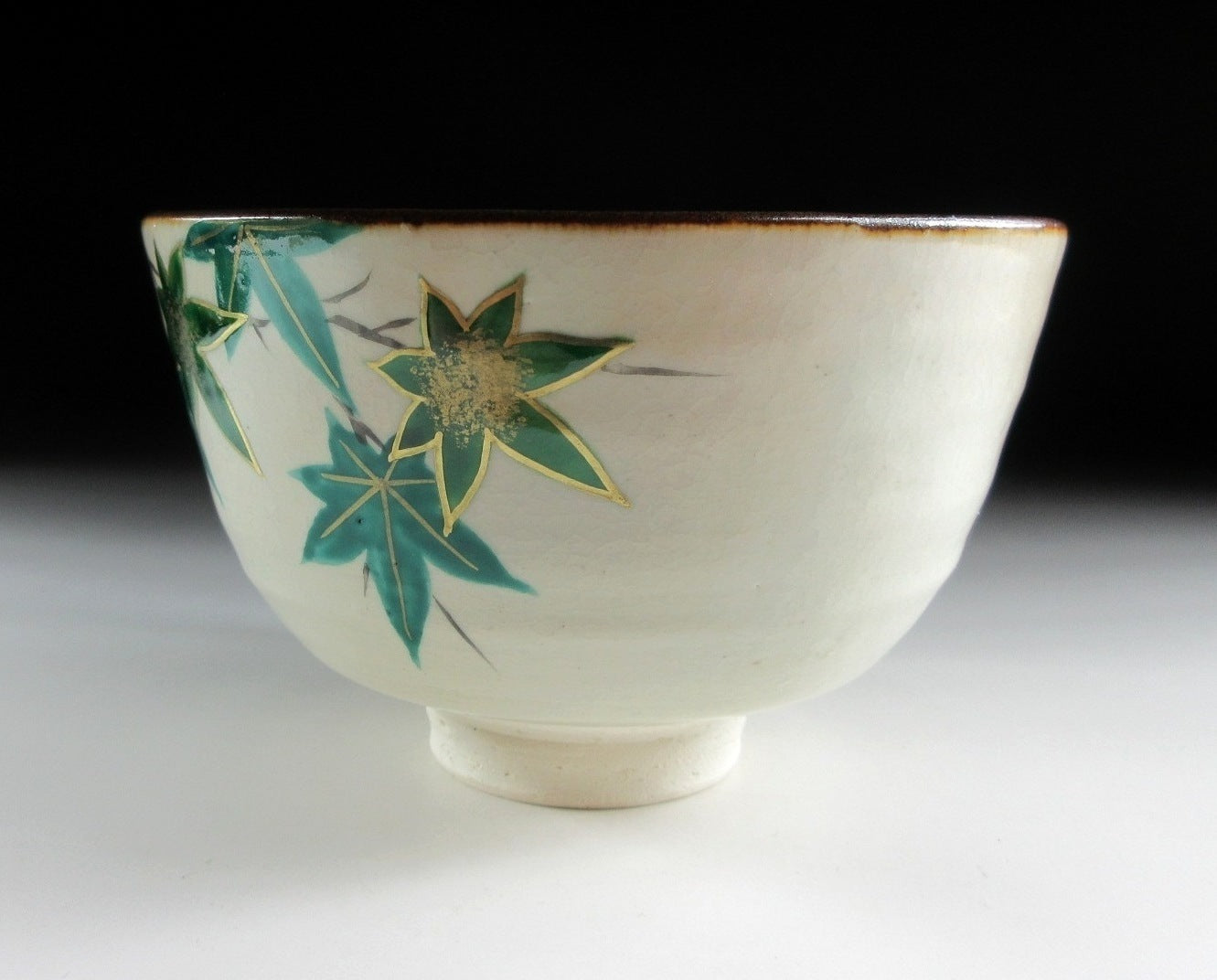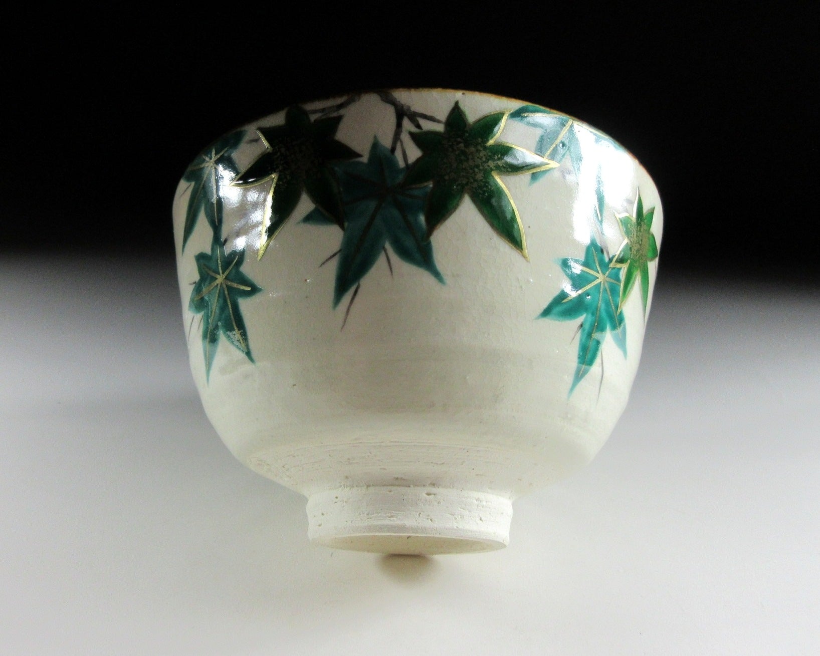 This listing is for an attractive Kyo-ware chawan made around 20 years ago by noted potter, Maeda Hosen. It is wheel-thrown and decorated with green kaede leaves trimmed with gold overglaze. Kaede is the original name for the Japanese maple tree, and it translates as ‘frog hand’. Maples leaves have been depicted in Japanese art, poetry, and literature for thousands of years. Many traditional Japanese works of art and poems are about the cool wind gently blowing fresh green kaede leaves in summer, or the falling of maple leaves in late autumn. The piece has a nice deep shape for whisking and is relatively lightweight. The stamp of the potter can be found on the bottom, and it comes with its original paper storage box. It also comes with a Japanese language profile paper about the potter. *PLEASE NOTE THAT THE TEA WHISK AND TEA SCOOP ARE NOT INCLUDED IN THIS LISTING.