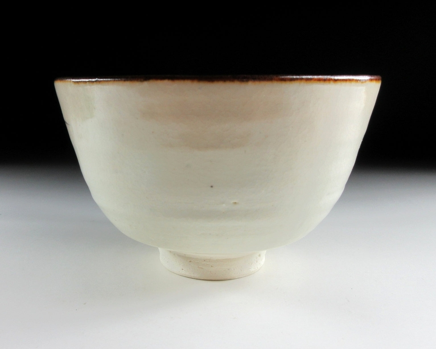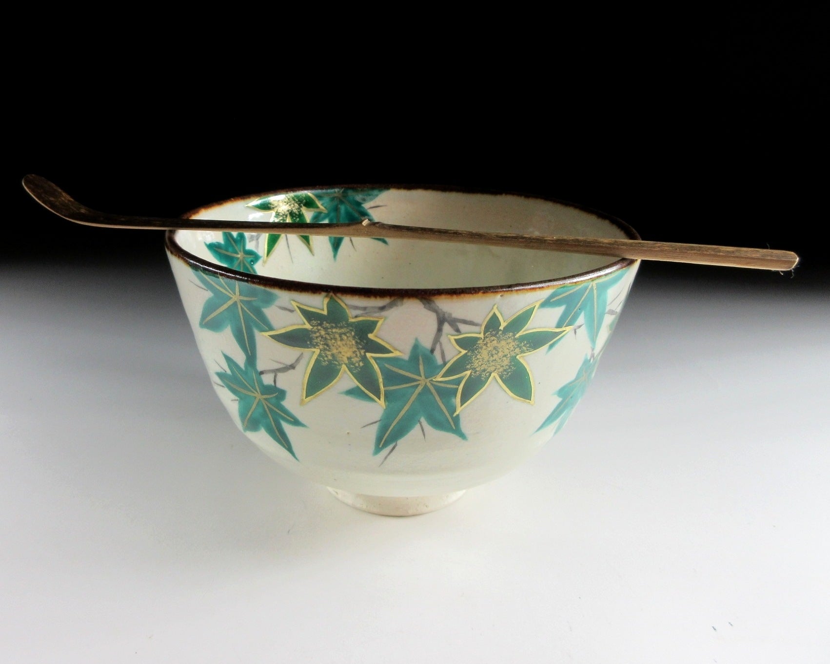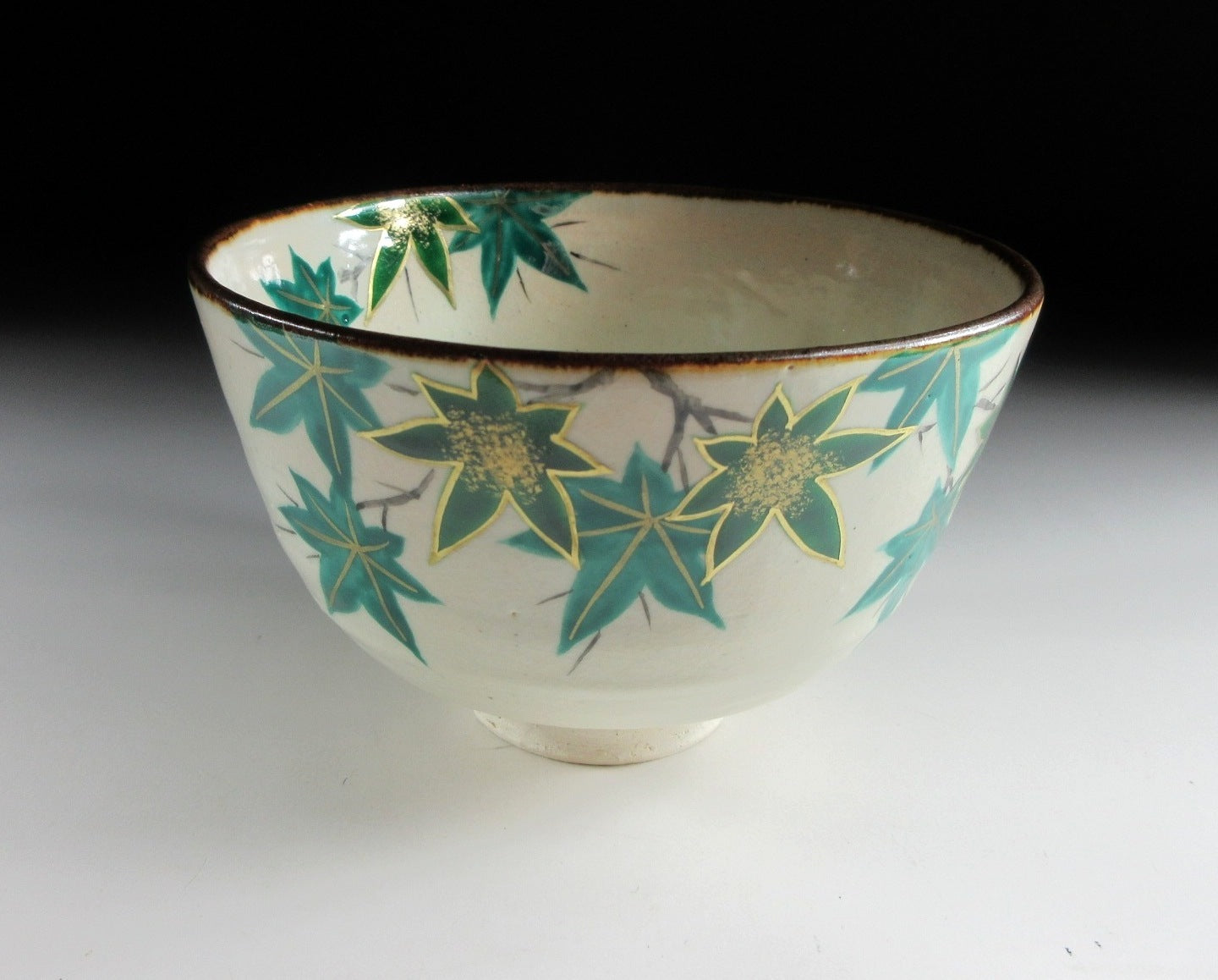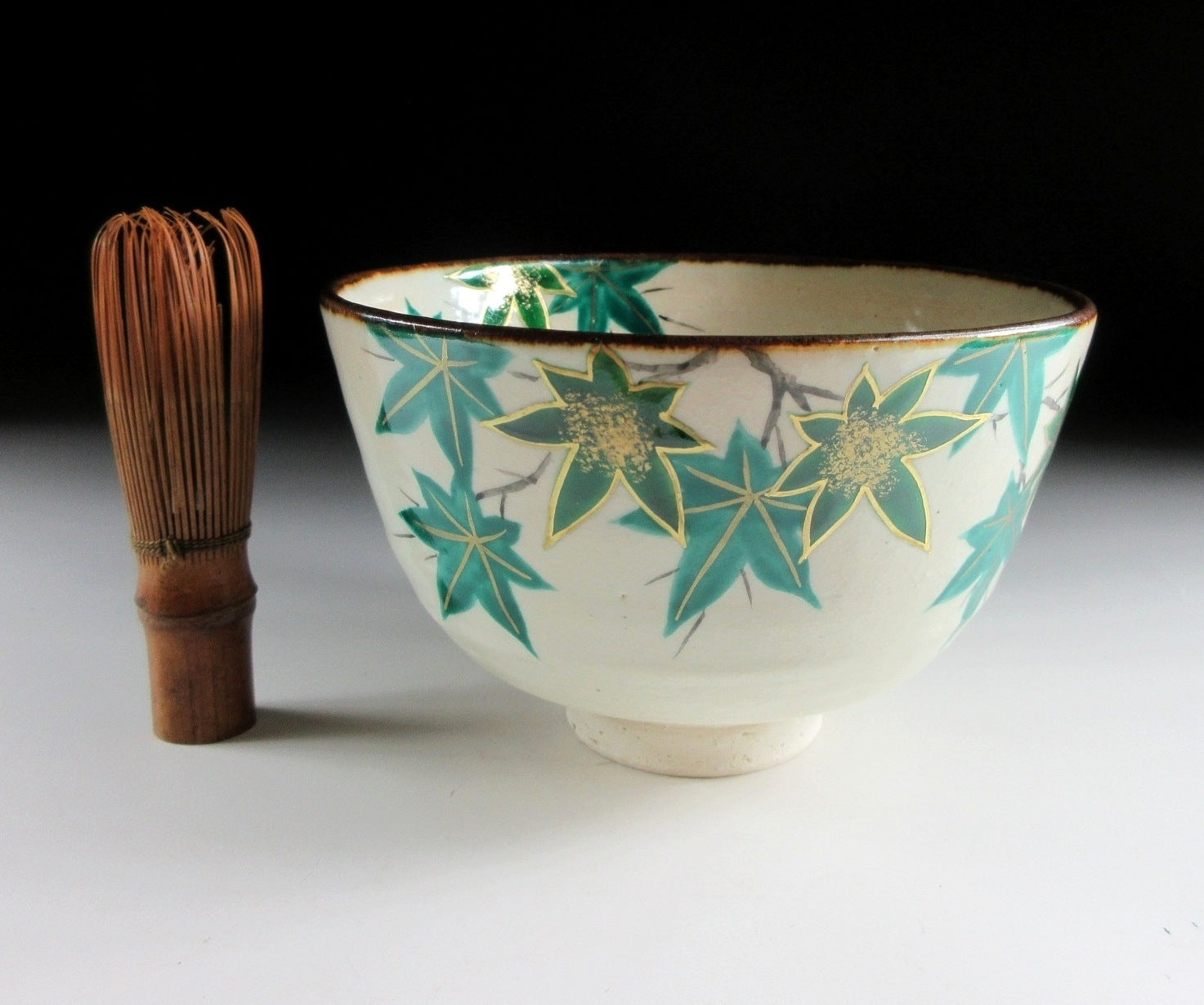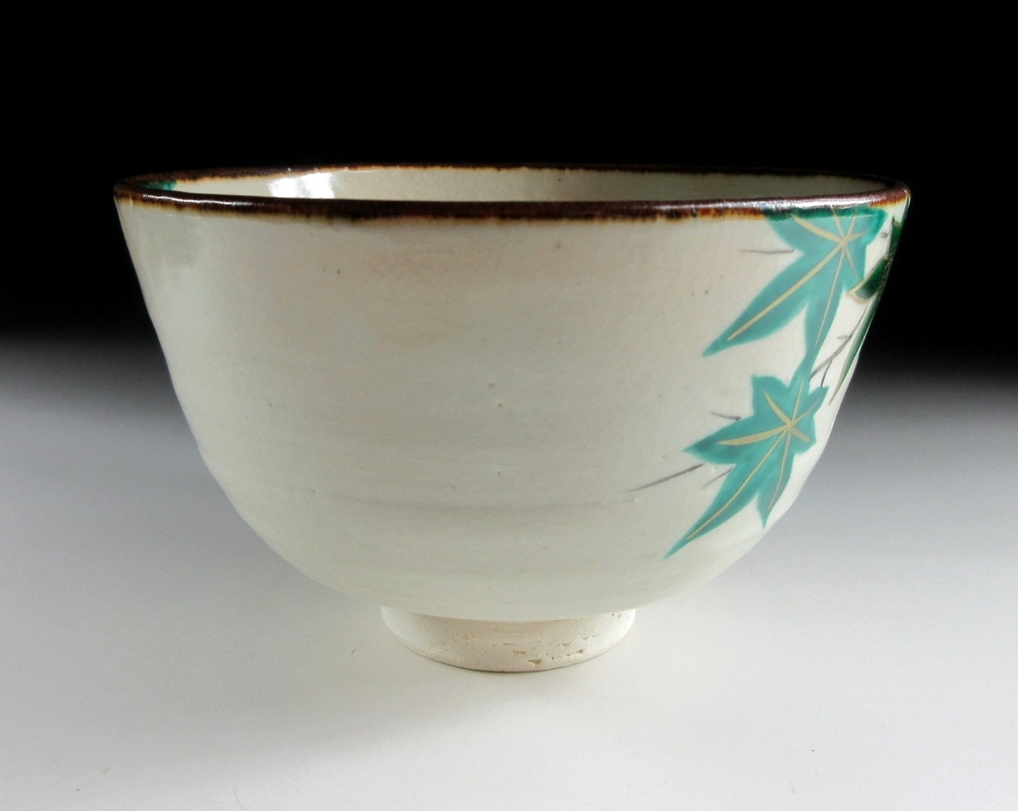 This listing is for an attractive Kyo-ware chawan made around 20 years ago by noted potter, Maeda Hosen. It is wheel-thrown and decorated with green kaede leaves trimmed with gold overglaze. Kaede is the original name for the Japanese maple tree, and it translates as ‘frog hand’. Maples leaves have been depicted in Japanese art, poetry, and literature for thousands of years. Many traditional Japanese works of art and poems are about the cool wind gently blowing fresh green kaede leaves in summer, or the falling of maple leaves in late autumn. The piece has a nice deep shape for whisking and is relatively lightweight. The stamp of the potter can be found on the bottom, and it comes with its original paper storage box. It also comes with a Japanese language profile paper about the potter. *PLEASE NOTE THAT THE TEA WHISK AND TEA SCOOP ARE NOT INCLUDED IN THIS LISTING.