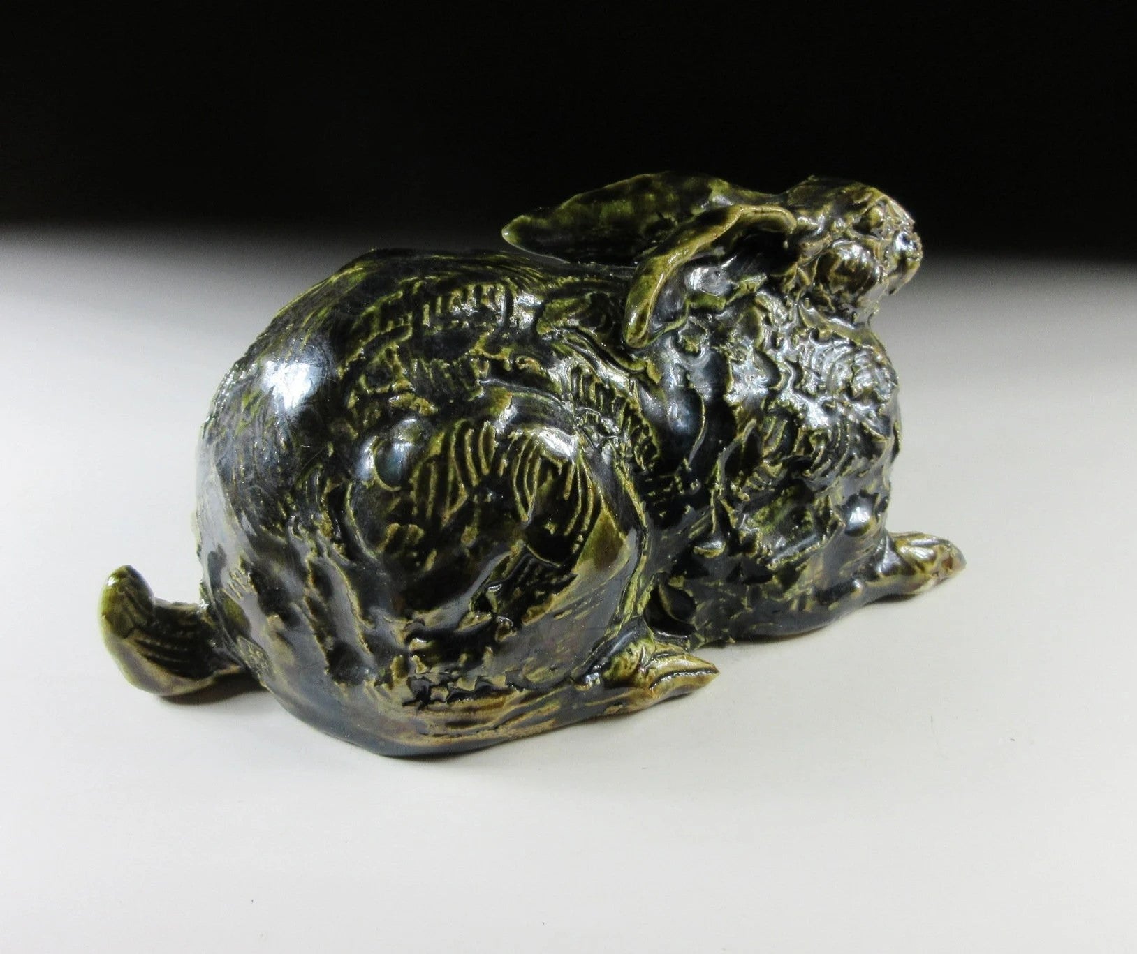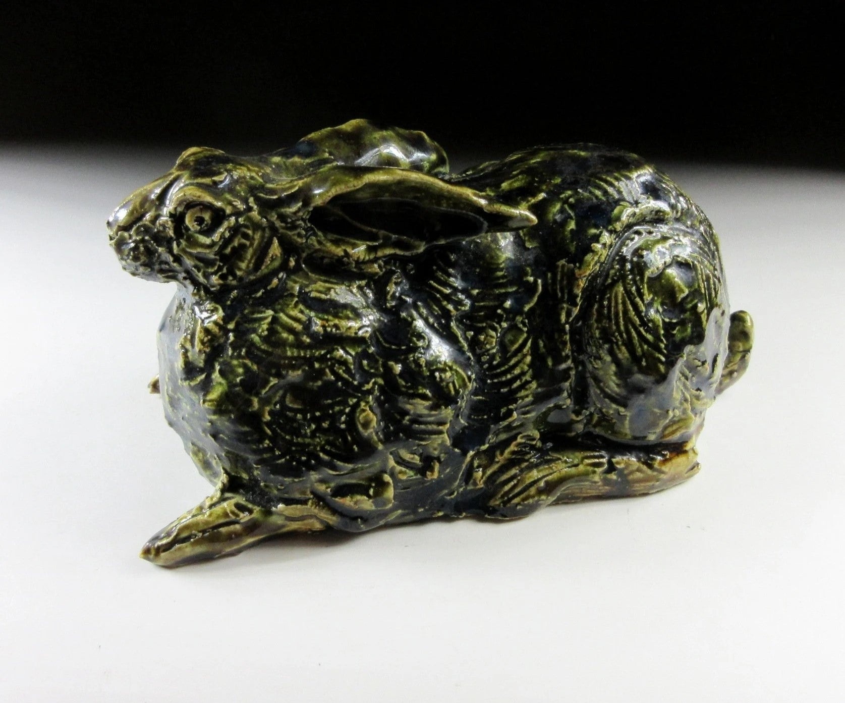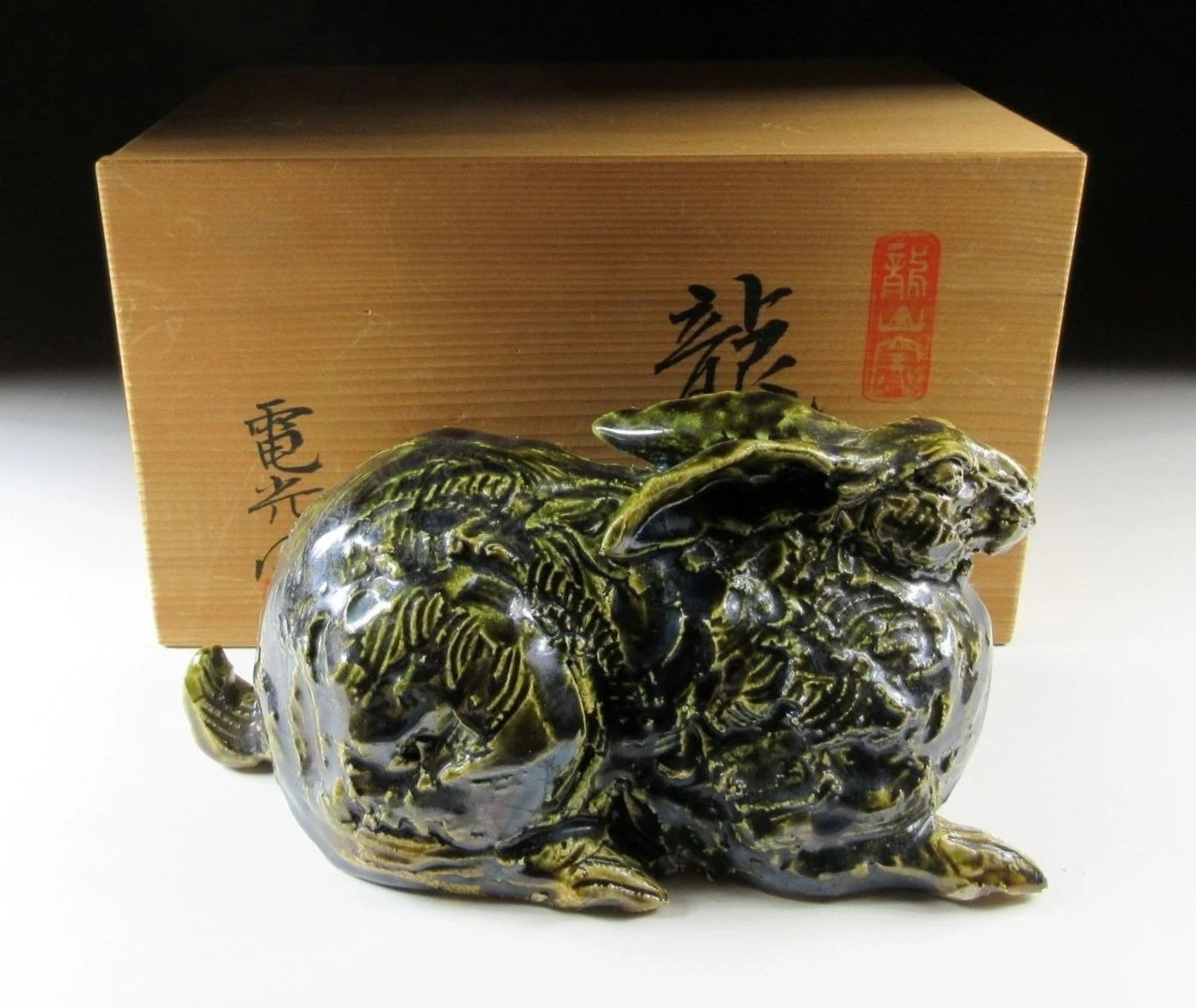This listing is for a splendid Oribe glaze rabbit okimono made around 20-30 years ago by noted potter, Maekawa Denko. It is made from a mould and coated in green copper glaze, and has a wonderfully textured surface. It was most likely made to commemorate the Year of the Rabbit back in either 1987 or 1999. It comes with its original signed wooden storage box.