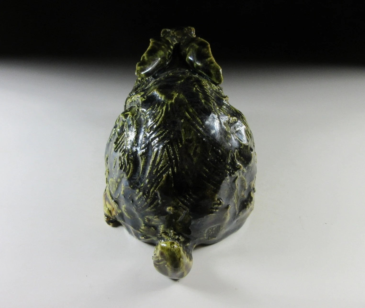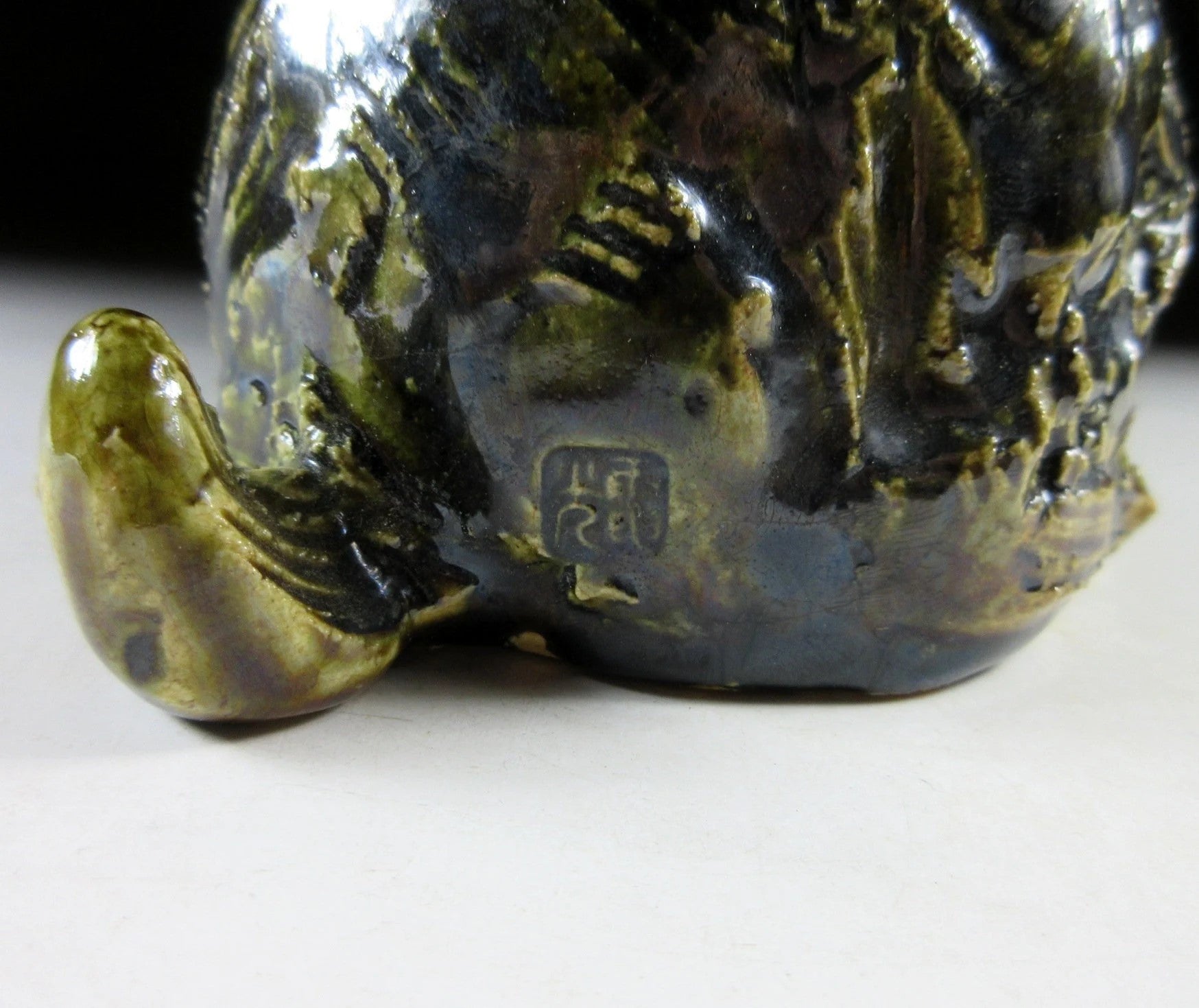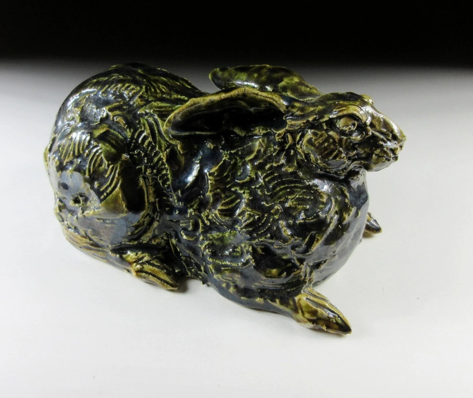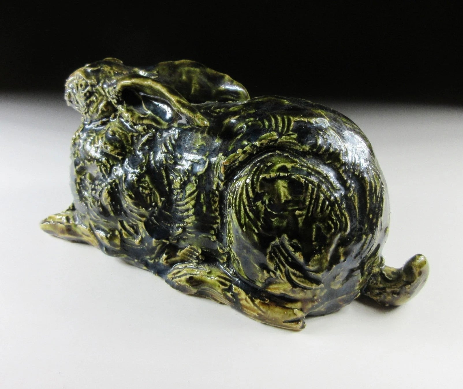 This listing is for a splendid Oribe glaze rabbit okimono made around 20-30 years ago by noted potter, Maekawa Denko. It is made from a mould and coated in green copper glaze, and has a wonderfully textured surface. It was most likely made to commemorate the Year of the Rabbit back in either 1987 or 1999. It comes with its original signed wooden storage box.