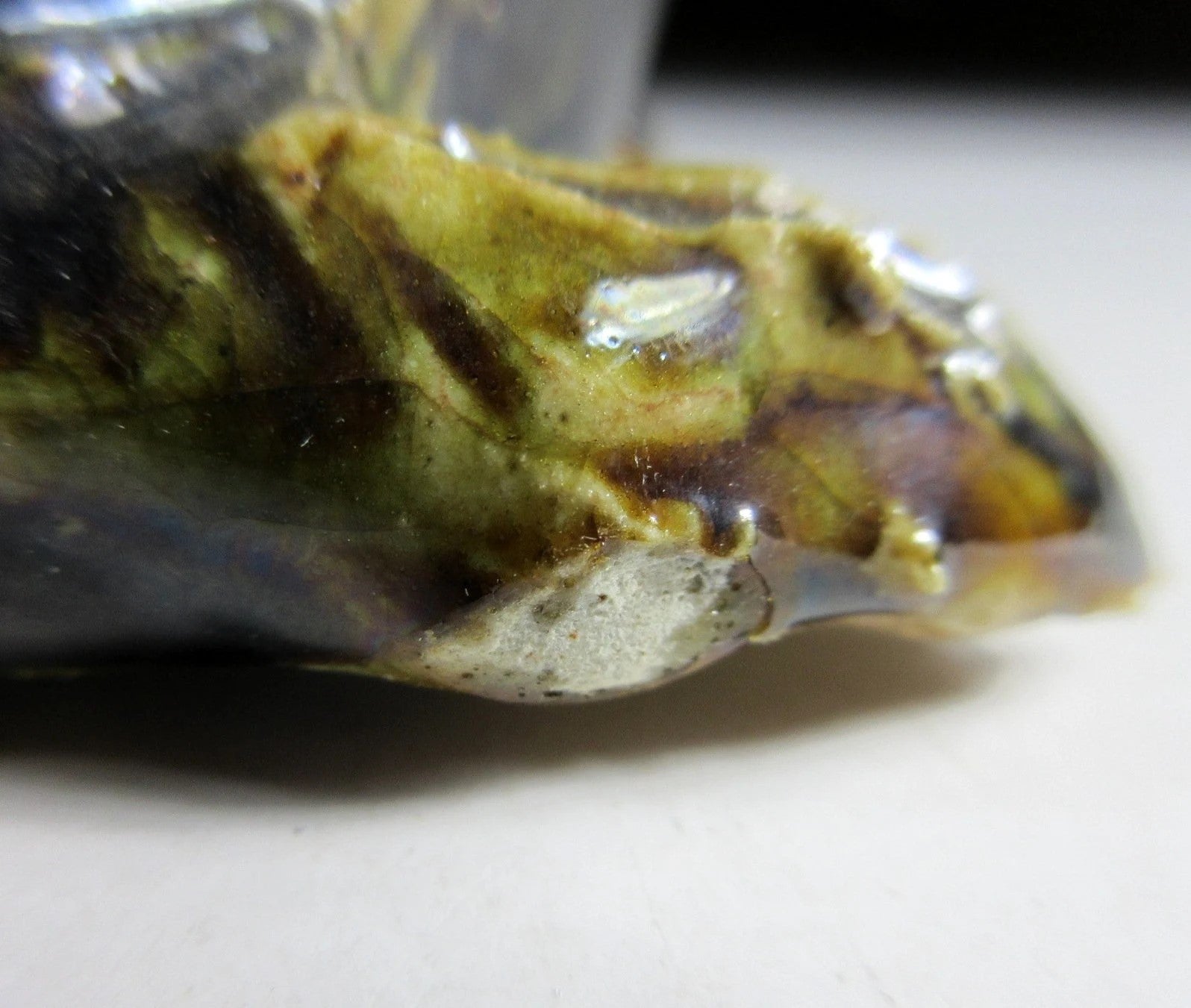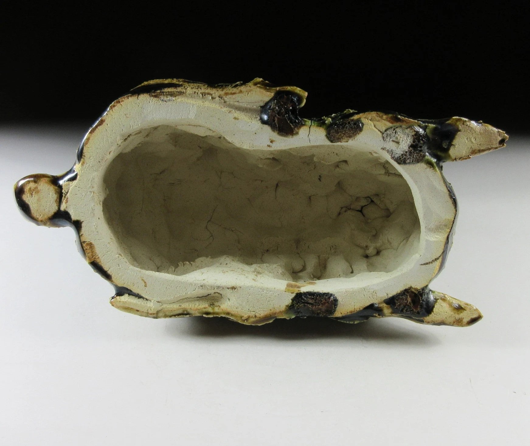 It’s in very good condition aside from a piece of glaze chipped off (or unglazed spot) on one foot, and there’s a firing crack on the bottom.