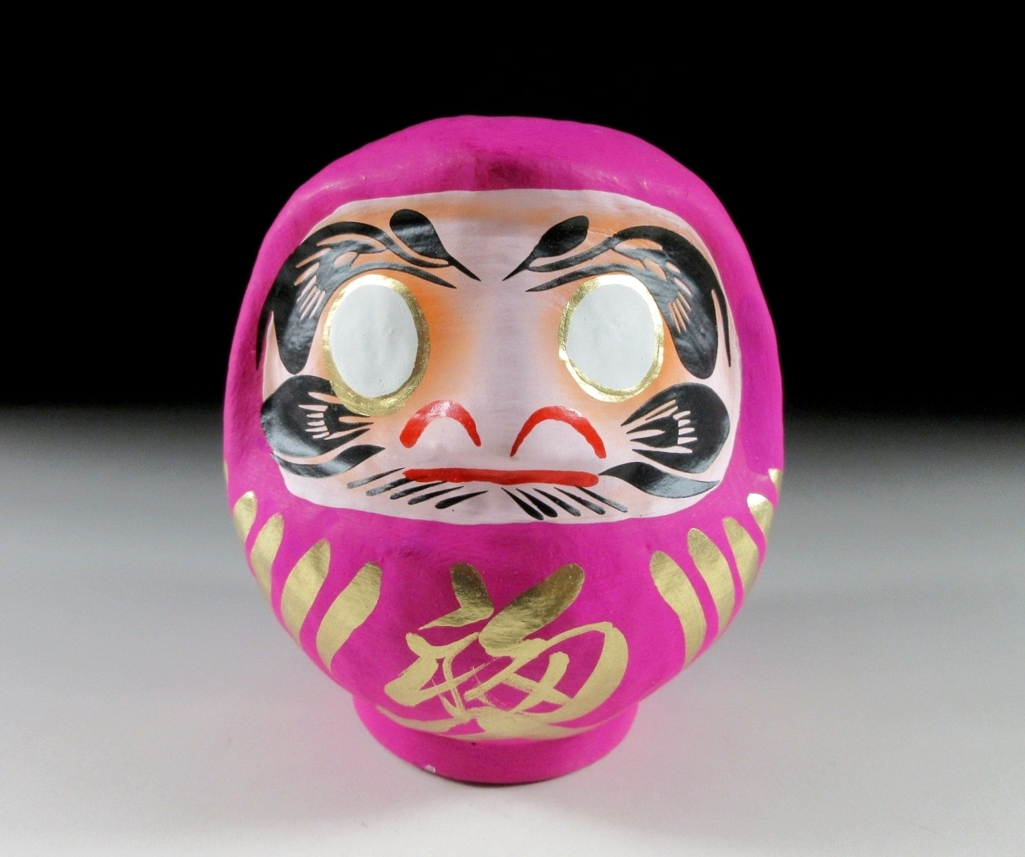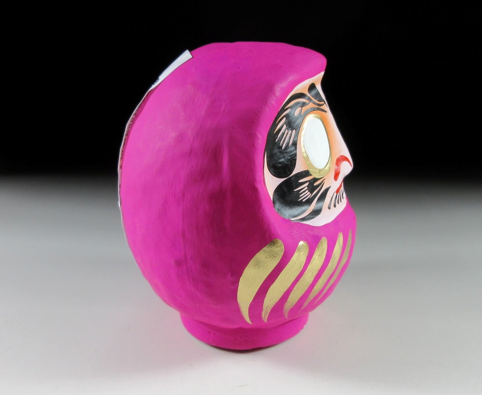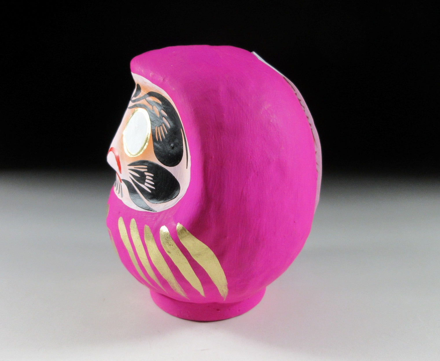 This listing is for a small Takasaki Shorinzan Fuku-Daruma. Daruma is a popular talisman of good luck, especially during New Year. When a Daruma is purchased, the owner paints a pupil on the left eye while making a wish. Once the wish is realised the right pupil is added, and then the Daruma is taken to the local temple to be burned during a special ceremony. The Daruma in this listing is magenta and made of papier-mâché. Magenta Daruma are thought to bring the owner youth, happiness and new beginnings. This Daruma has been blessed at the temple and there’s a blessing paper attached to the back.