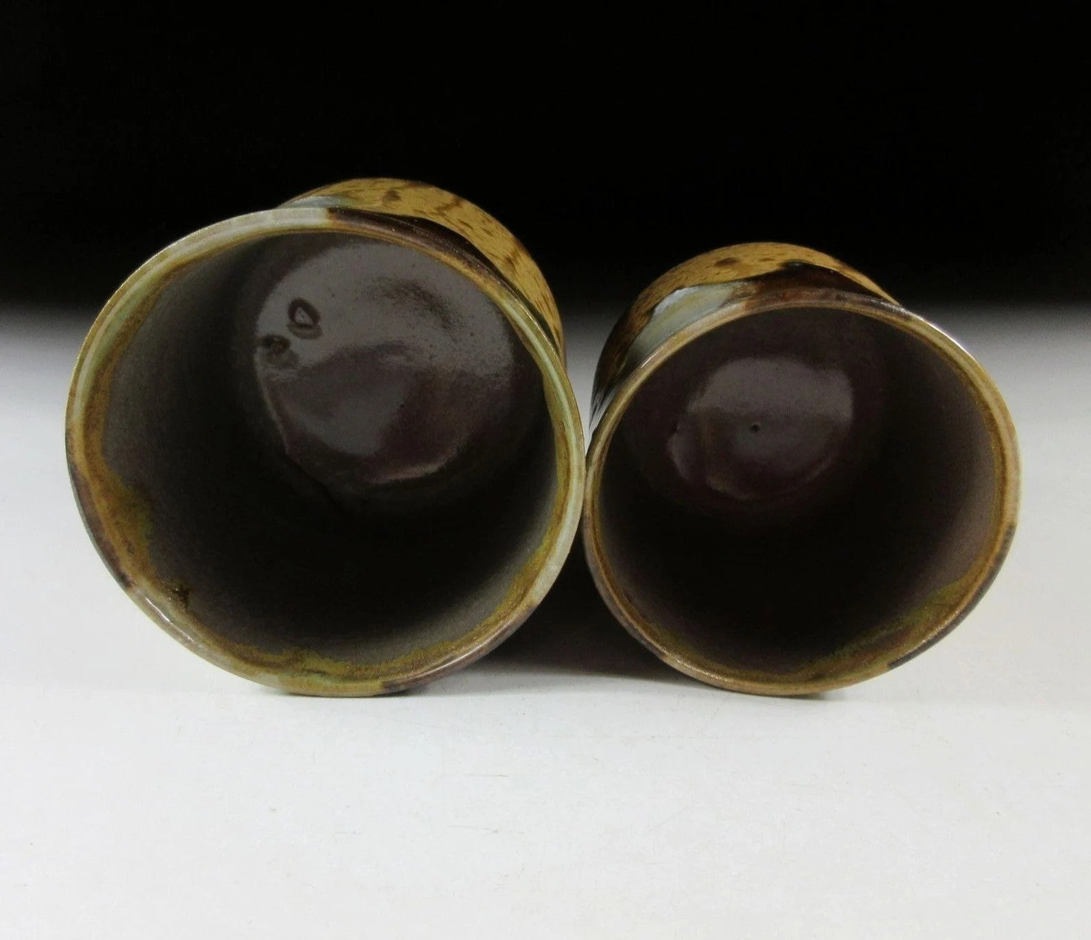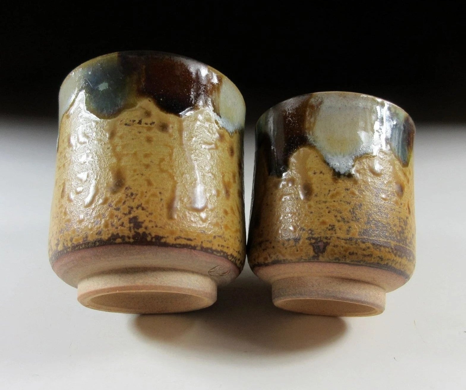 This listing is for a pair of Natsuyoshi-ware yunomi tea cups made around 30 years ago by Mano Gazan. They are wheel-thrown and feature a combination of brown, white and blue-green glaze over a yellow Irabo style glazed base. The cups have natural ash glaze drips trailing down the sides, and they are made of high fired stoneware clay. The stamp of the potter can be found on the bottom of each cup, and they come with their original signed wooden storage box. They also come with a Japanese language profile about the potter. * THESE CUPS ARE QUITE SMALL, PLEASE CHECK THE MEASUREMENTS CAREFULLY BEFORE PURCHASING.