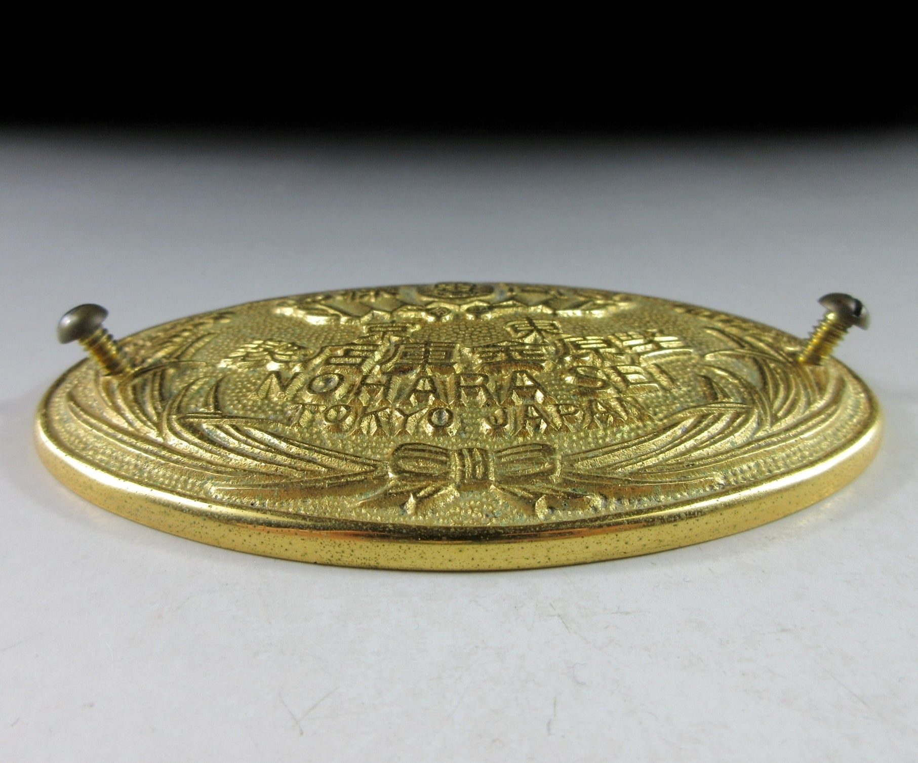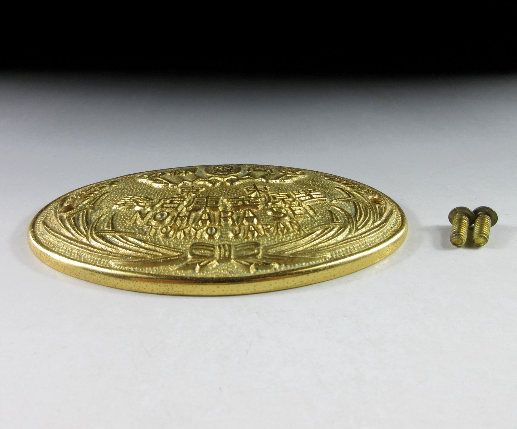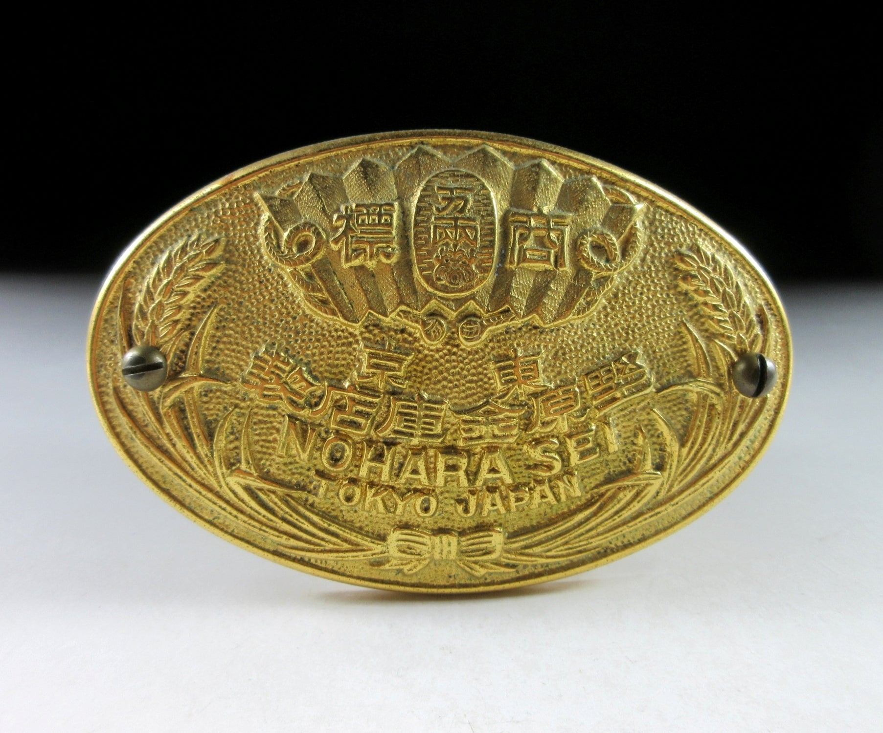 This listing is for a manufacturer’s badge removed from a metal safe. The safe was manufactured by Nohara Safe Manufacturing Co., Ltd. and was owned by a prominent family in downtown Tokyo. Nohara Manufacturing was established in 1917 and is located in Kawasaki City in Kanagawa Prefecture. These days they mainly produce fireproof safes as well as metal office furniture.