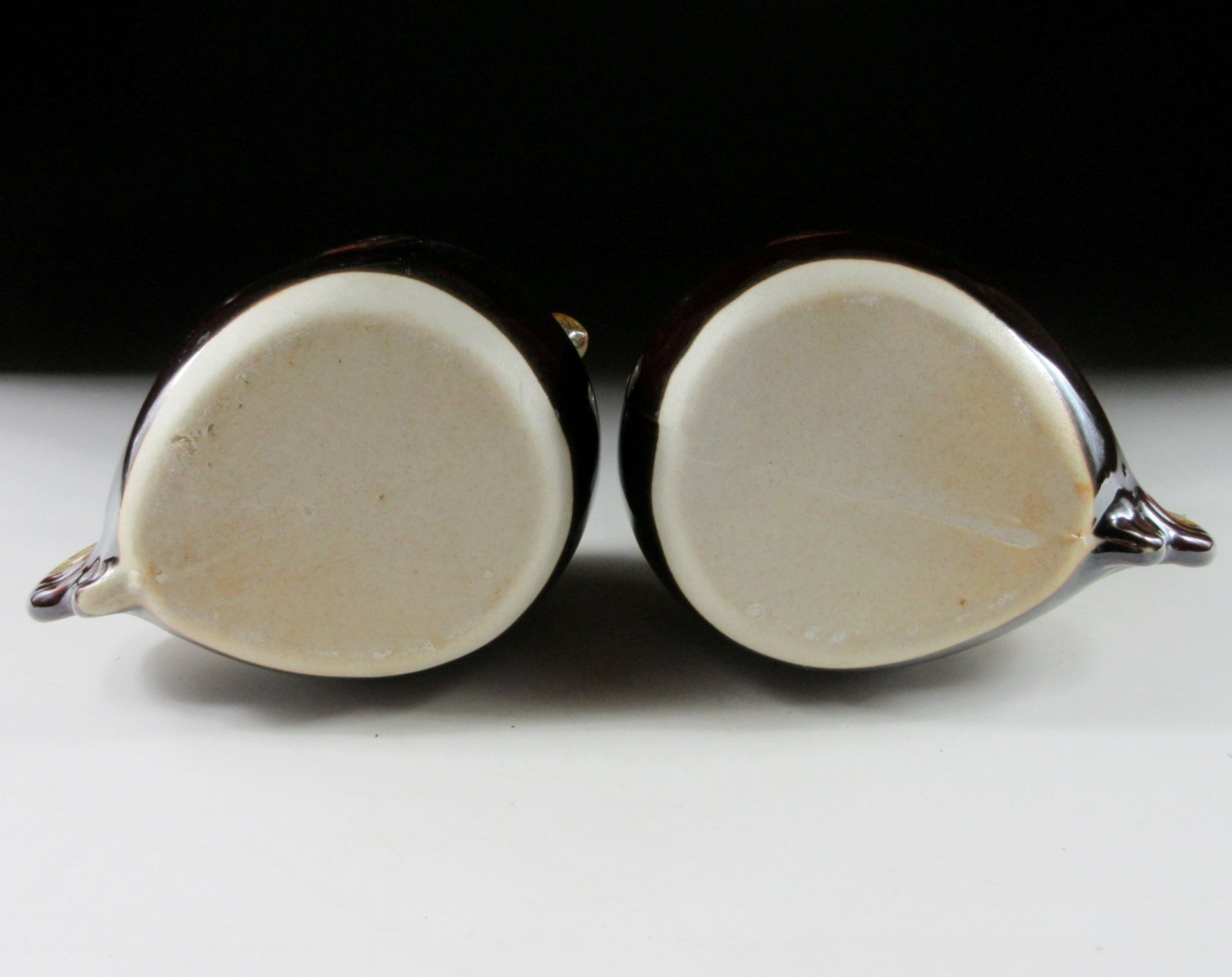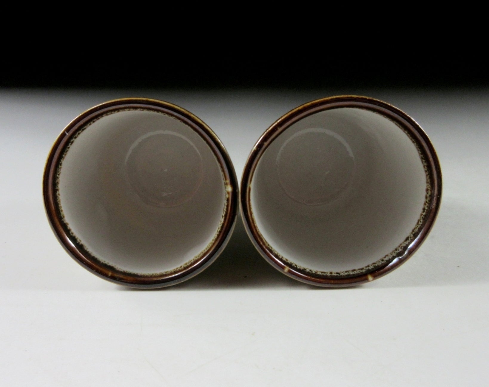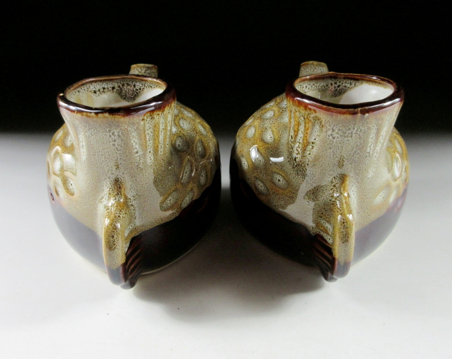 This listing is for a vintage Mashiko-ware fugu sake set, made about 20 years ago. The set includes two fugu tokkuri, and two small cups. They were made using press moulds and are unsigned. This particular item comes in several colours, and the fugu have names. These portly gentlemen are the fugu brothers from Mashiko. This is the double brown set, and this fugu’s name is Saburo (third son). Saburo’s drink preference is karakuchi dry tasting sake. We actually had lots of fun researching this.