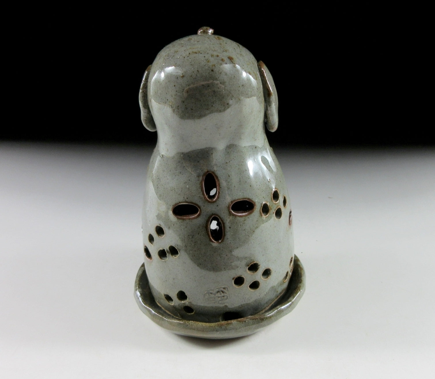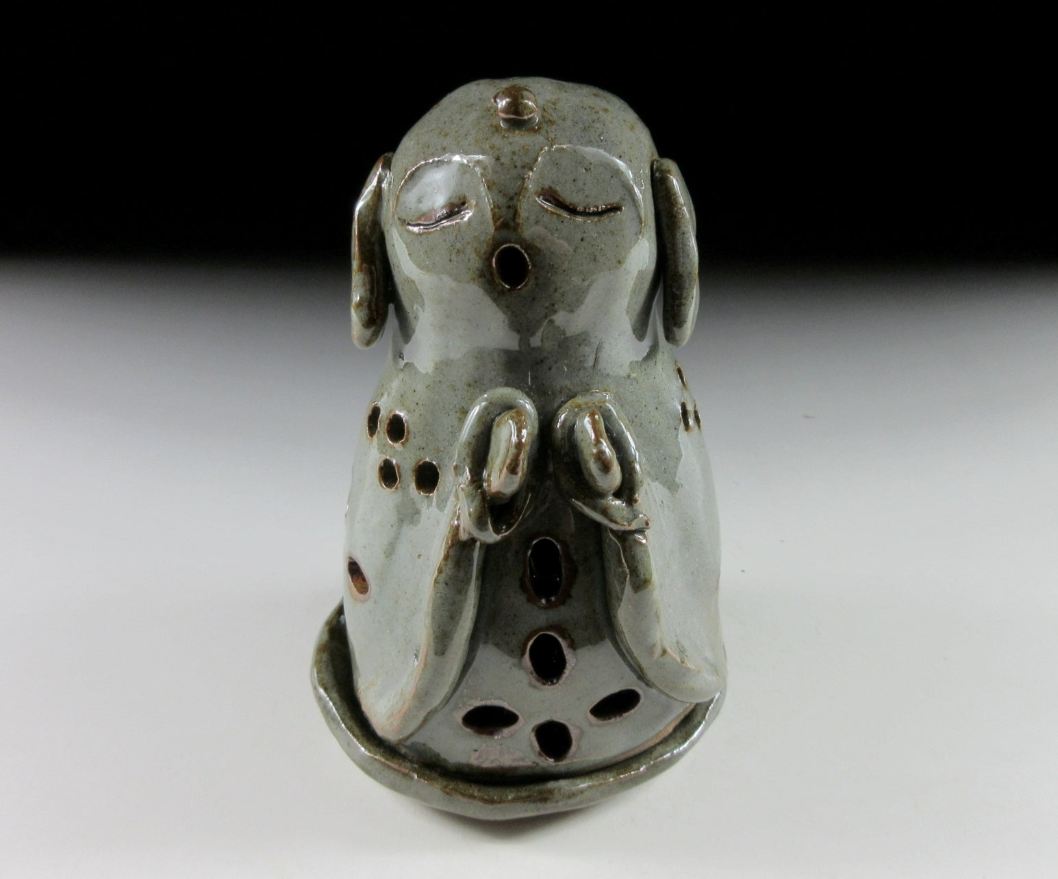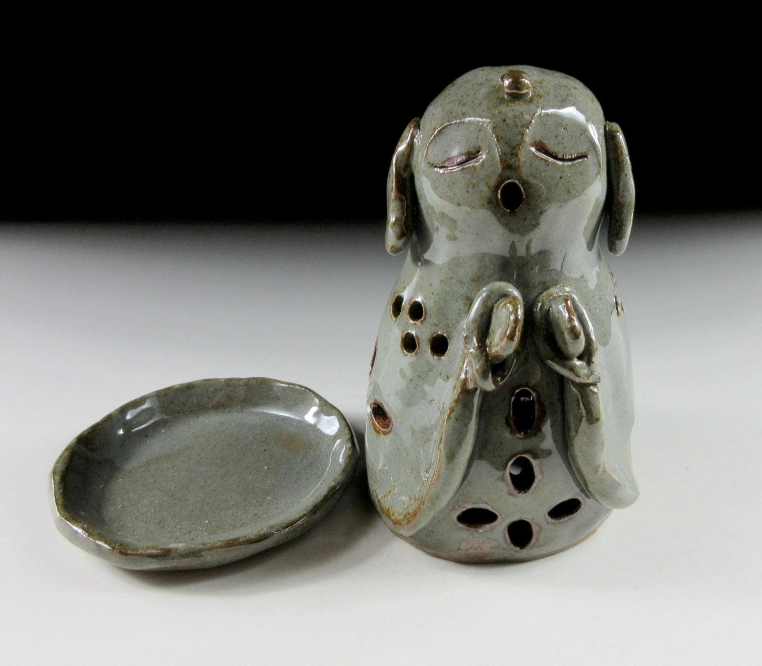This listing is for a small wood-fired Mashiko-ware Jizo incense burner made by Fukurou Gama. It is made of high-fired stoneware and moulded to resemble Jizo Bosatsu. Jizo is a deity who answers prayers for good health, success, and children. This little monk-like character is one of the most respected deities in Japan, and temples sometimes have areas like caves containing hundreds of small Jizo statues. Jizo eases suffering and can often be found along travel routes and paths, his purpose being to point you in the right direction in life. The particular item has numerous vents carved into Jizo’s robes, and is best suited to burning cone incense. The stamp of the kiln can be found on the back.