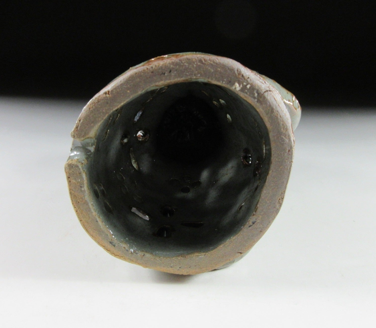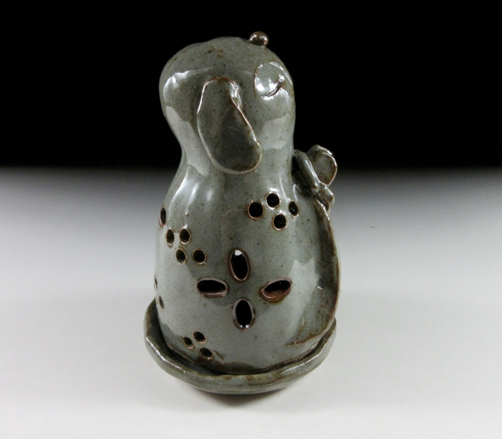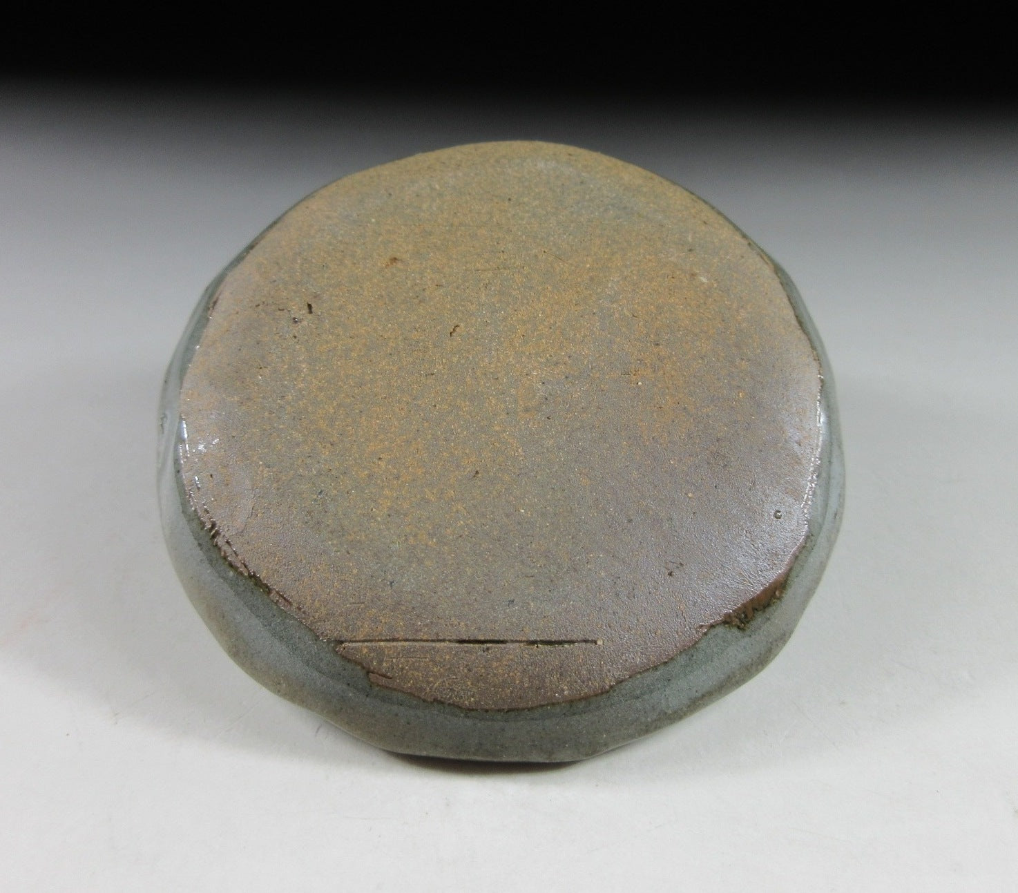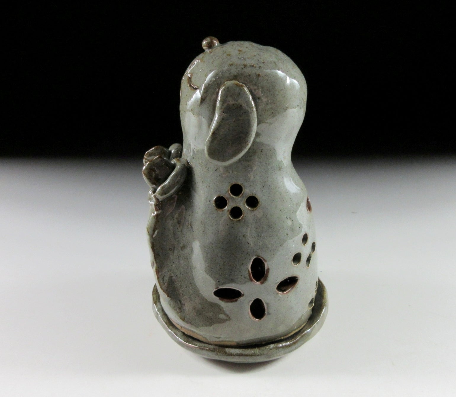 This listing is for a small wood-fired Mashiko-ware Jizo incense burner made by Fukurou Gama. It is made of high-fired stoneware and moulded to resemble Jizo Bosatsu. Jizo is a deity who answers prayers for good health, success, and children. This little monk-like character is one of the most respected deities in Japan, and temples sometimes have areas like caves containing hundreds of small Jizo statues. Jizo eases suffering and can often be found along travel routes and paths, his purpose being to point you in the right direction in life. The particular item has numerous vents carved into Jizo’s robes, and is best suited to burning cone incense. The stamp of the kiln can be found on the back.