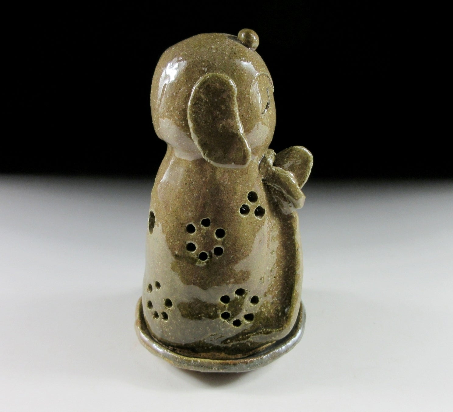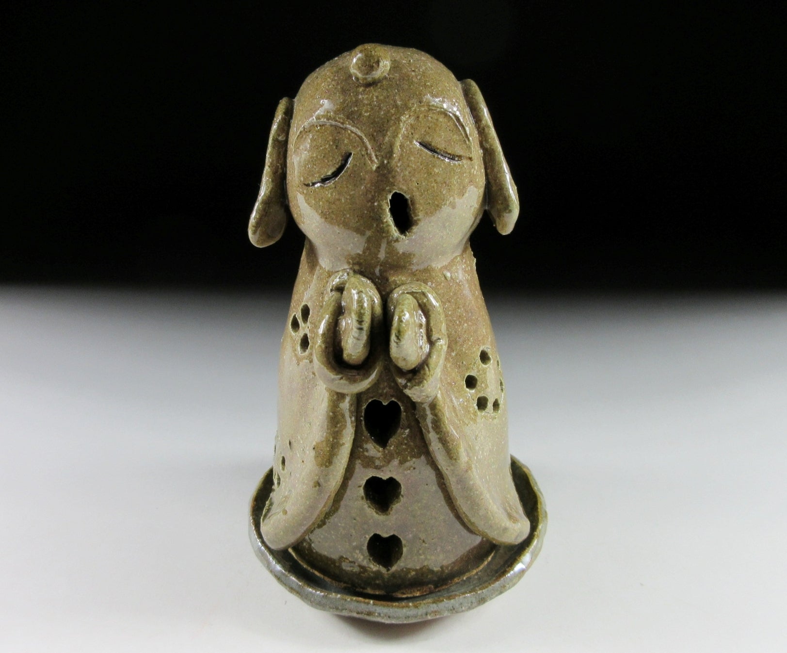 This listing is for a small wood-fired Mashiko-ware Jizo incense burner made by Fukurou Gama. It is made of high-fired stoneware and moulded to resemble Jizo Bosatsu. Jizo is a deity who answers prayers for good health, success, and children. This little monk-like character is one of the most respected deities in Japan, and temples sometimes have areas like caves containing hundreds of small Jizo statues. Jizo eases suffering and can often be found along travel routes and paths, his purpose being to point you in the right direction in life. The particular item has numerous vents carved into Jizo’s robes, and is best suited to burning cone incense.