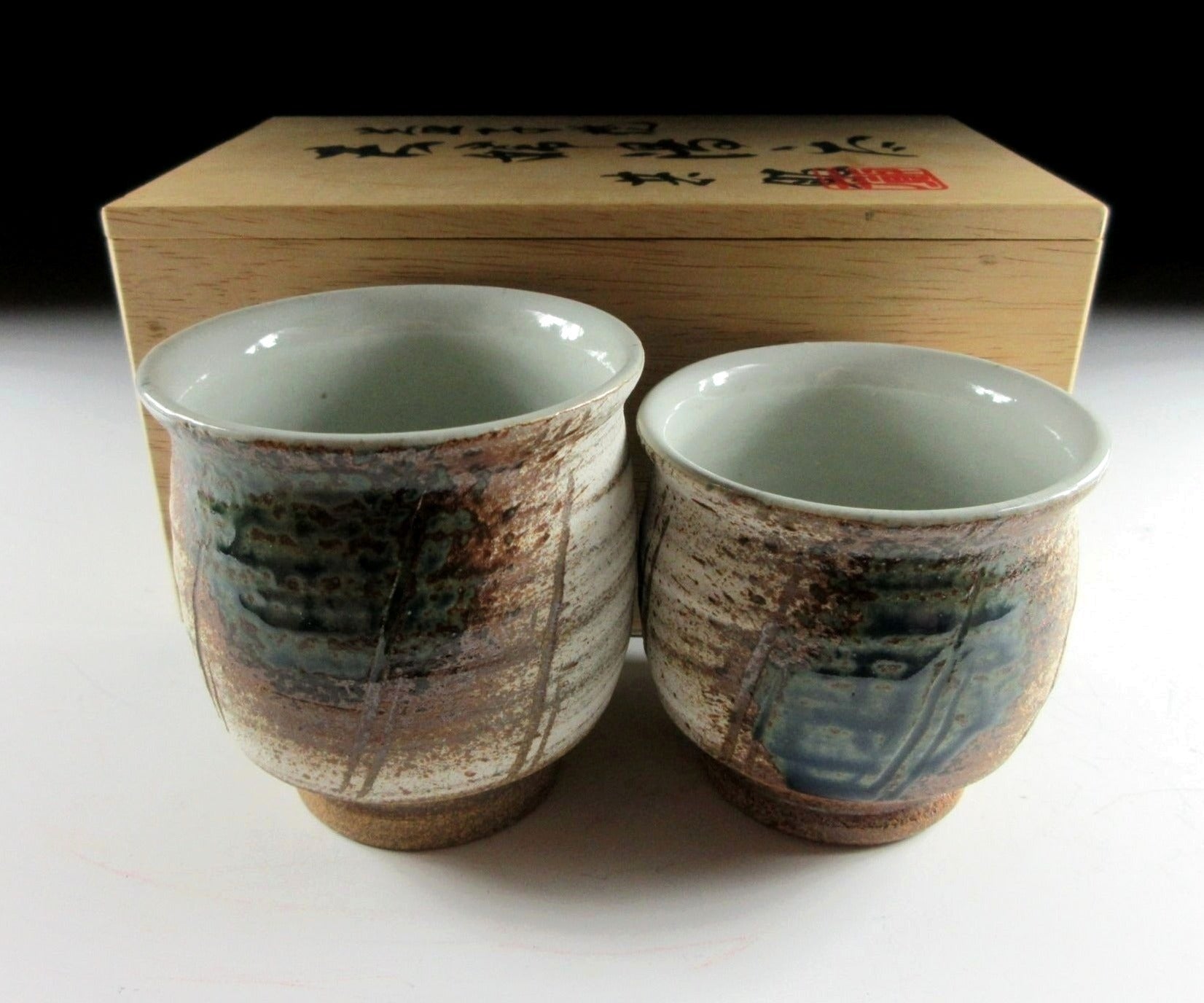This listing is for a pair of Mashiko-ware yunomi tea cups made around 20 years ago. They are wheel-thrown and decorated with splattered iron and green-blue glaze over a white glazed base. Also these cups are what we call meoto style, meaning they are two different sizes and often referred to as a husband and wife pair. They come with their original signed wooden storage box. *PLEASE NOTE THAT THE BAMBOO TEA SCOOP IS NOT INCLUDED.