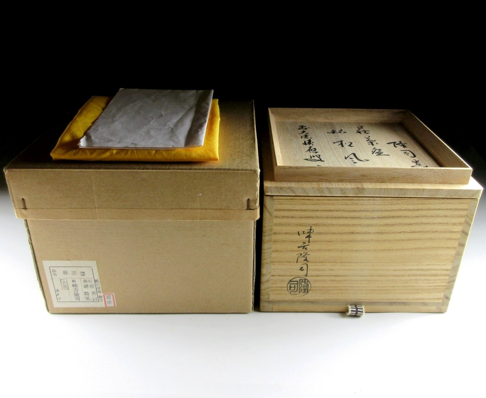 This listing is for a splendid Hagi-ware chawan made around 20 years ago by Mashita Takashi. It is made of gritty stoneware clay and features a combination of ‘biwa’ loquat glaze with white glaze trailing down from the rim. This piece also features beautiful kannyu cracks. Eventually tea will be absorbed into these natural cracks, and this will allow the chawan to develop a different feel and look over time. The cracks are there to provide water permeability and ventilation, it will help with keeping your bowl clean and in tip top condition. This particular chawan was appraised by Fukumoto Sekio, former head priest of Daitokuji Temple, his inscription can be found on the underside of the lid. Daitokuji Temple became closely linked to tea master Sen no Rikyu, thus establishing a link between Daitokuji and the Japanese tea ceremony. Rikyu’s tombstone can be found at the sub-temple Jukoin at Daitokuji, as well as a splendid tea room that he designed. It is this reason that tea ware masters take their wares to the temple to be appraised. This also increases the value rather substantially, and makes such wares ideal collector’s items. The stamp of the potter can be found on the bottom, and it comes with its original signed wooden storage box. It also comes with a stamped turmeric coloured wrapping cloth for when the bowl is not in use, a Japanese language profile paper about the potter, and a paper storage box to protect the tomobako. *PLEASE NOTE THAT THE CHASHAKU TEA SCOOP IS NOT INCLUDED.