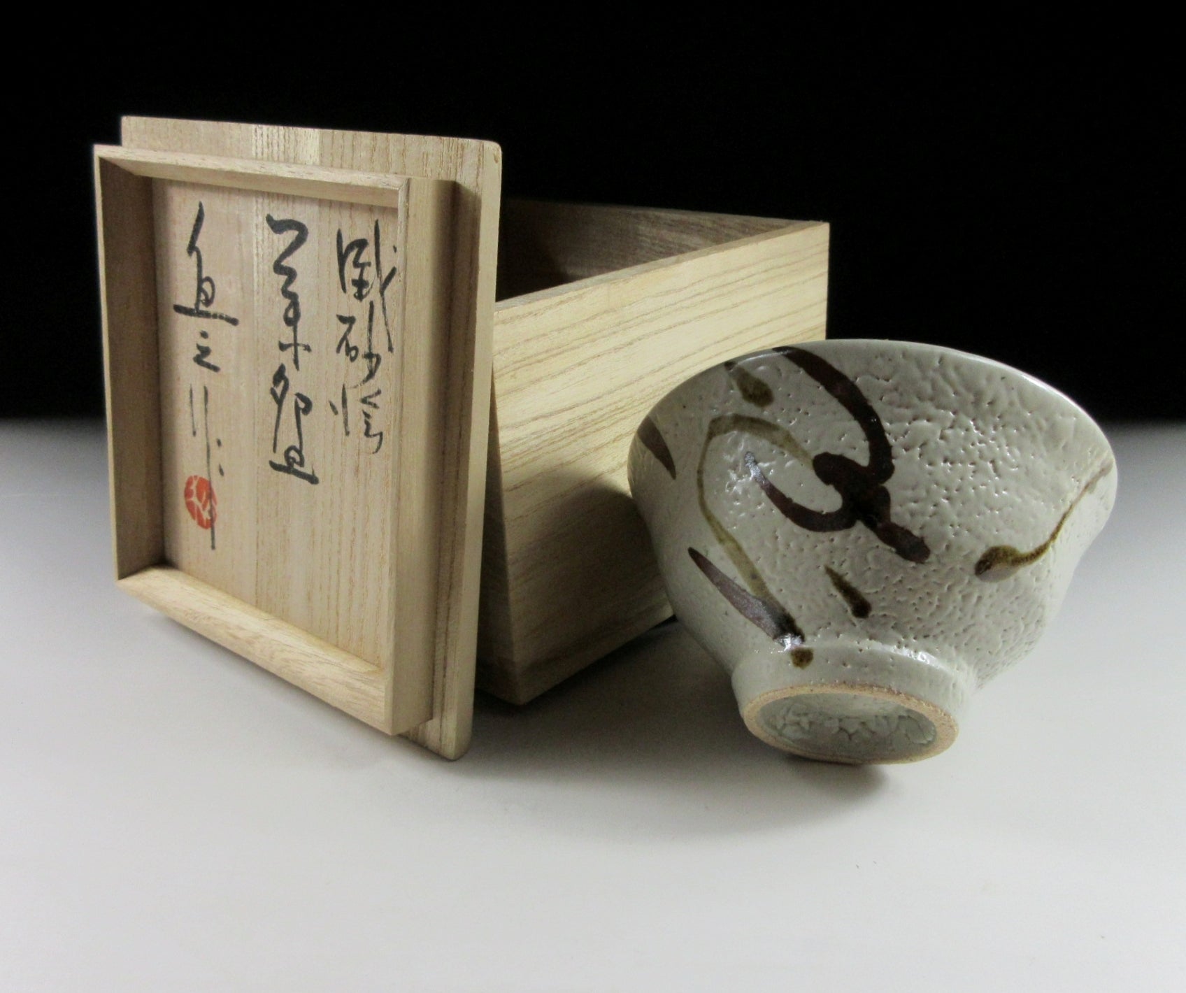 This listing is for a Mashiko-ware chawan made around 20 years ago by noted potter, Matsubara Naoyuki. It is wheel-thrown and decorated with an iron oxide and syrupy Mashiko-guro glaze depiction of an orchid over a nuka rice husk ash glazed base. This piece is ample in size and appears completely unused. The stamp of the potter can be found on the bottom, and it comes with its original signed wooden storage box. It also comes with a turmeric coloured wrapping cloth for when the item is not in use, as well as a Japanese language profile about the potter.