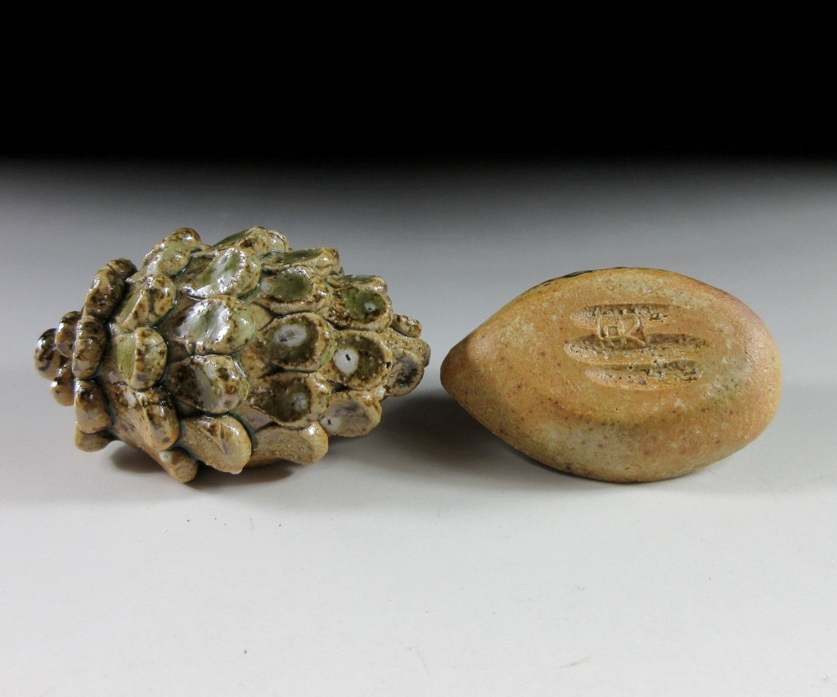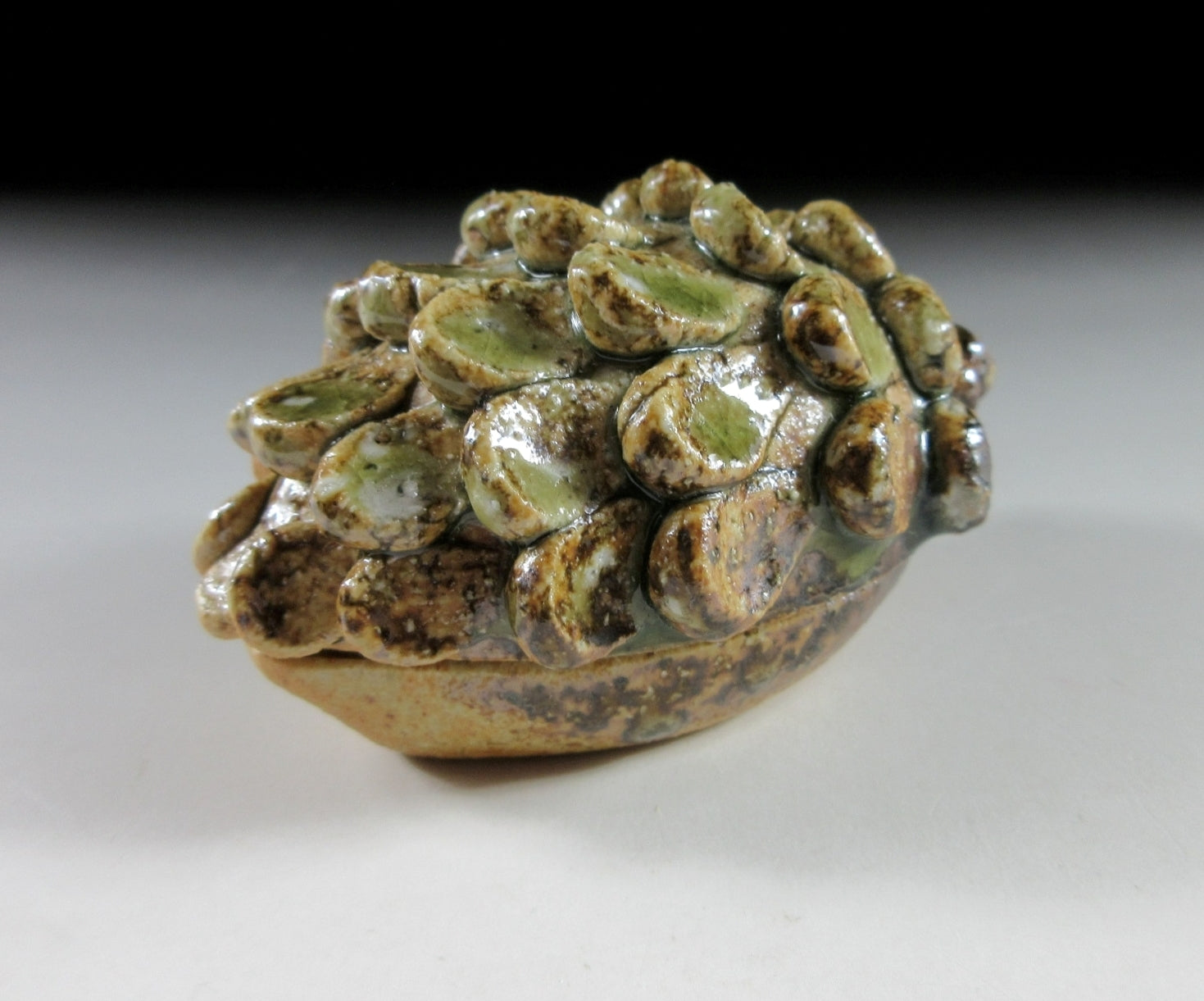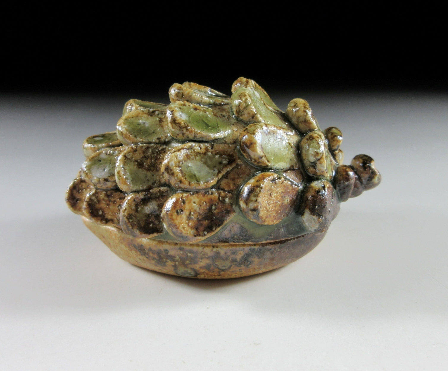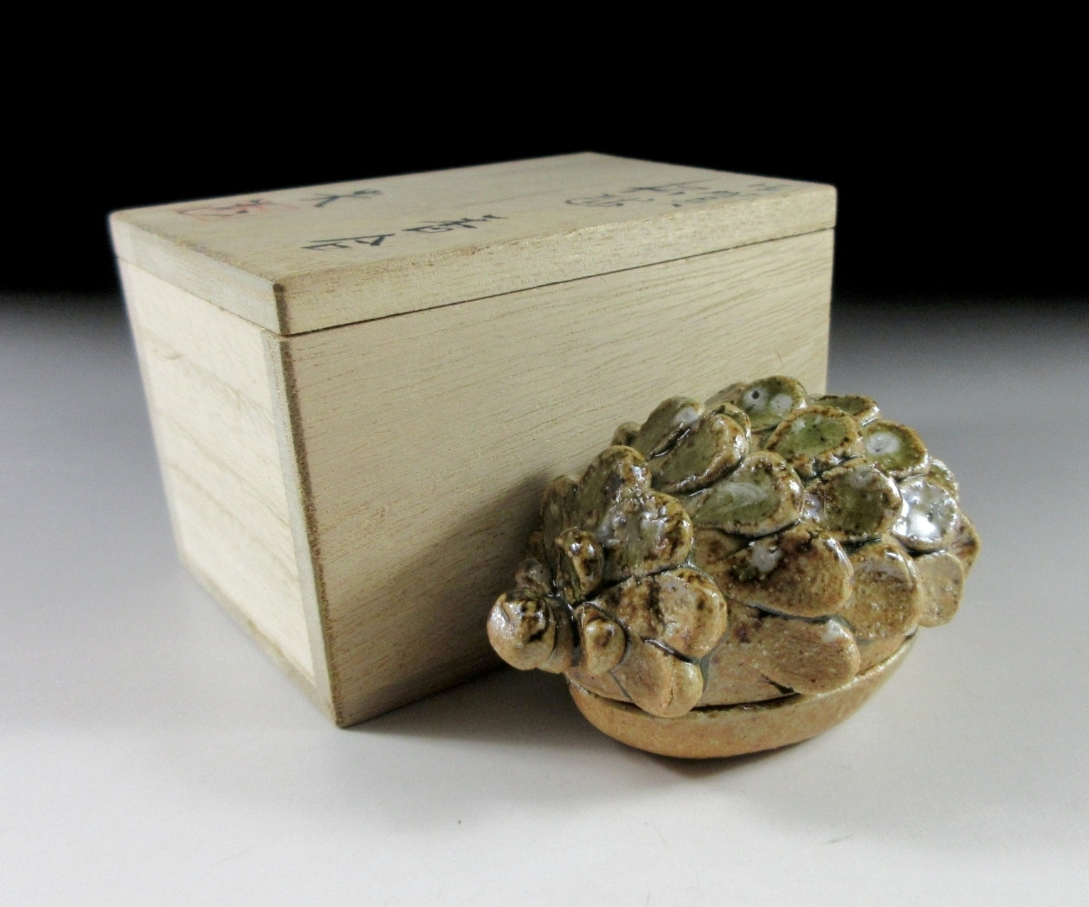 This listing is for an Iga-ware kogo made around 20 years ago by noted potter, Matsumoto Hisashi. It is hand-moulded and shaped to resemble a pine cone. It is wood fired and has an ample coating of natural ash glaze along the top. It’s suitable for holding both woodchip and kneaded type incense, though pottery kogo are typically used for kneaded incense during the cooler months. The stamp of the potter can be found on the bottom, and it comes with a signed wooden storage box.