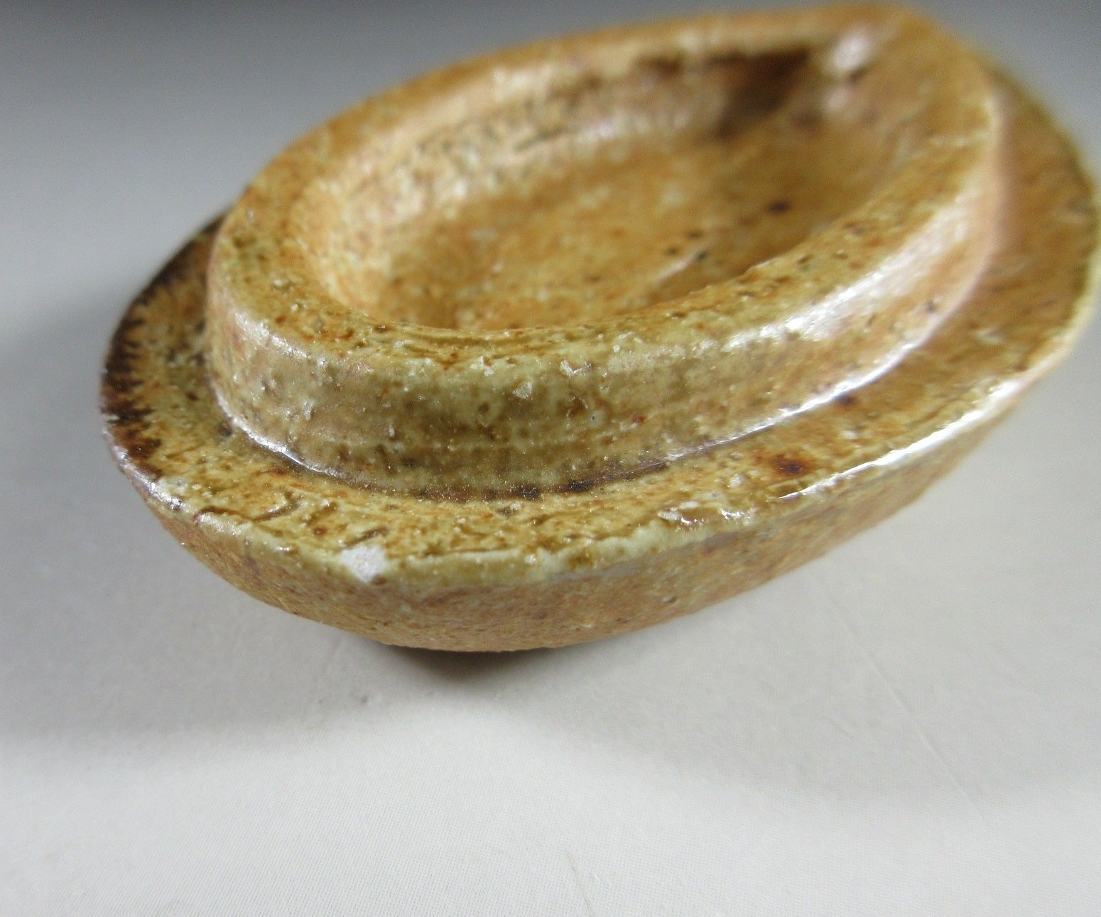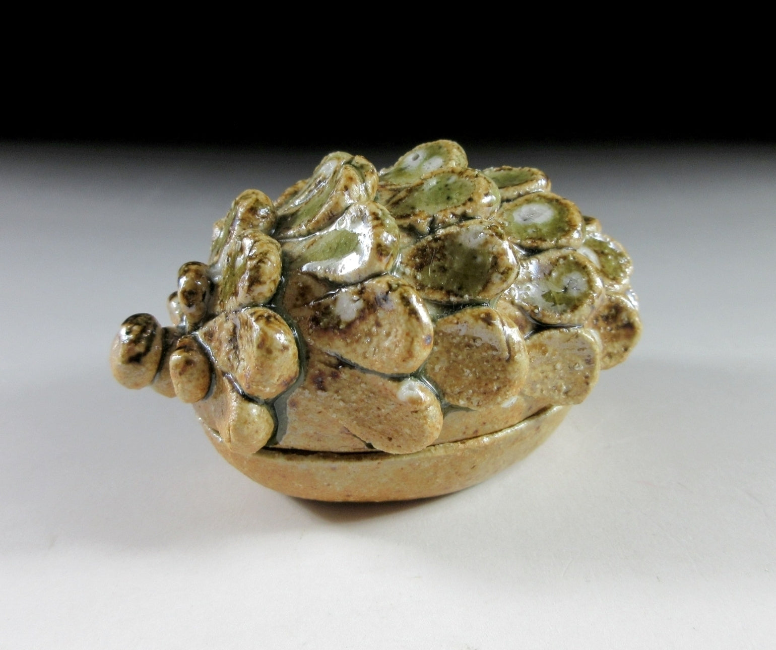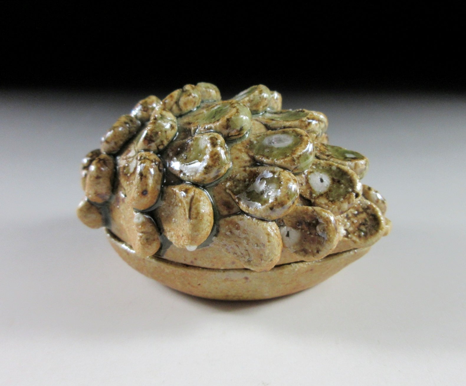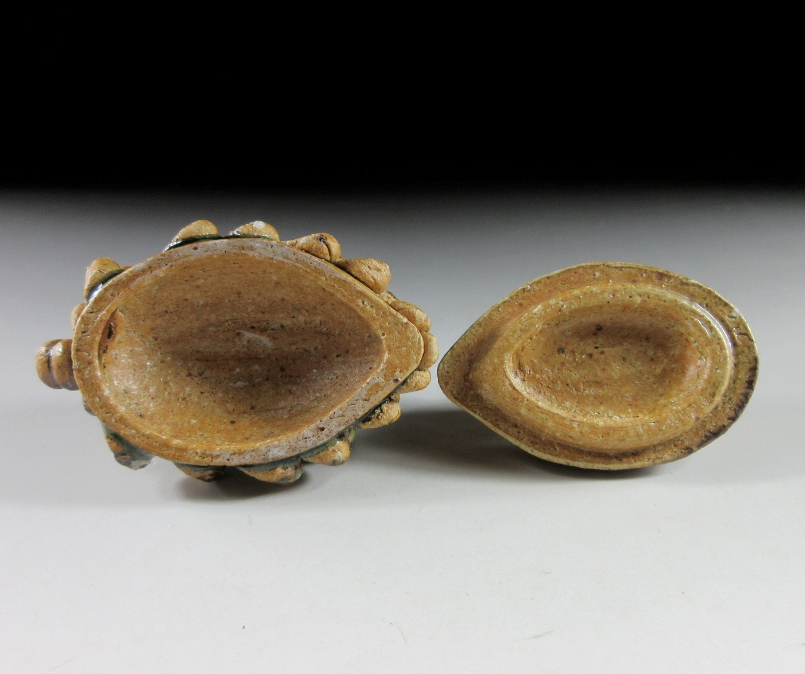 This listing is for an Iga-ware kogo made around 20 years ago by noted potter, Matsumoto Hisashi. It is hand-moulded and shaped to resemble a pine cone. It is wood fired and has an ample coating of natural ash glaze along the top. It’s suitable for holding both woodchip and kneaded type incense, though pottery kogo are typically used for kneaded incense during the cooler months. The stamp of the potter can be found on the bottom, and it comes with a signed wooden storage box.