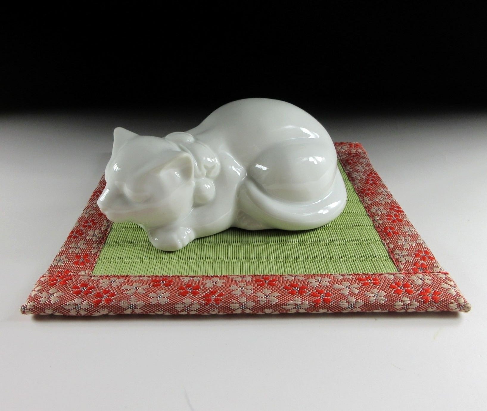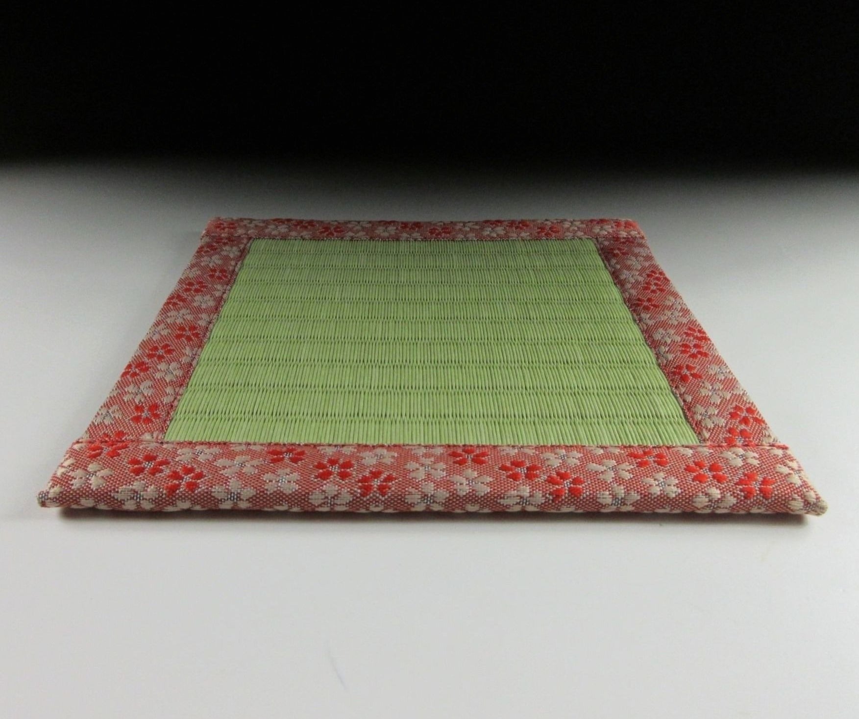 This listing is for a medium sized hand-woven tatami mat made of soft reed rushes. Hemp or cotton cord is used to weave rushes together to form a square mat. These little mats are ideal for displaying items such as vases, okimono, chawan, they can also be used as little placemats for tea cups etc. The mat is covered on all four sides by a traditional cotton edge called ‘eri’. The eri in this listing is mainly pink and features a reddish-pink and white sakura pattern. Our mats are hand-made in Kanagawa Prefecture using local materials. *PLEASE NOTE THAT THE CERAMIC CAT AND WOODEN HORSE ARE NOT INCLUDED IN THIS LISTING, THIS LISTING IS FOR THE MAT ONLY.