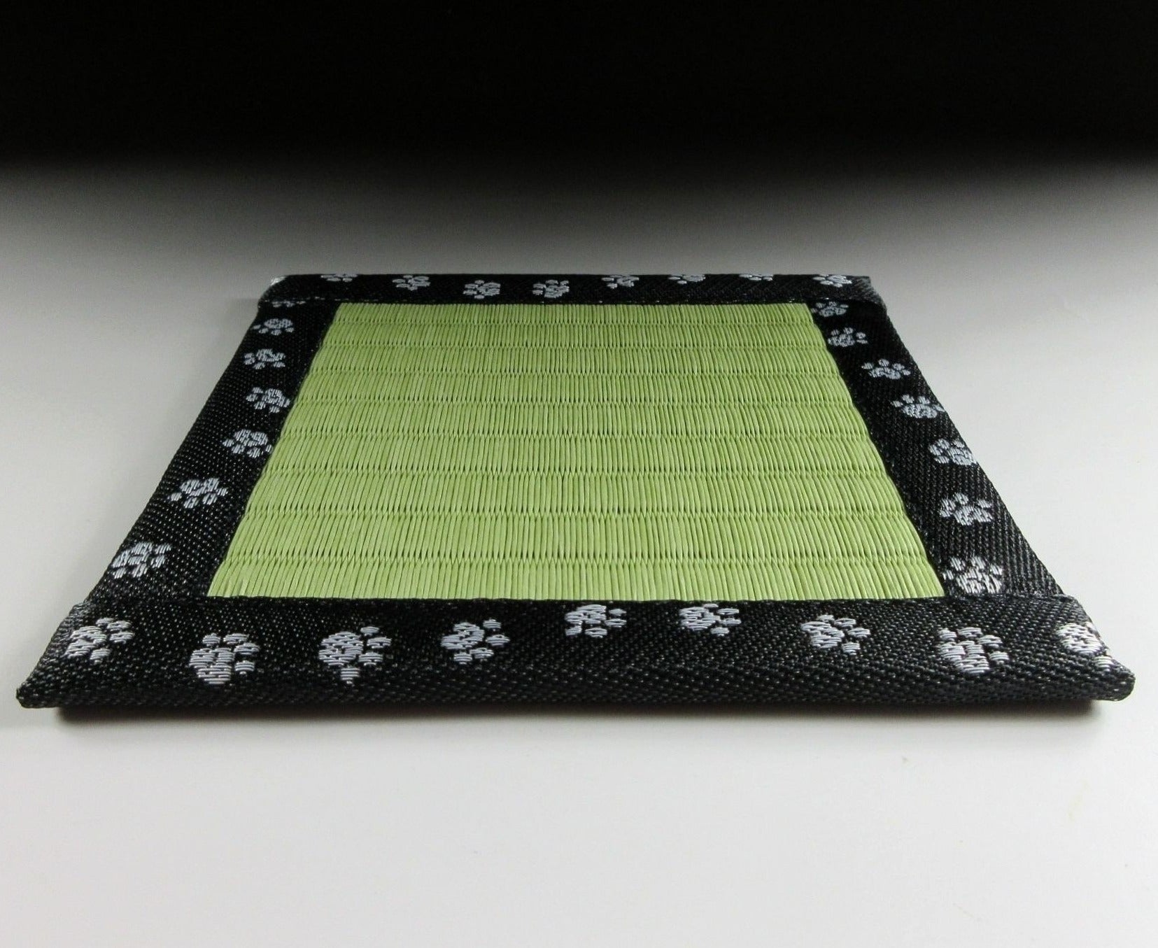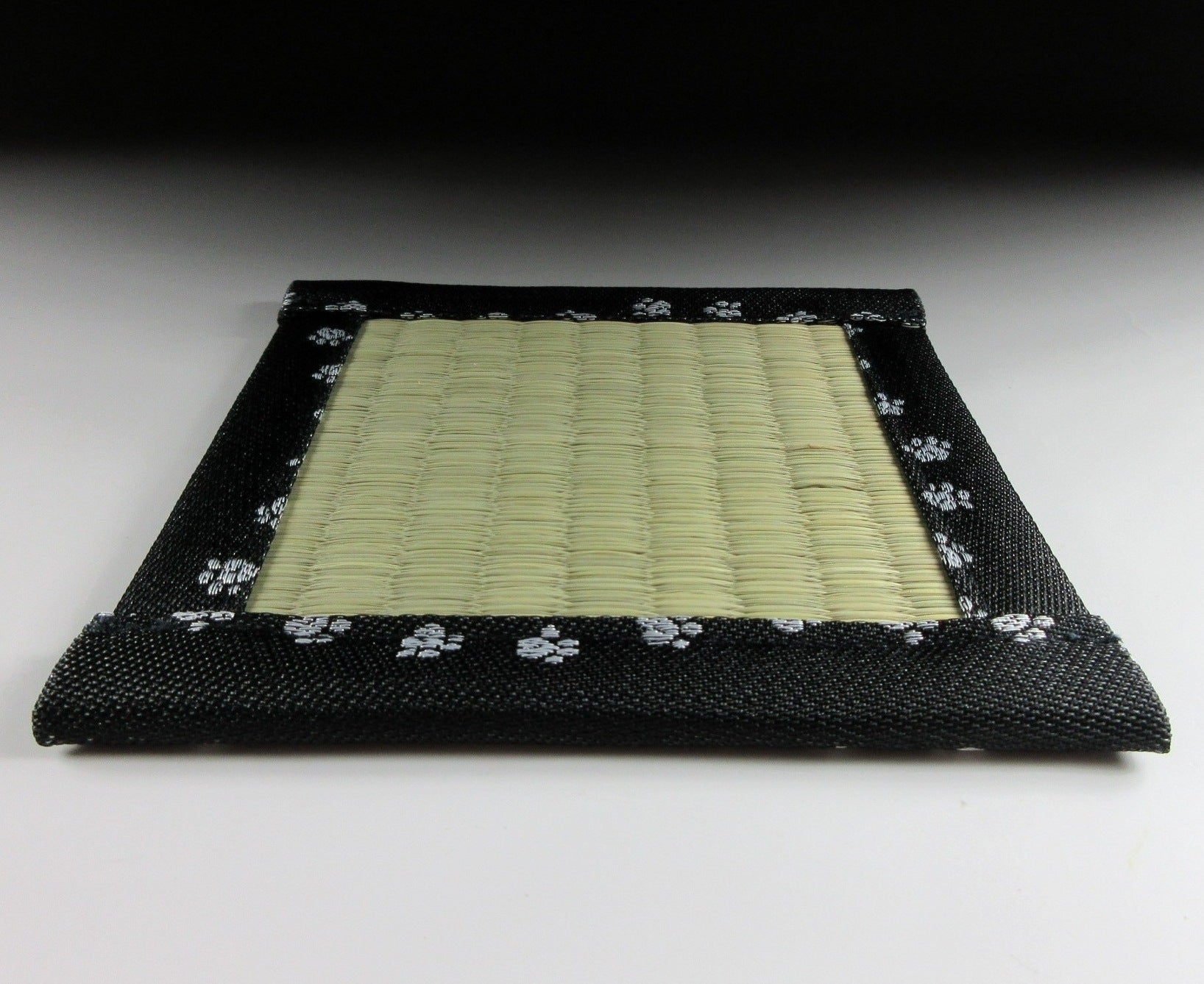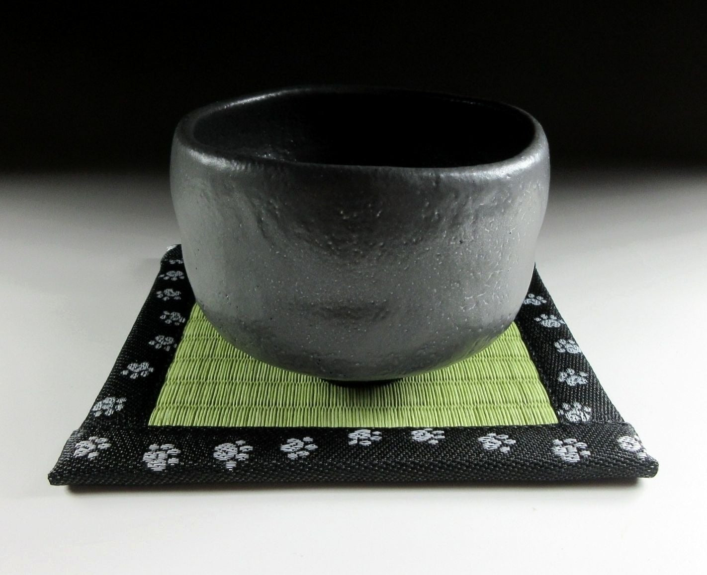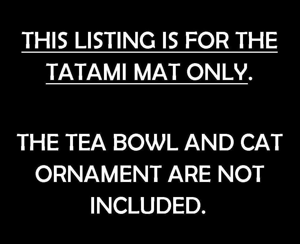 This listing is for a medium sized hand-woven tatami mat made of soft reed rushes. Hemp or cotton cord is used to weave rushes together to form a square mat. These little mats are ideal for displaying items such as vases, okimono, chawan, they can also be used as little placemats for tea cups etc. The mat is covered on all four sides by a traditional cotton edge called ‘eri’. The eri in this listing is black and features white paw prints. Our mats are hand-made in Kanagawa Prefecture using local materials. * PLEASE NOTE THAT THE TEA BOWL AND CAT ORNAMENT ARE NOT INCLUDED IN THIS LISTING, THIS LISTING IS FOR THE MAT ONLY.
