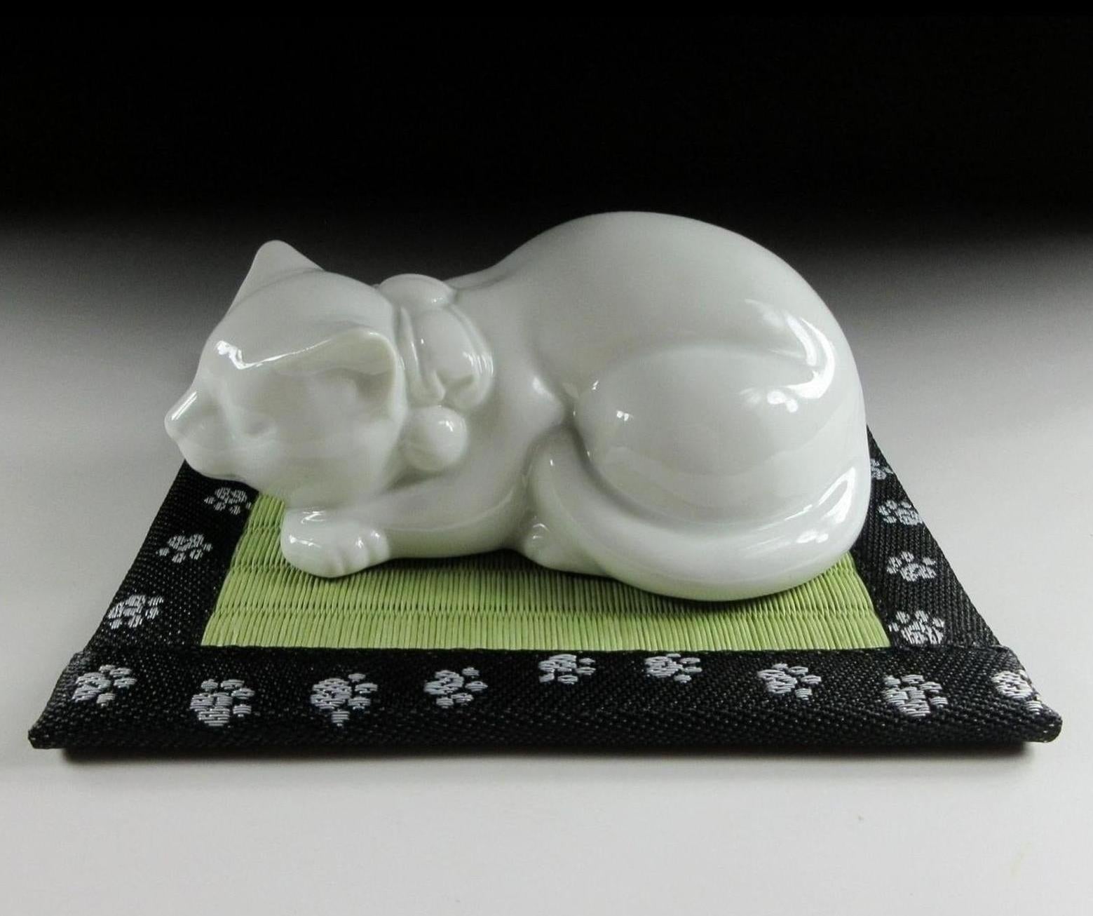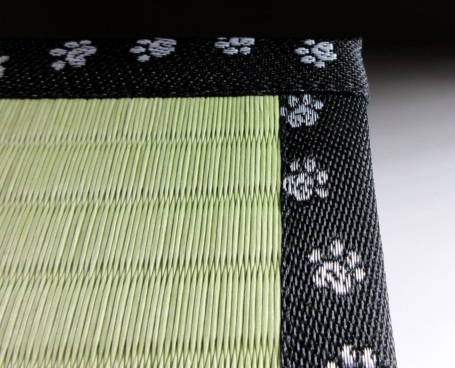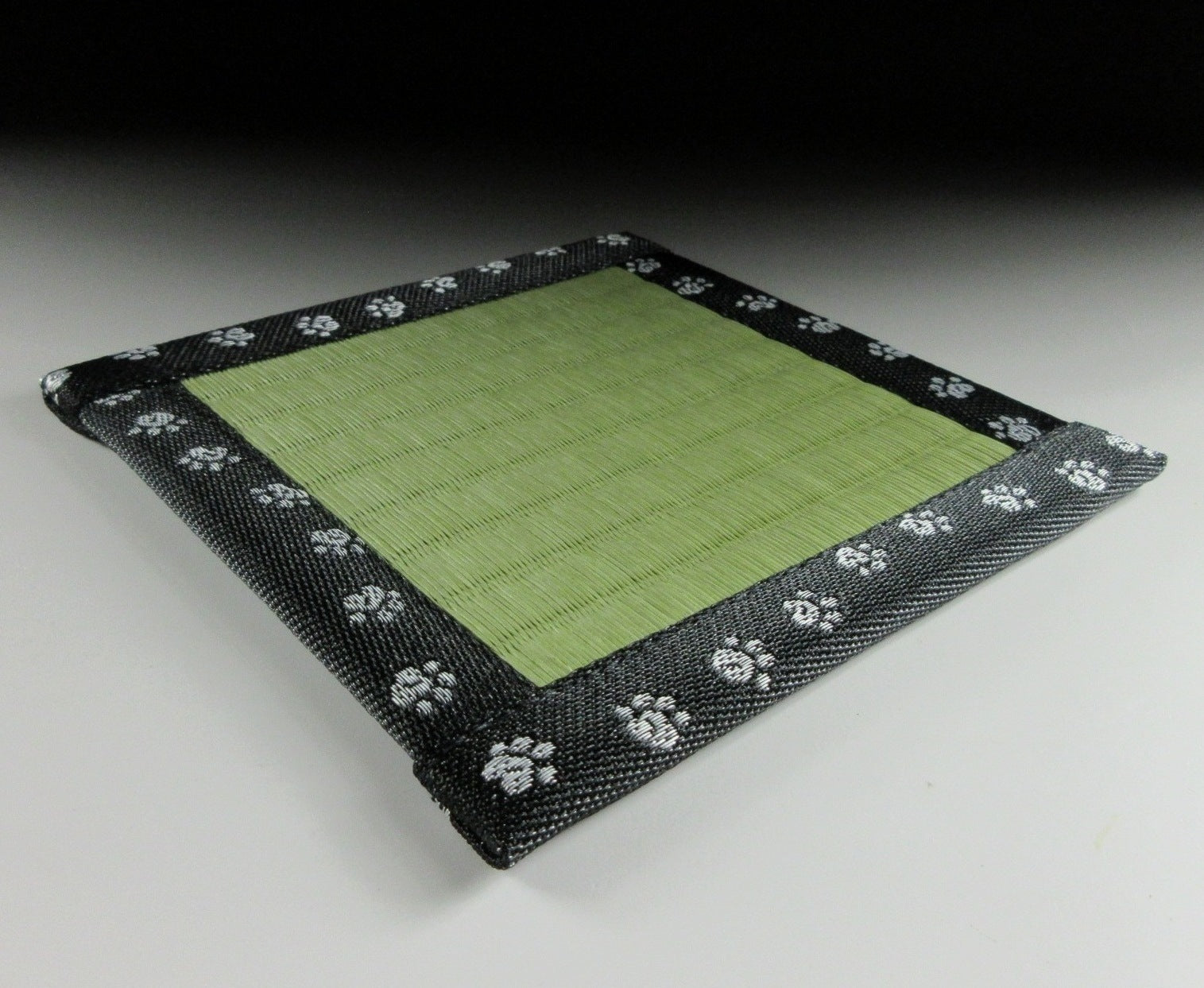 This listing is for a medium sized hand-woven tatami mat made of soft reed rushes. Hemp or cotton cord is used to weave rushes together to form a square mat. These little mats are ideal for displaying items such as vases, okimono, chawan, they can also be used as little placemats for tea cups etc. The mat is covered on all four sides by a traditional cotton edge called ‘eri’. The eri in this listing is black and features white paw prints. Our mats are hand-made in Kanagawa Prefecture using local materials. * PLEASE NOTE THAT THE TEA BOWL AND CAT ORNAMENT ARE NOT INCLUDED IN THIS LISTING, THIS LISTING IS FOR THE MAT ONLY.