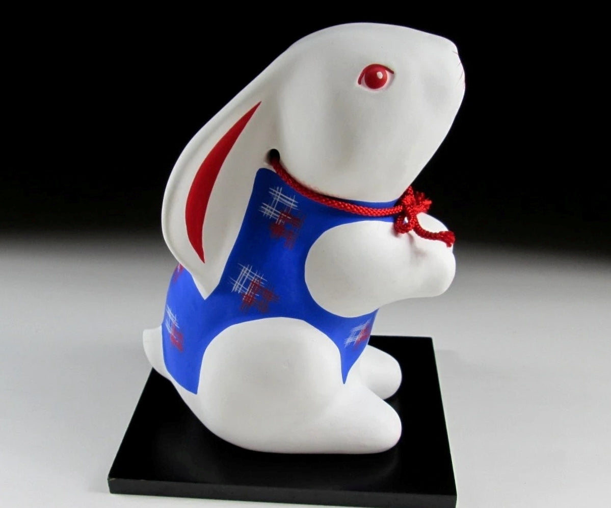 This listing is for Mikawachi-ware earthenware rabbit okimono made around 20-30 years ago by Kakehashi Kumashi. The rabbit features a blue jacket with a red and white line pattern, and it has a red string around its neck. Usually earthenware okimono are small, this piece is quite large in comparison. The rabbit comes with its original paper box, a black display board, and Japanese information about the potter and Mikawachi-ware.