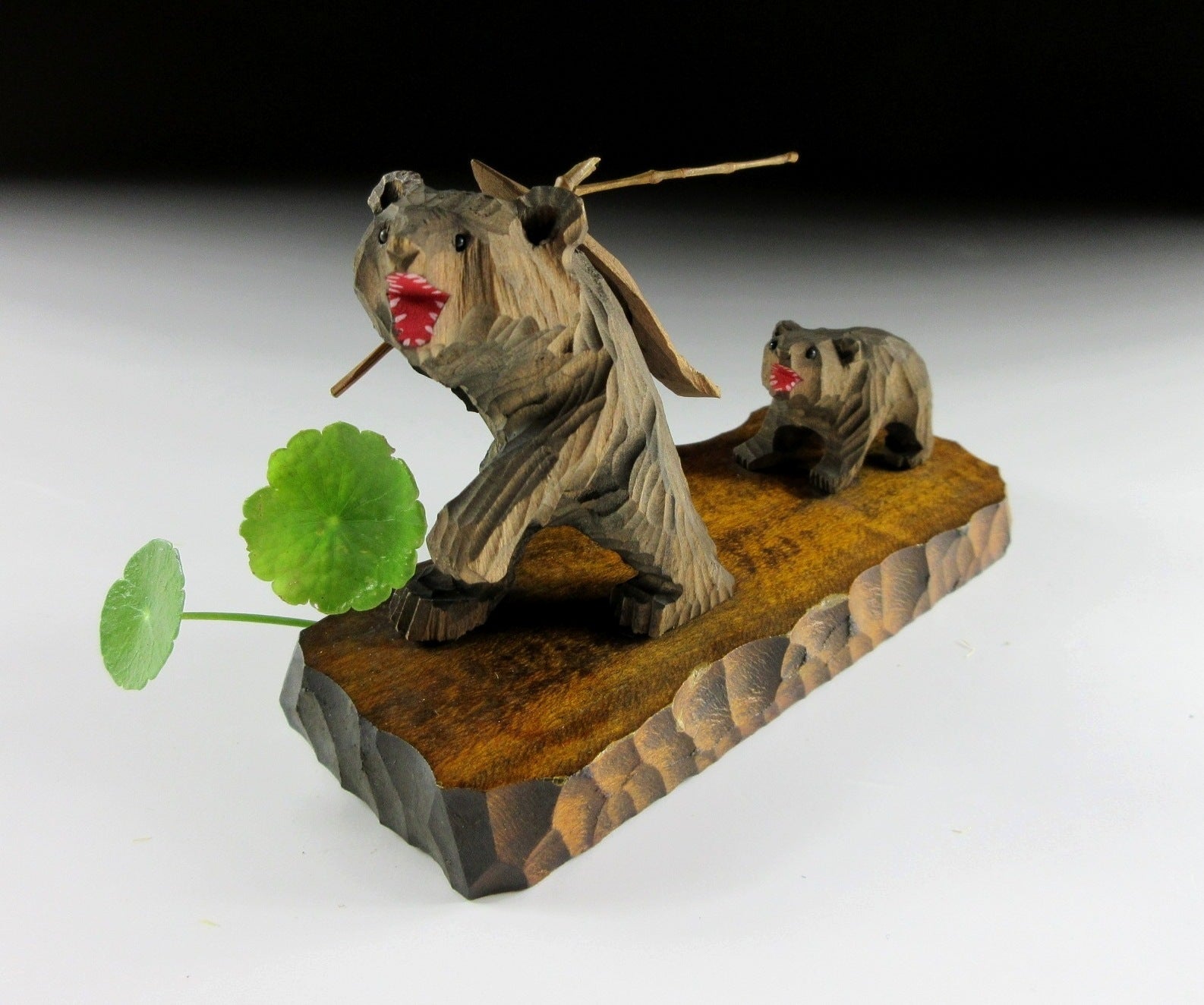 The Ainu people of Japan first started commercial wood carving back in the 1920s. Traditionally their carvings consisted of religious objects, however dire economic circumstances forced them to turn to wood carving for tourists. Their wares, particularly the Higuma bear carvings, became very popular as souvenirs due to their very realistic appearance. The Emperor himself acquired a Higuma bear made by a highly talented carver named Umetaro Matsui in 1938. Following this Matsui won many awards for his work, and gradually these ornate carvings became recognised as beautiful works of art.