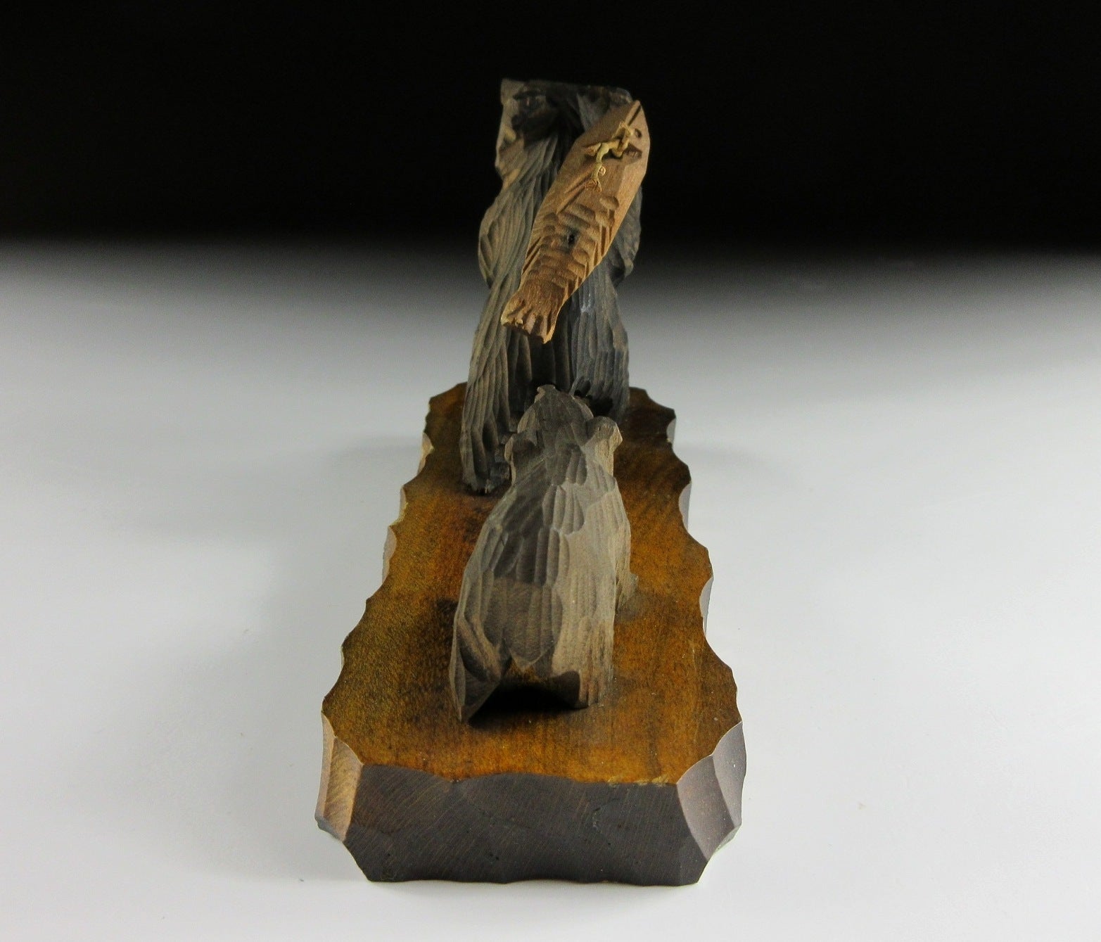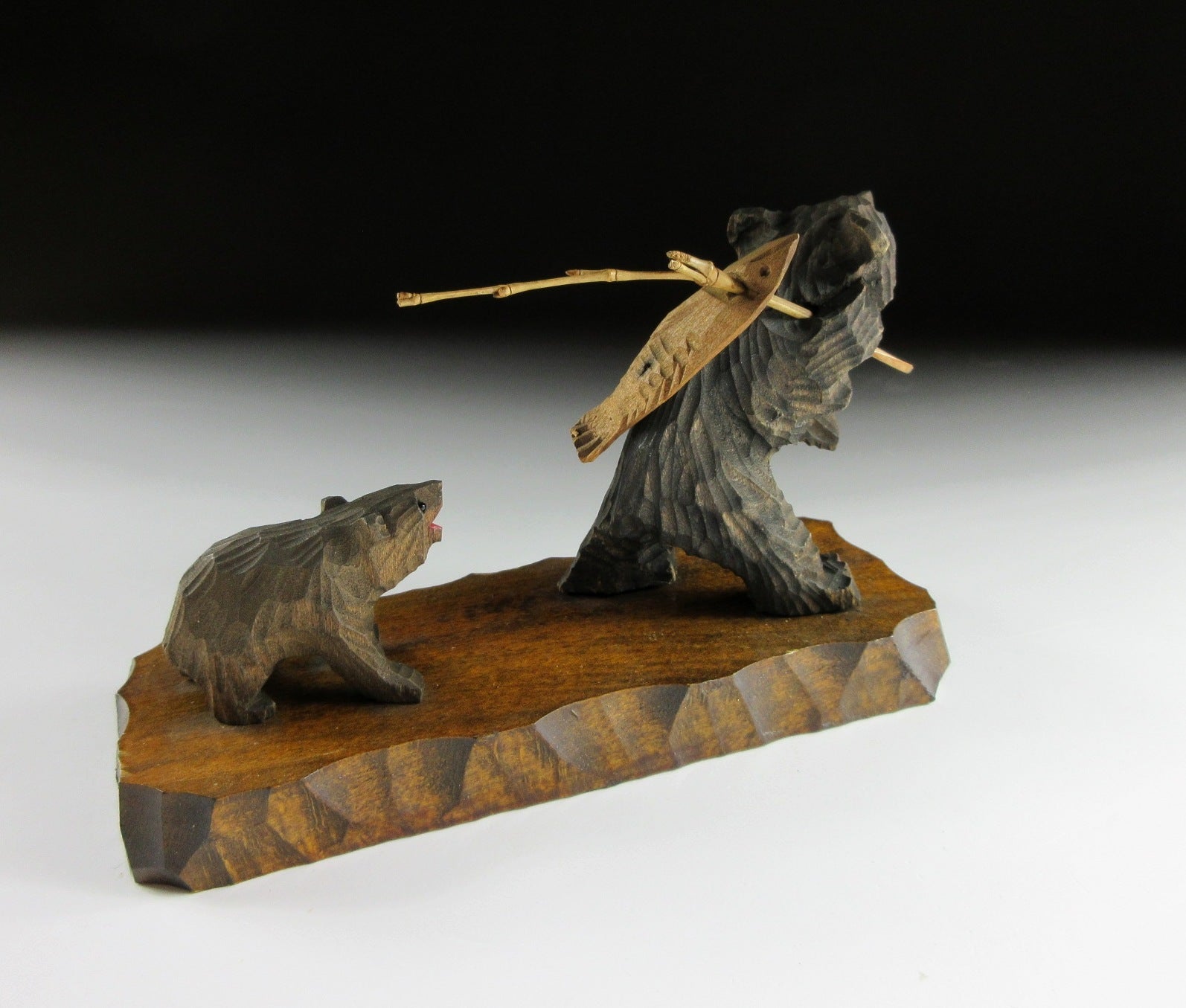 This listing is for a VERY SMALL higuma bear carving from the northern island of Hokkaido. This piece is a little unusual as it depicts a bear carrying a salmon on a pole with its hungry cub in tow. The little bears are hand carved and attached to the lacquer base. a lovely little ornament to pop on a shelf.