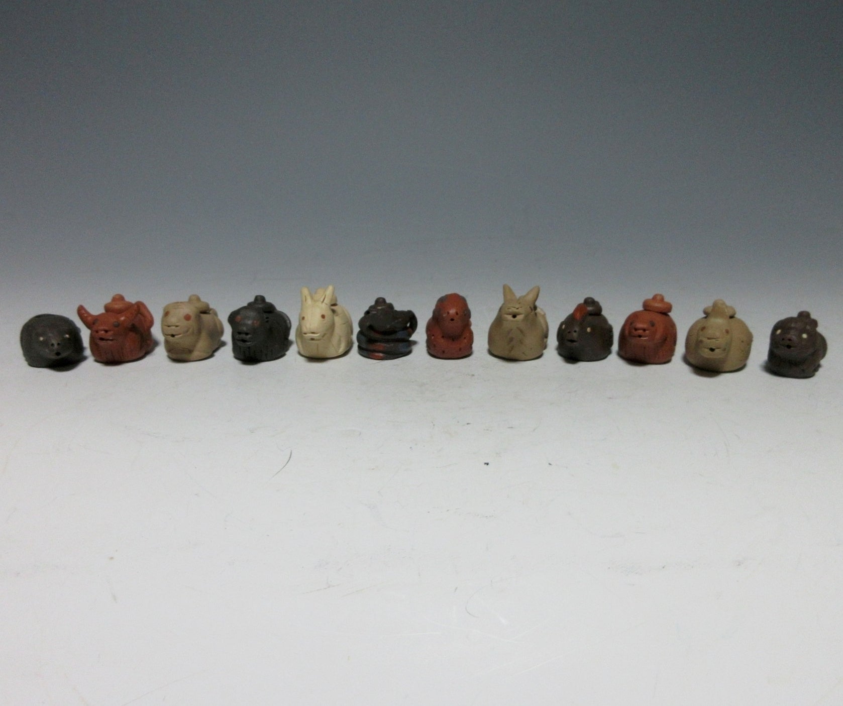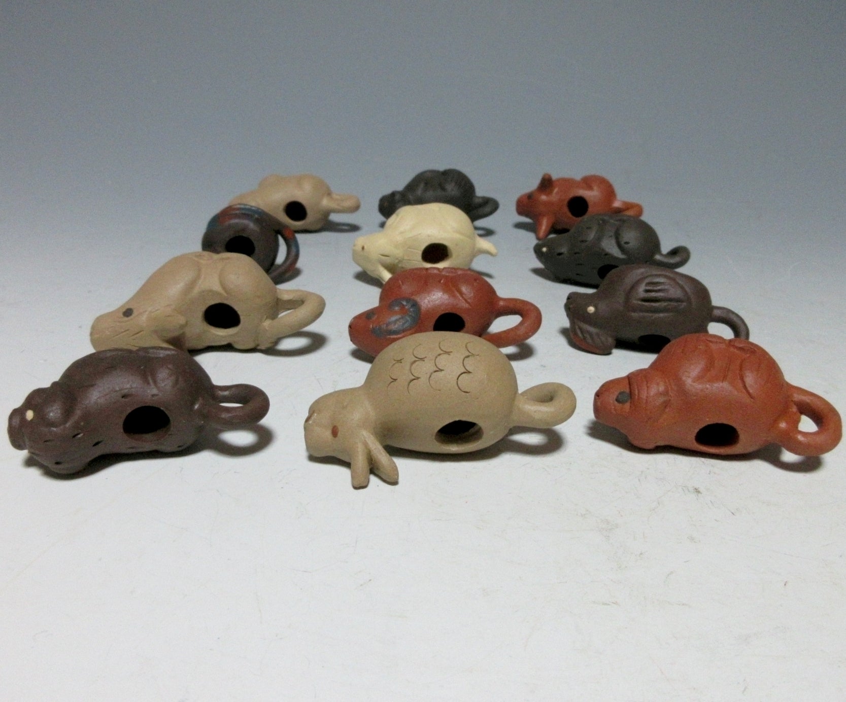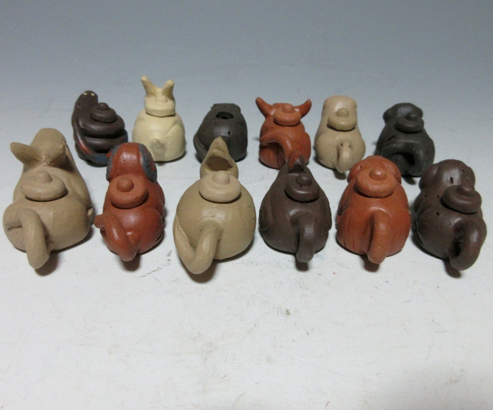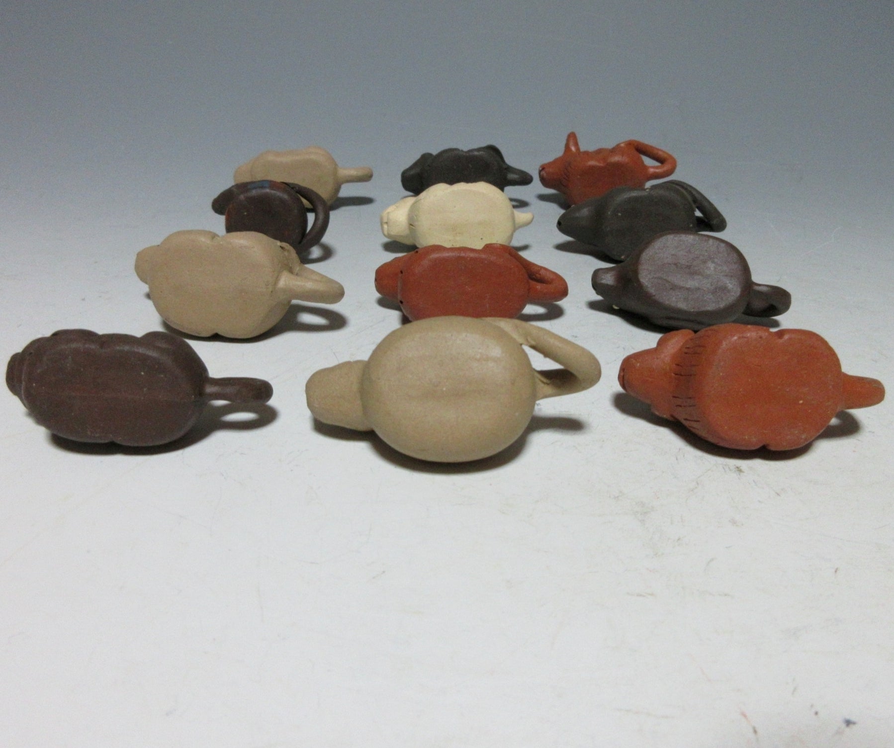 This listing is for a set of twelve miniature Yixing production grade teapots with silk brocade box. The set consists of the twelve animals belonging to the Chinese horoscope and are made with different colours of clay. They hold approximately 15ml which in Japan makes them ‘one gulp’ teapots. Due to their tiny size the set is more of a novelty item than a practical one.