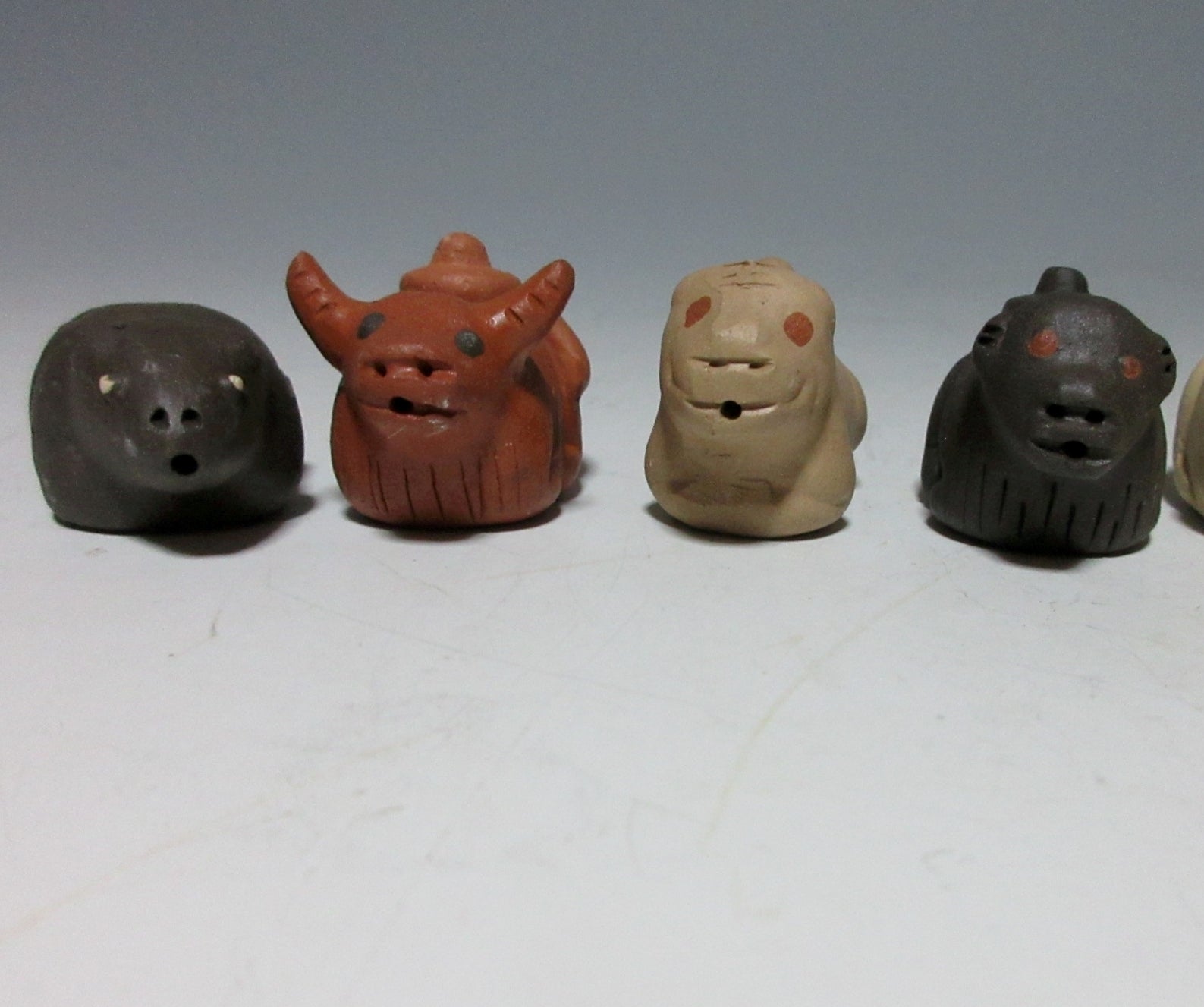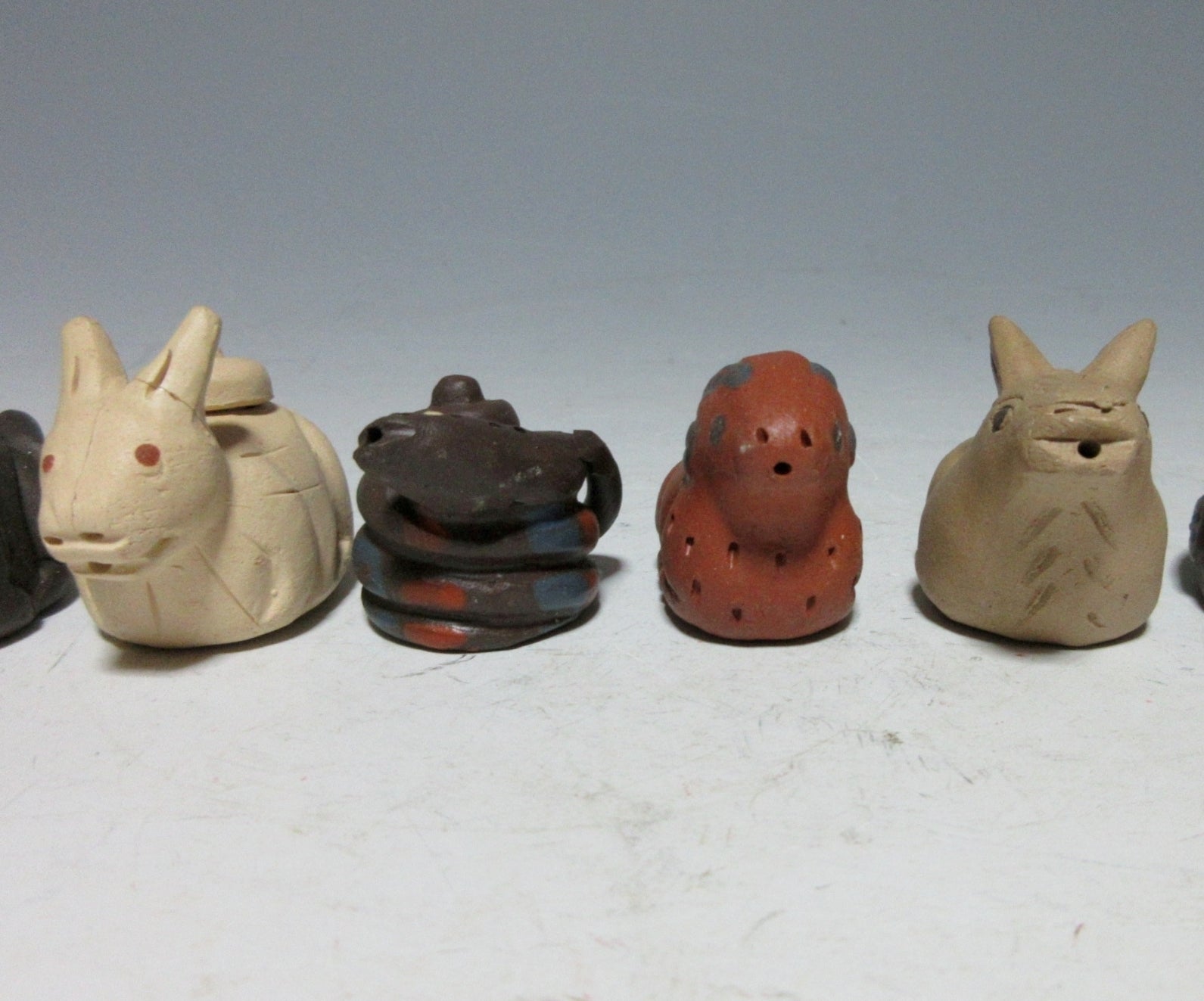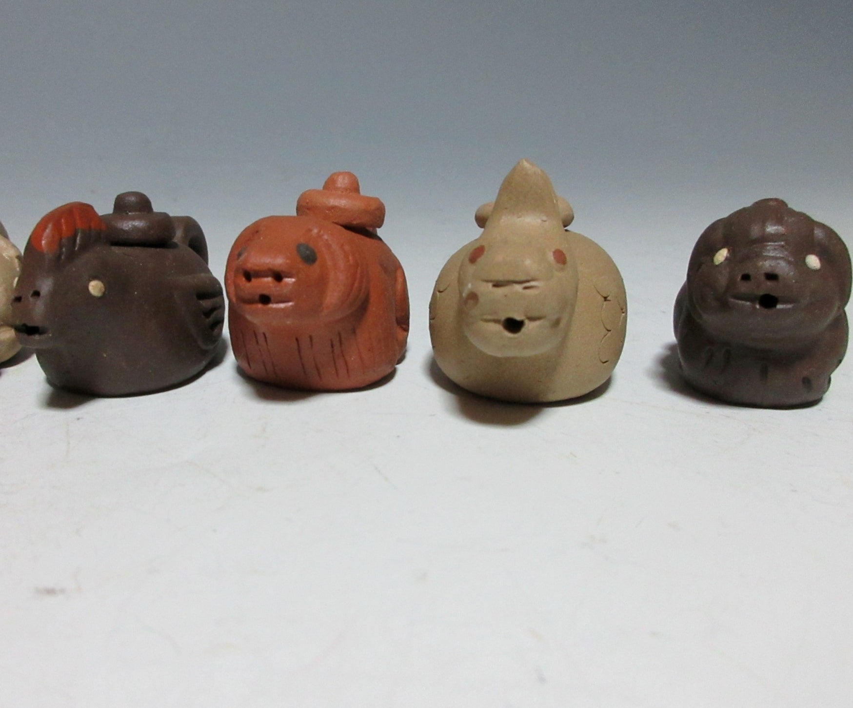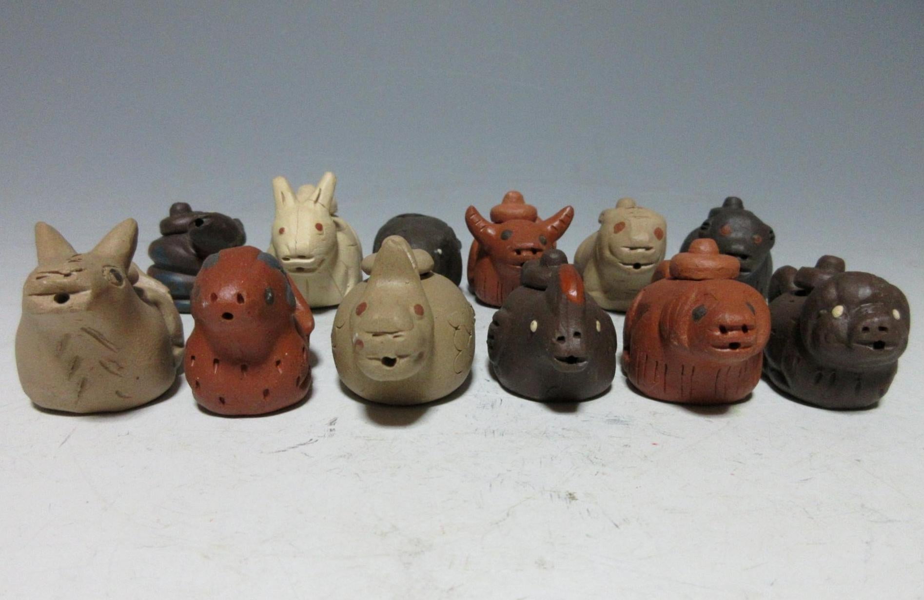 This listing is for a set of twelve miniature Yixing production grade teapots with silk brocade box. The set consists of the twelve animals belonging to the Chinese horoscope and are made with different colours of clay. They hold approximately 15ml which in Japan makes them ‘one gulp’ teapots. Due to their tiny size the set is more of a novelty item than a practical one.