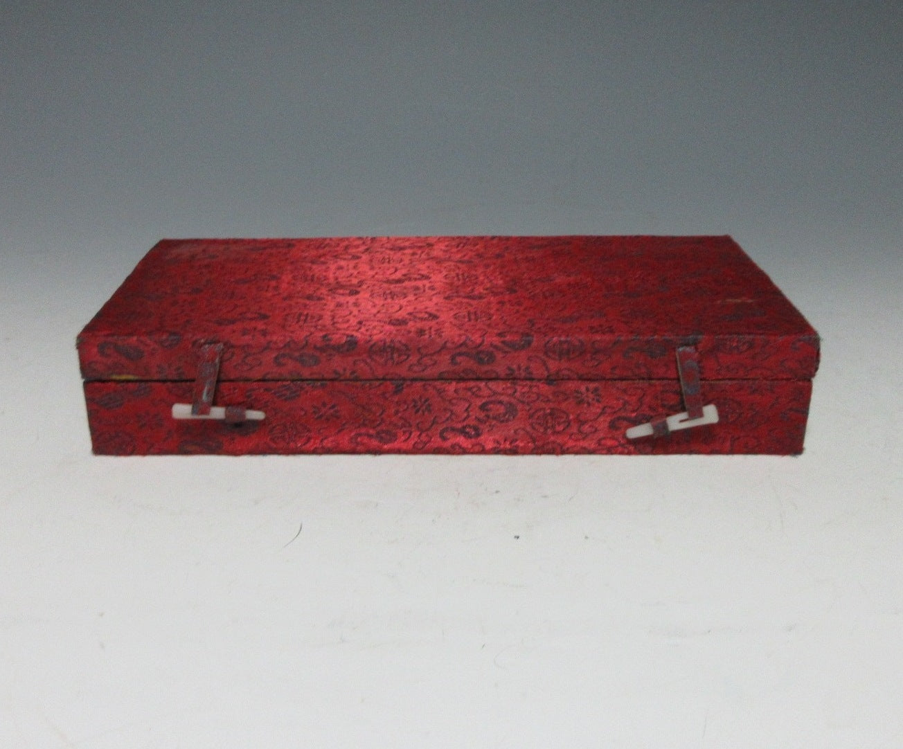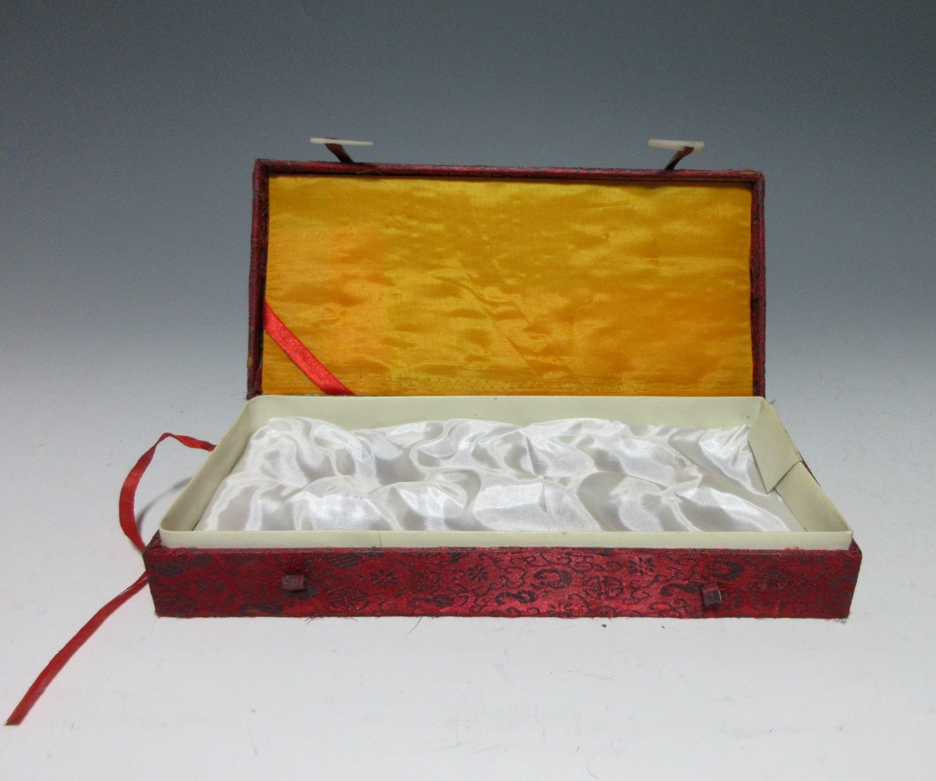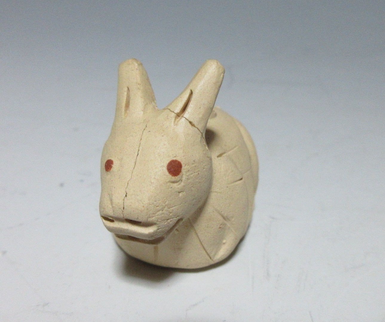 Overall the set is in decent condition. There’s a repair on one of the rabbit’s ears, and the dragon has a glaze imperfection on its face. These little pots were made using slip moulds and the ‘seam’ is still visible in places. The box has some loose threads, worn edges, and its discoloured on the bottom.