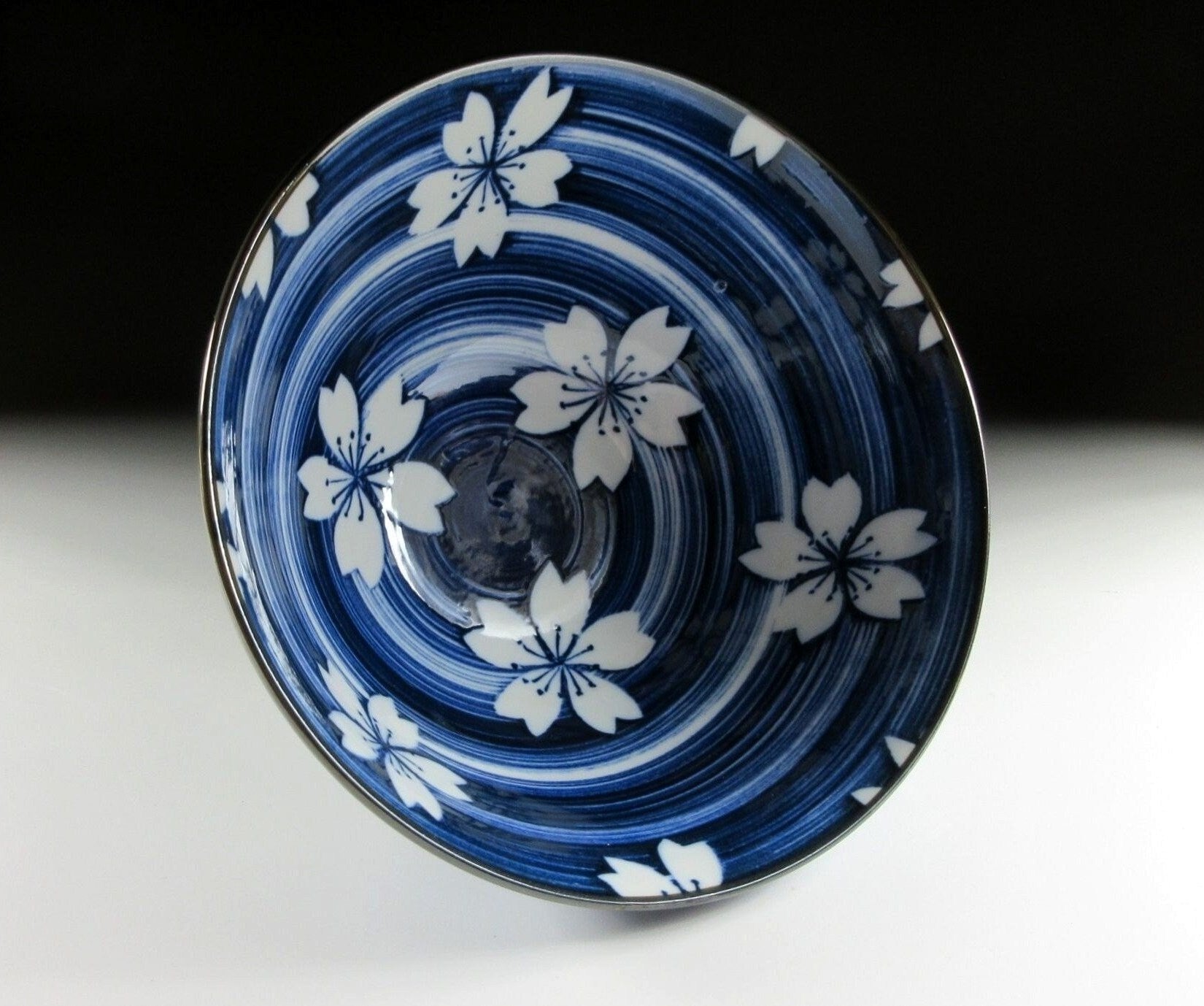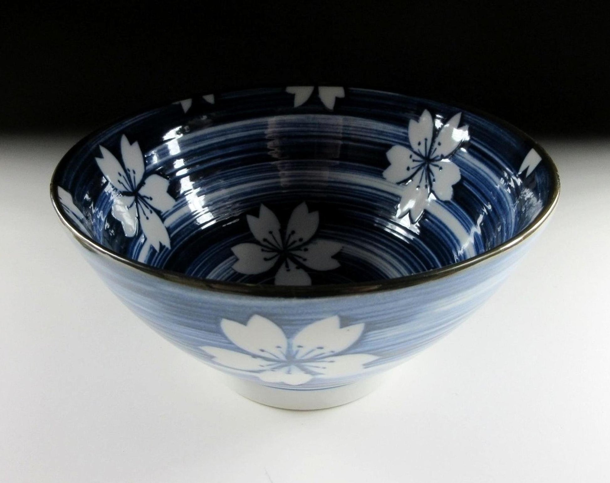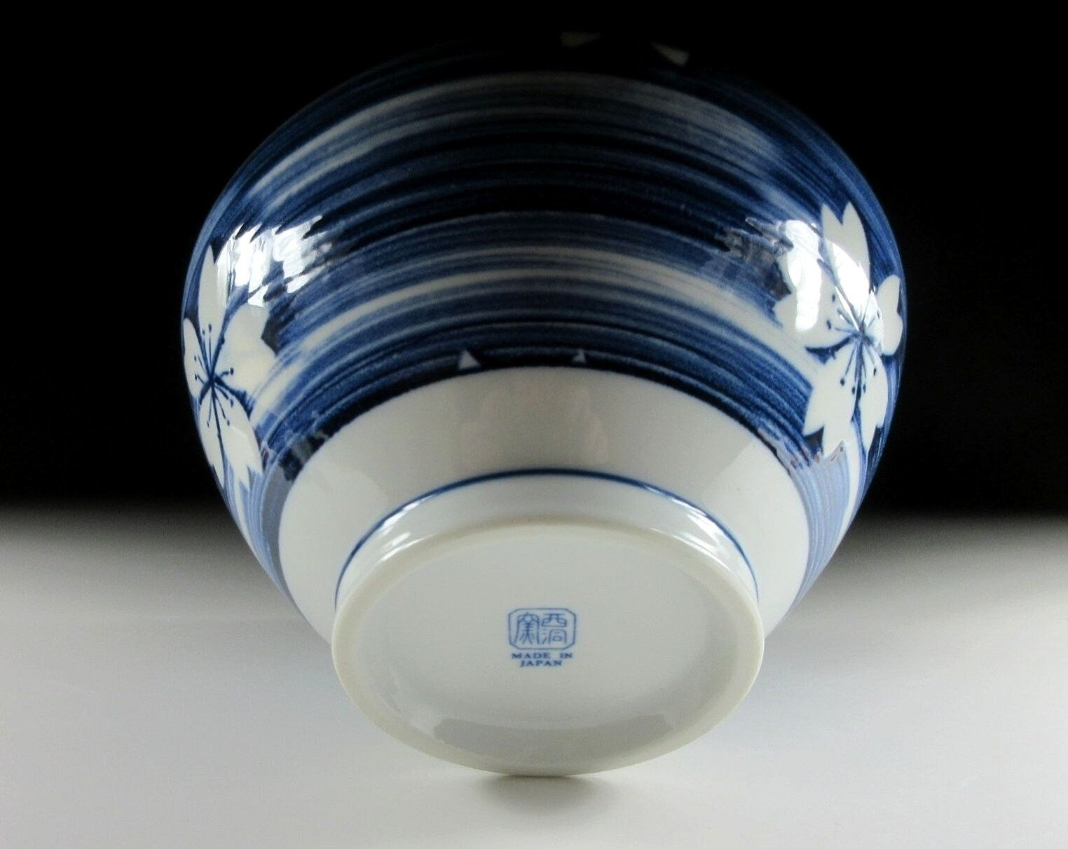 This listing is for a large Mino-ware donburi bowl made around 20 years ago. It was made at a production grade kiln and features a pattern of white sakura cherry blossoms over an indigo brushwork background. Patterns on production tableware is often stencilled or printed onto the surface of the bowl, and some pieces are made using moulds. The rim of the bowl in this listing is trimmed with brown glaze, and there’s a single blue line above the foot. It’s nice deep shape makes it ideal for serving salads, pasta, or vegetables. The stamp of the kiln can be found on the bottom of the kiln.