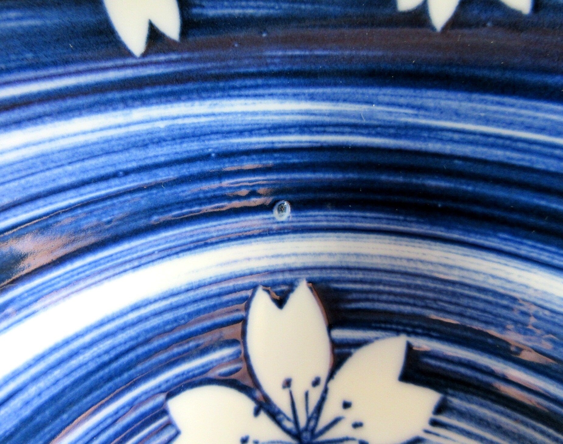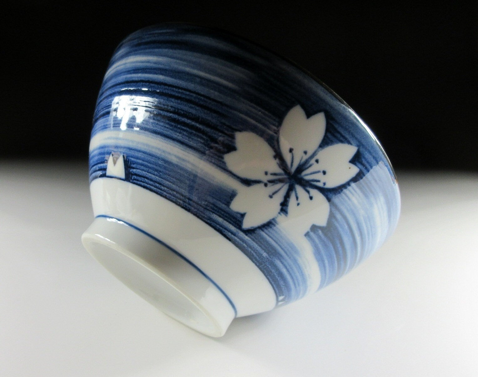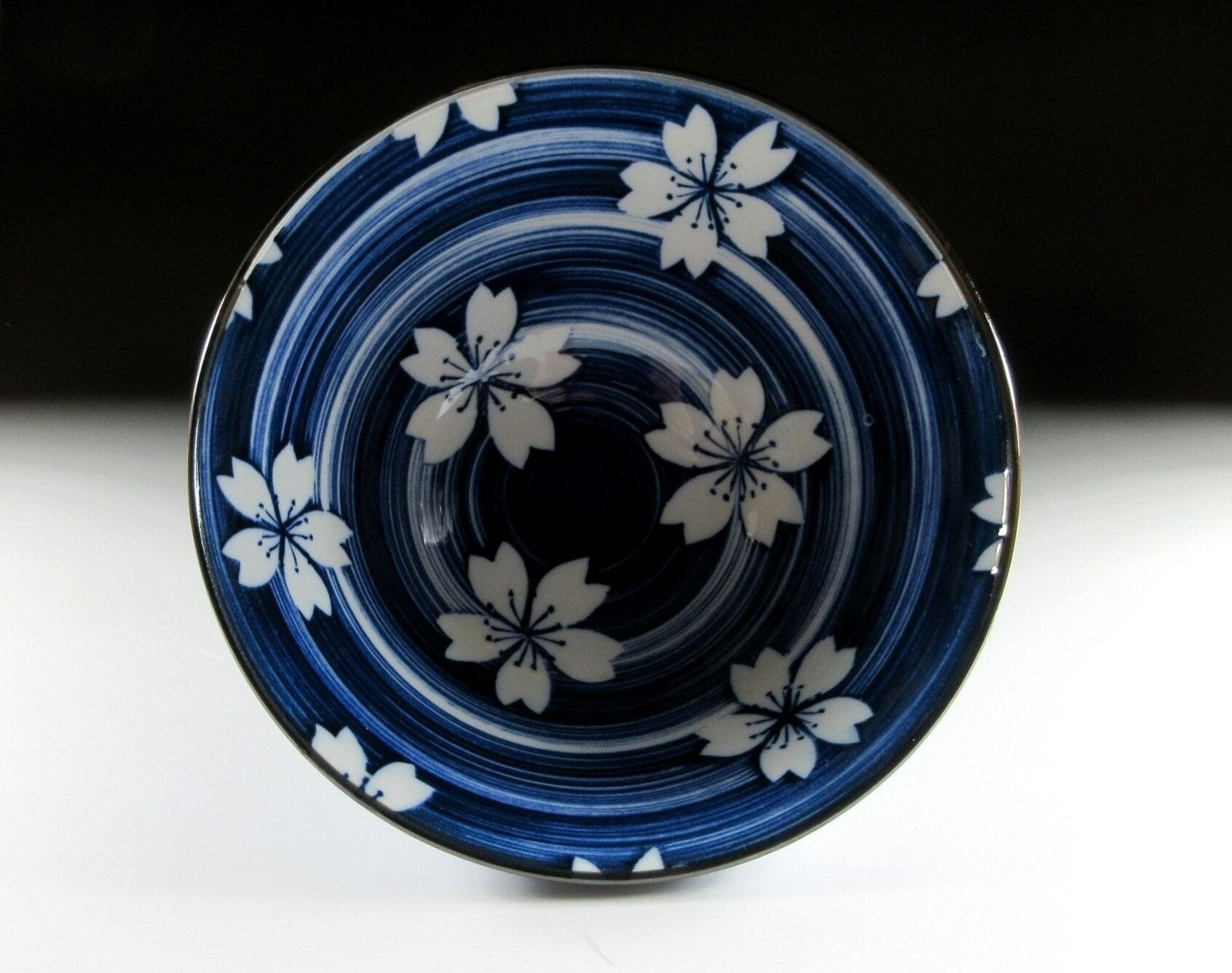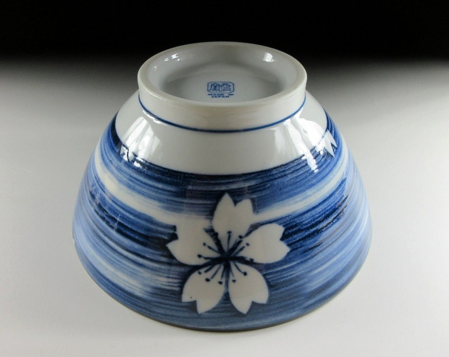 This listing is for a large Mino-ware donburi bowl made around 20 years ago. It was made at a production grade kiln and features a pattern of white sakura cherry blossoms over an indigo brushwork background. Patterns on production tableware is often stencilled or printed onto the surface of the bowl, and some pieces are made using moulds. The rim of the bowl in this listing is trimmed with brown glaze, and there’s a single blue line above the foot. It’s nice deep shape makes it ideal for serving salads, pasta, or vegetables. The stamp of the kiln can be found on the bottom of the kiln.