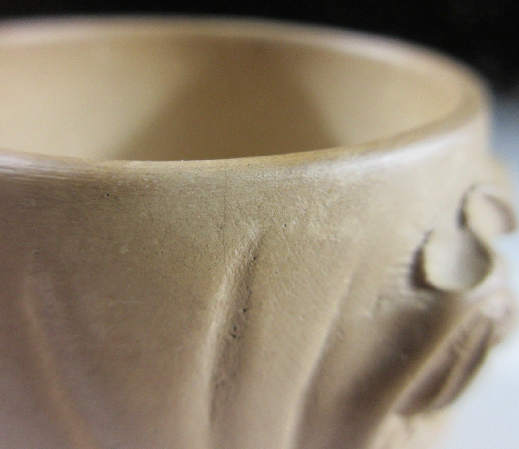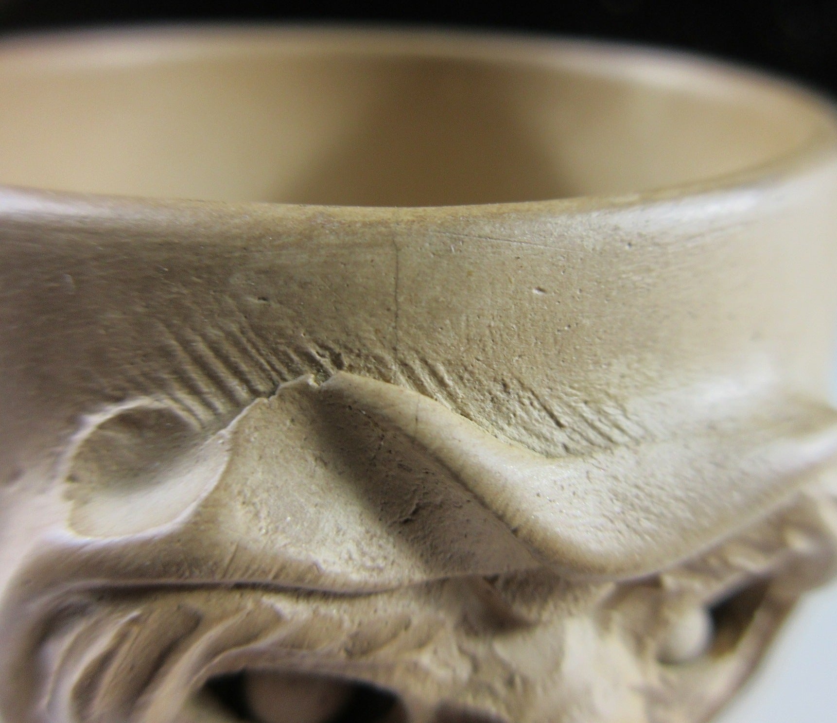 Two tiny chips above his right eye, two small hairline cracks on rim above face (visible when wet), and it has changed colour from use. Eventually it will turn black if used frequently.
