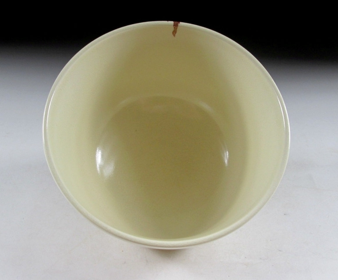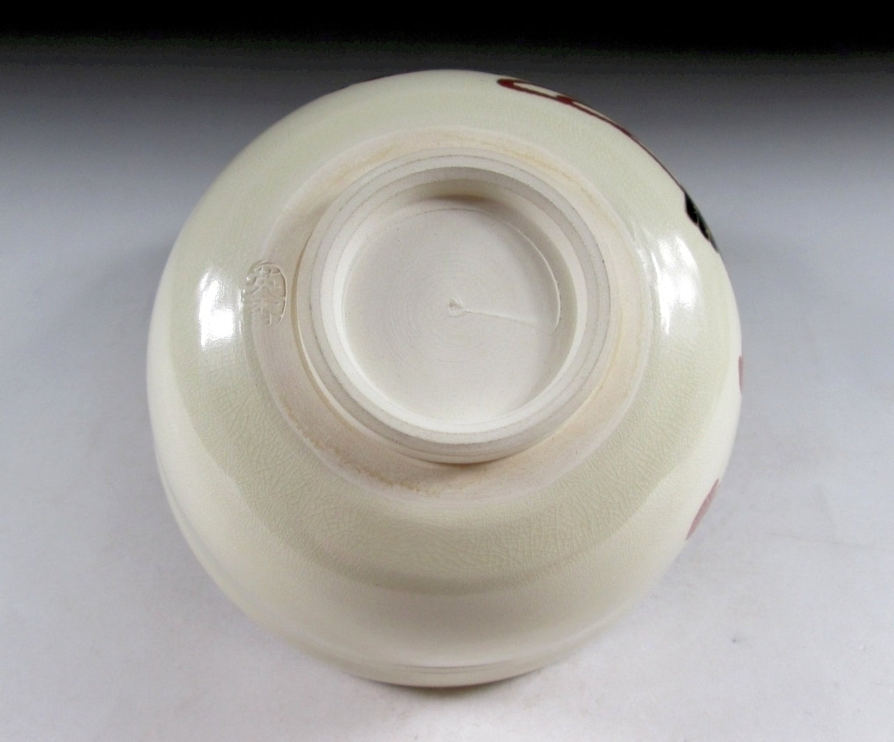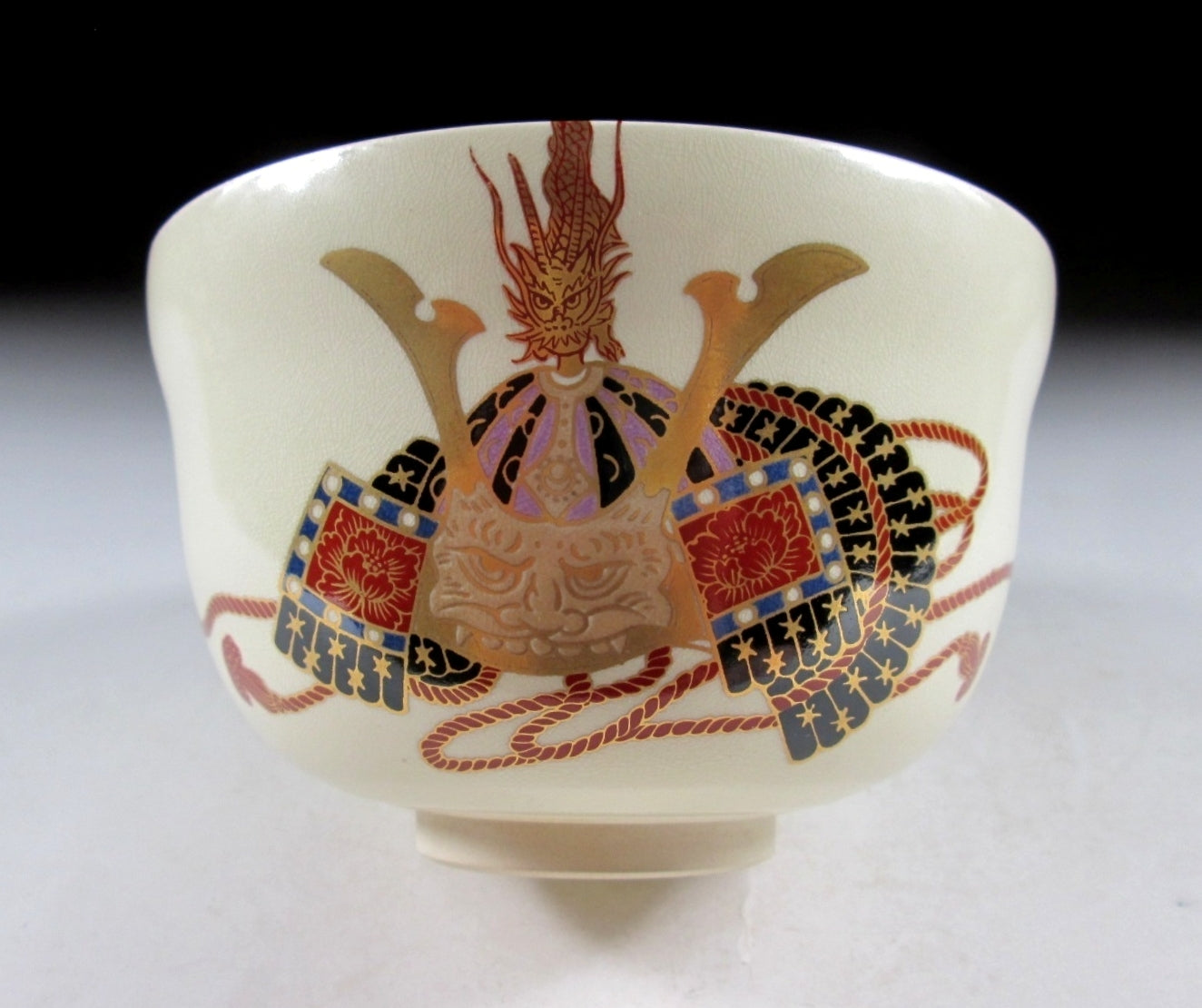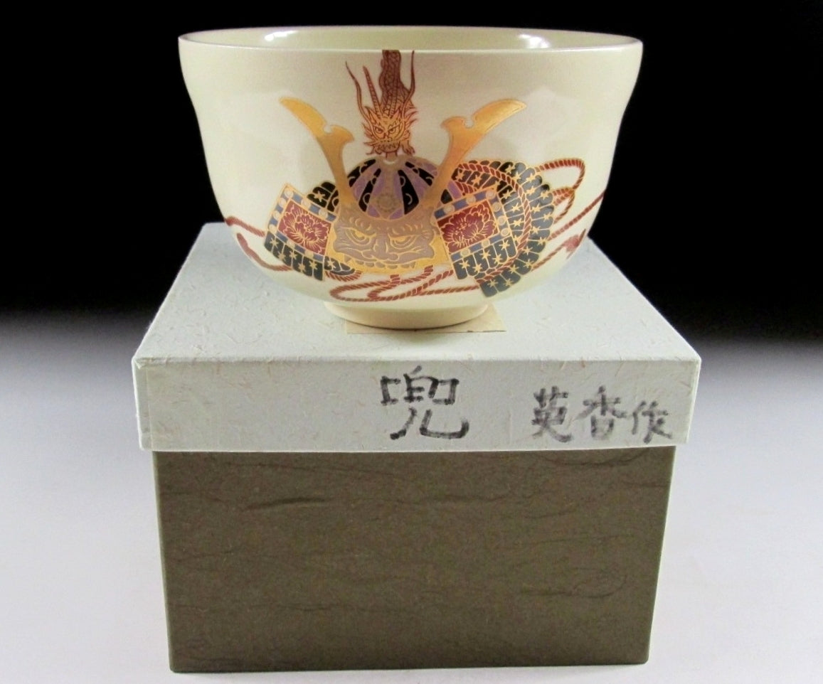 This listing is for an attractive Kyo-ware chawan made around 20 years ago by noted potter, Miyaji Eika. It is wheel-thrown and decorated with a beautifully detailed Kabuto helmet. Miyaji is very well known for his exquisite Ninsei style paintings, and this is yet another fine example of his work. This chawan was most likely made to coincide with Children’s Day celebrations. Children’s Day is celebrated on May 5th all over Japan. It is a day set aside to celebrate children’s health and happiness. Traditionally the day was just for boys, and families with at least one son would display kabuto and wish for their health and prosperity. During the Edo period this day was to encourage boys to become courageous like samurai. Miyaji’s stamp can be found on the bottom, and it comes with its original paper box.