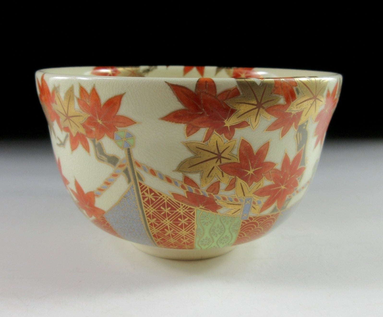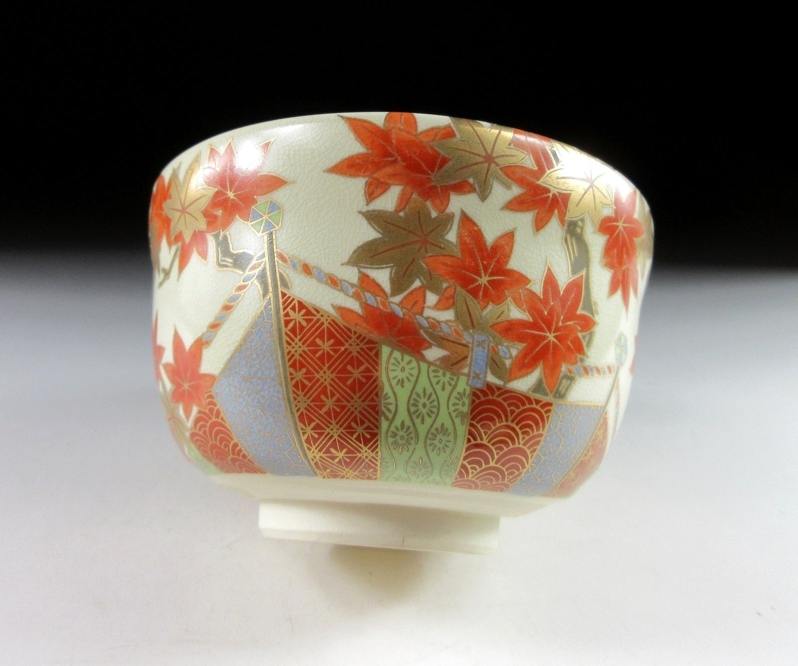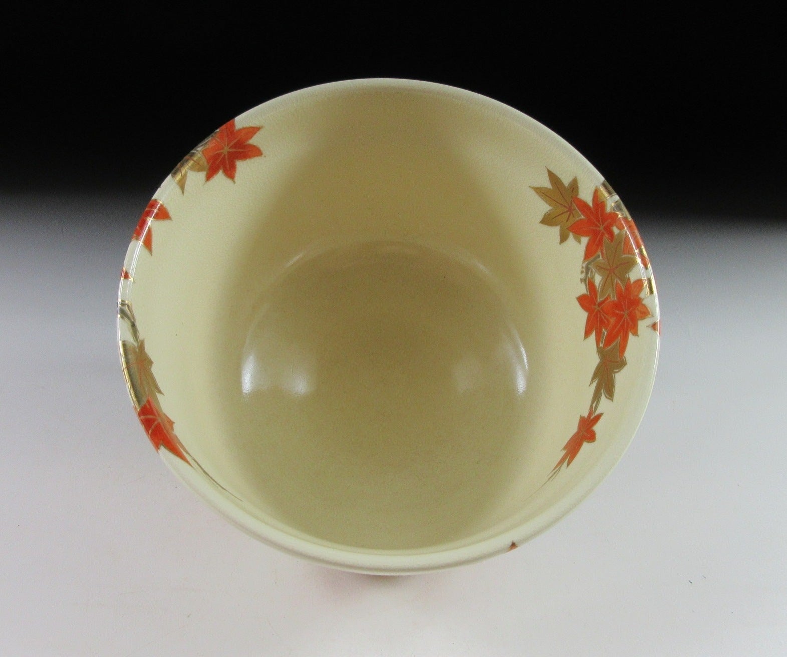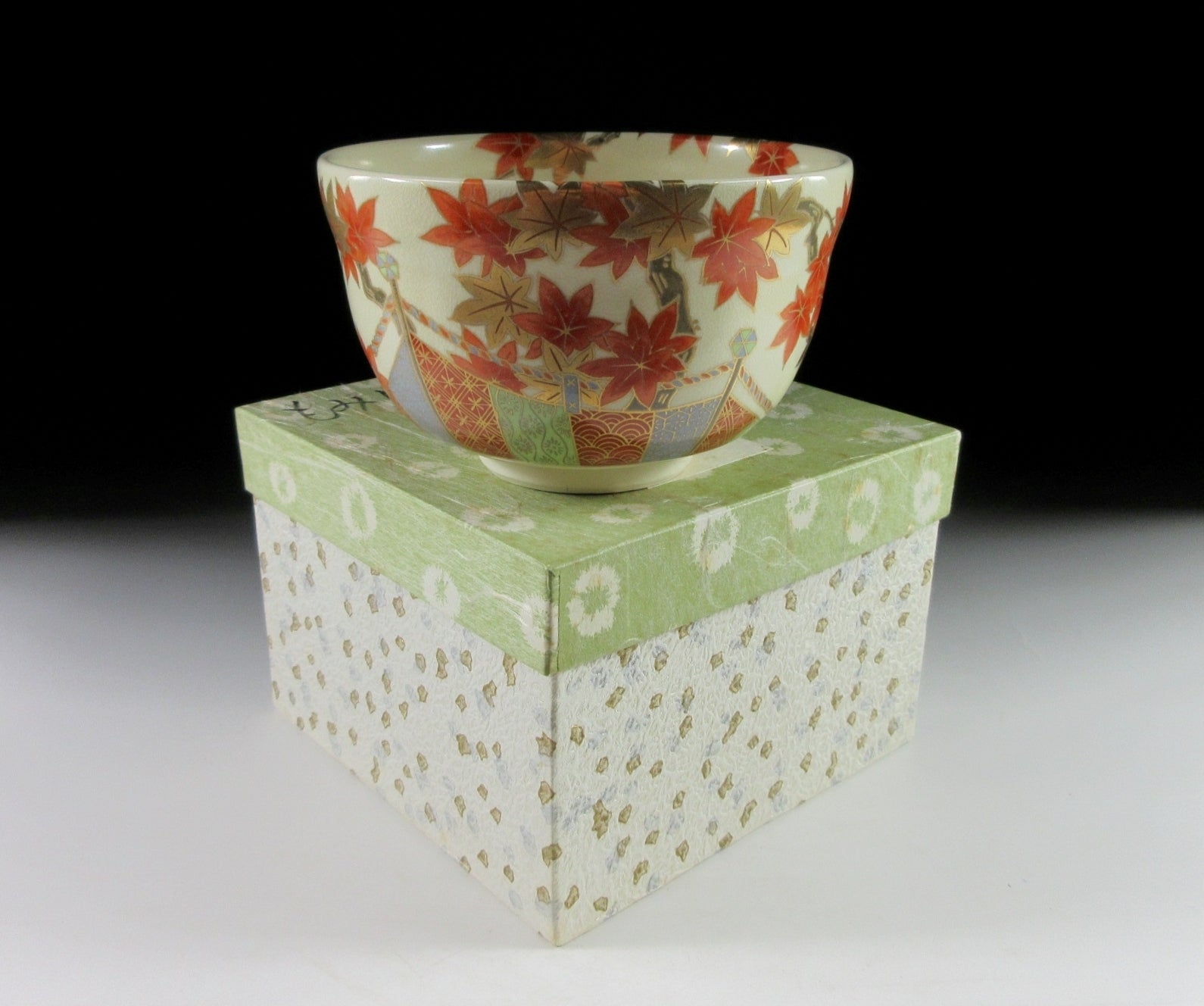 This listing is for a Kyo-ware chawan made by Miyaji Eika, and the paper box is dated Showa 61 (1986). It is wheel-thrown and made of high-fired stoneware. The decoration is Miyaji’s interpretation of Ninsei’s ‘momiji-gari’ chawan dating back to the Edo Period. Momiji-gari means autumn leaf viewing, both Ninsei’s work and the chawan in this listing depict a momiji-gari scene described in the Heian Period novel ‘The Tale of Genji’. Genji is not shown, the focus is on the splendid scenery during that particular occasion. This is a beautiful and vibrant piece ideally suited to serving thin tea. The stamp of the potter can be found on the bottom, and it comes with its original paper storage box.